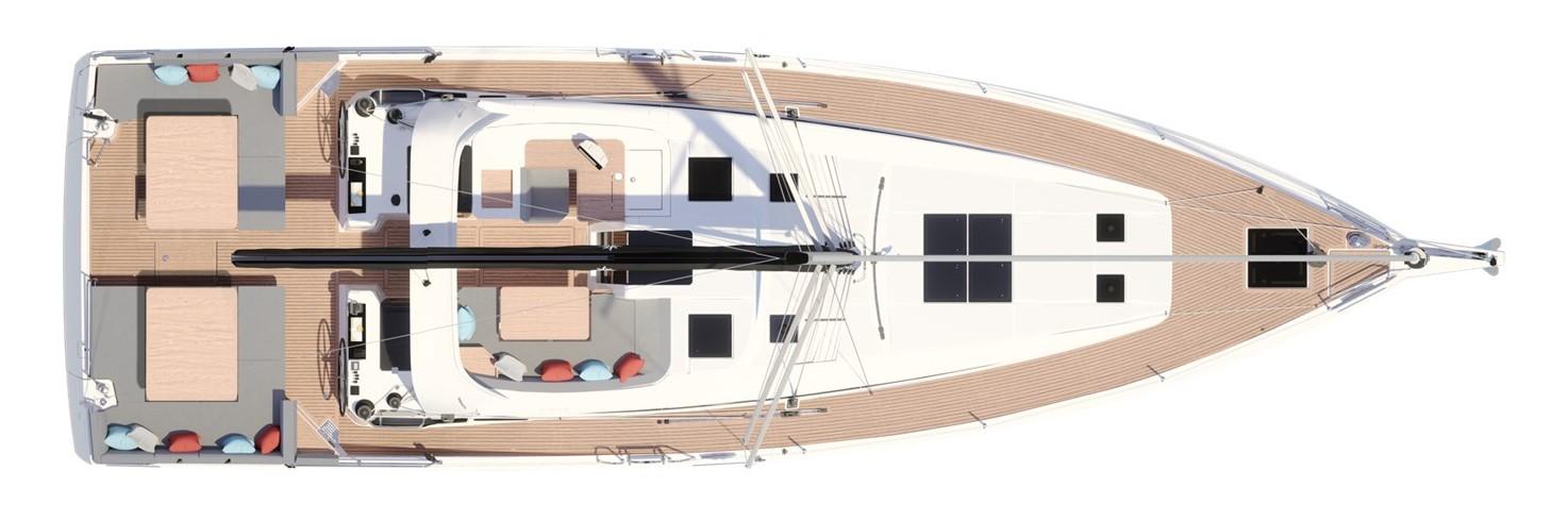 l'avant du cockpit accueille le double poste de barre et une table à cartes extérieure. Il est protégé par un large pare-brise et une capote rigide, pour une bonne visibilité en navigation.