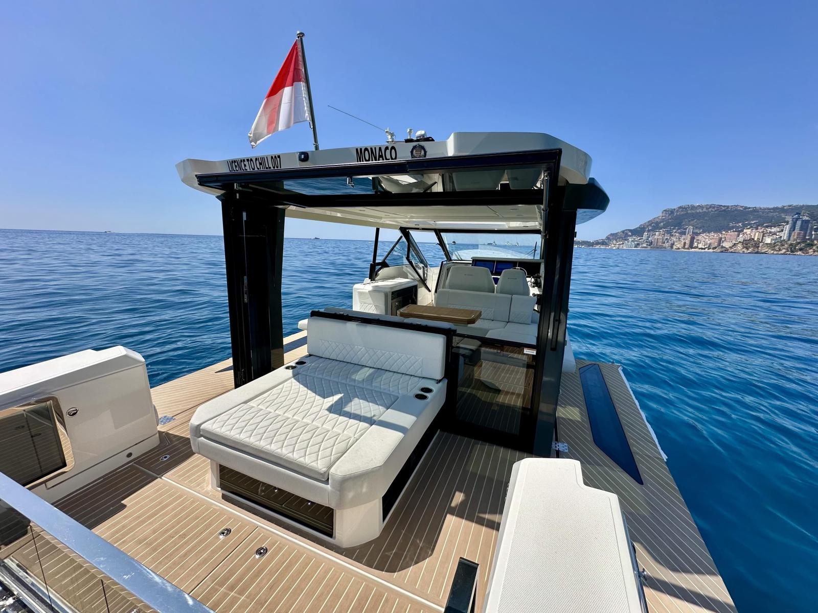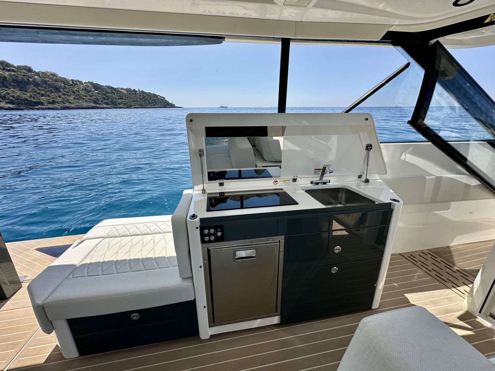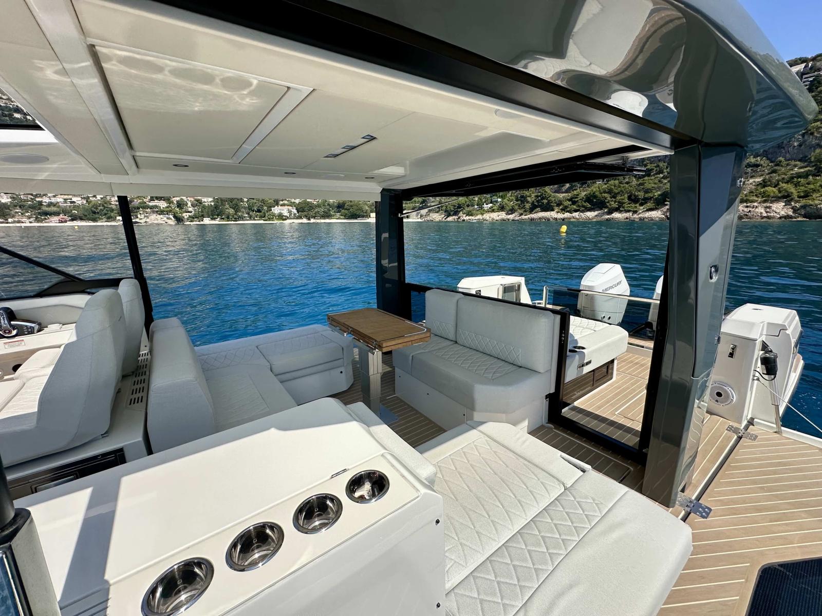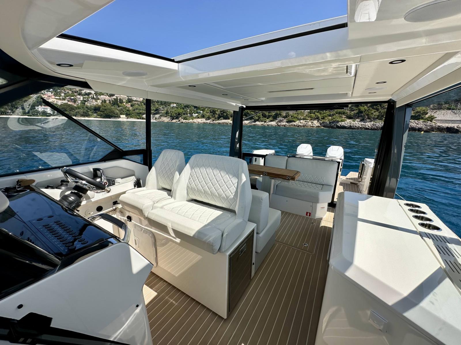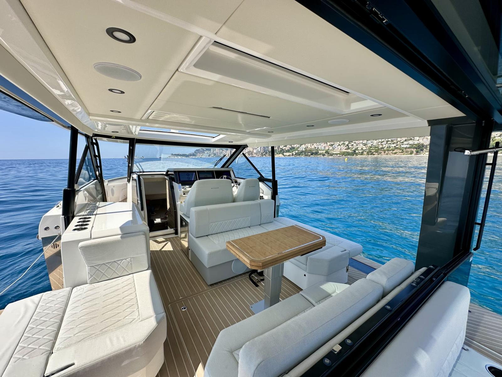 L’aménagement extérieur se distingue par la présence de deux balcons latéraux déployables, d’un pare-soleil rigide ouvrant électriquement, d’une porte vitrée arrière et d’un sol recouvert de Flexiteek. L’espace cockpit est convivial, modulable avec des banquettes convertibles en bain de soleil, une table rétractable, et un coin salon avant accueillant jusqu’à six personnes.