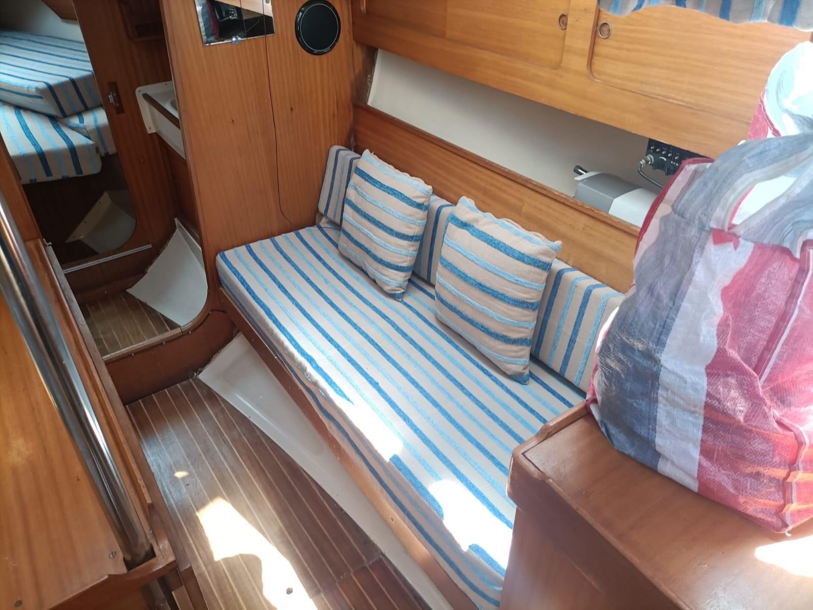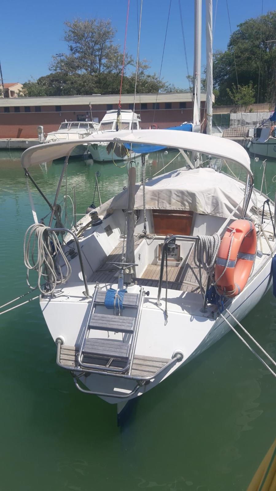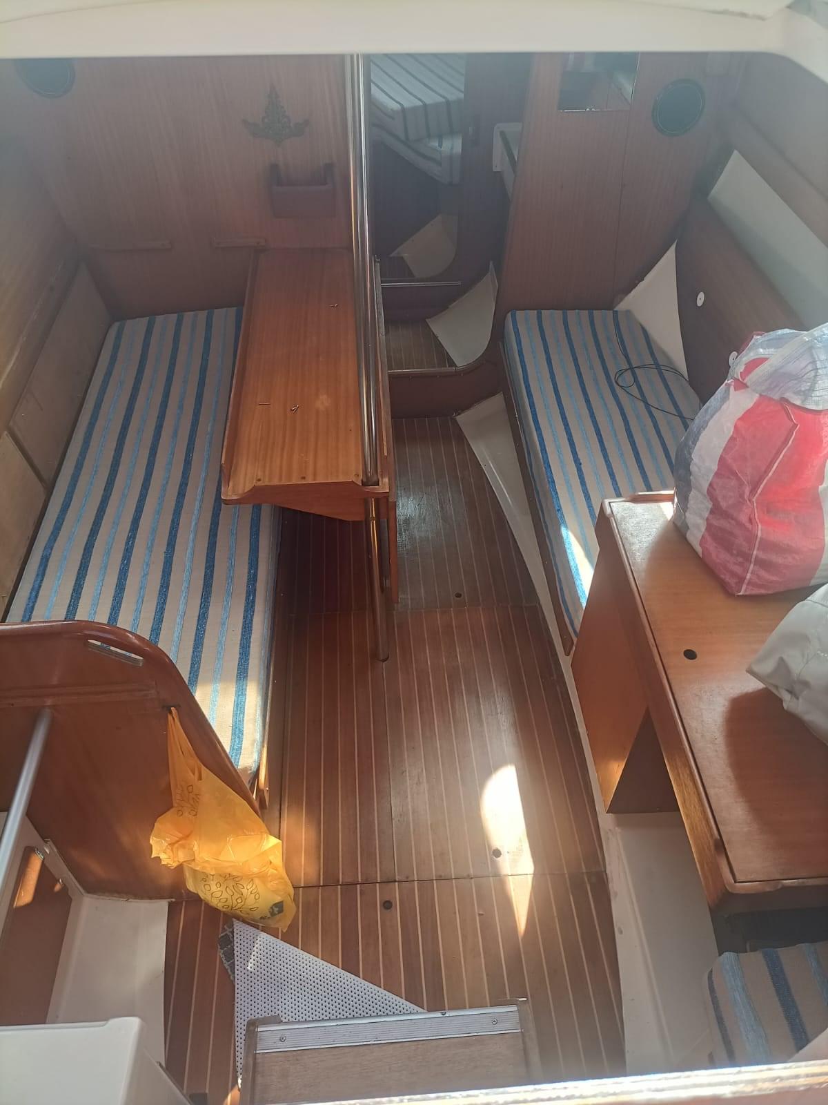 Particularités: - rollaranda (sur la flèche) et jb roll - moteur Yanmar de 28 CV avec quelques heures de mouvement (la norme est de 14 CV), double filtre à gasoil - coque : traitement anti-osmose sur site, avec vérification technico-instrumentale spécialisée sur la fibre de verre et les broches d’ampoule ; nouvelles vannes de coque, nouveau cockpit en teck - Instrumentation electr. Wind + Echo Sounder + Autopilot + Prise de terre - 6 couchettes, coussins de lit totalement neufs, réfrigérateur - Nouveau gennaker avec chaussette - 2 hélices : une avec deux pales fixes, une avec trois pales fermables - Toilette marine à décharge électrique