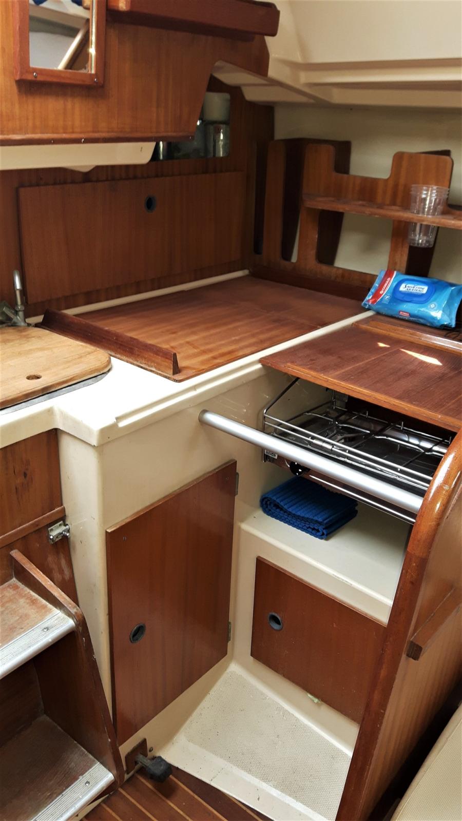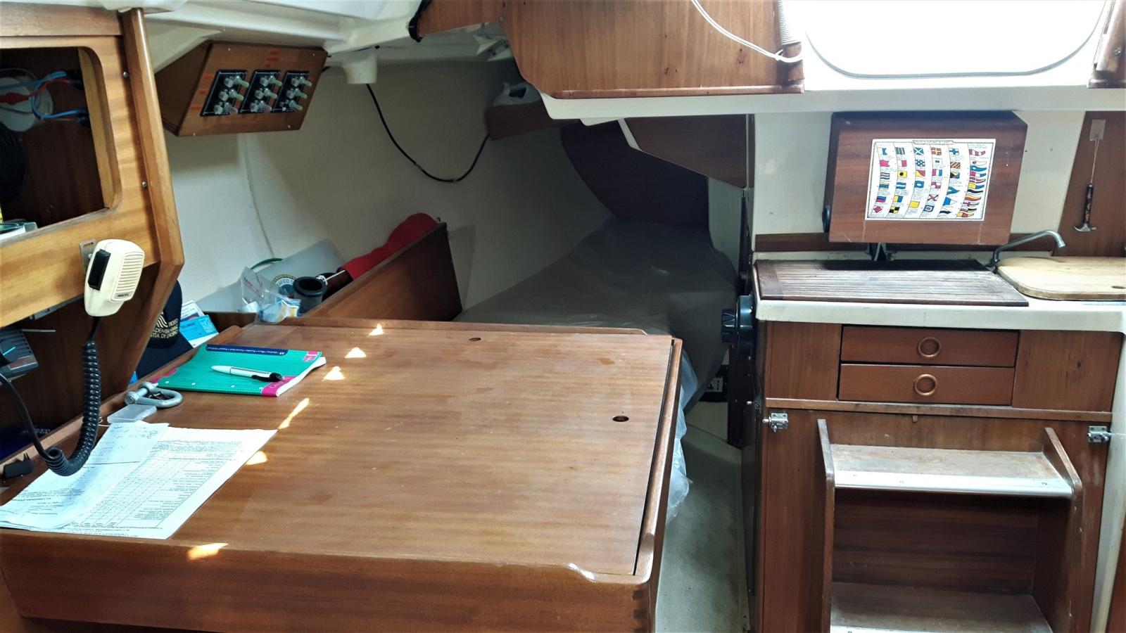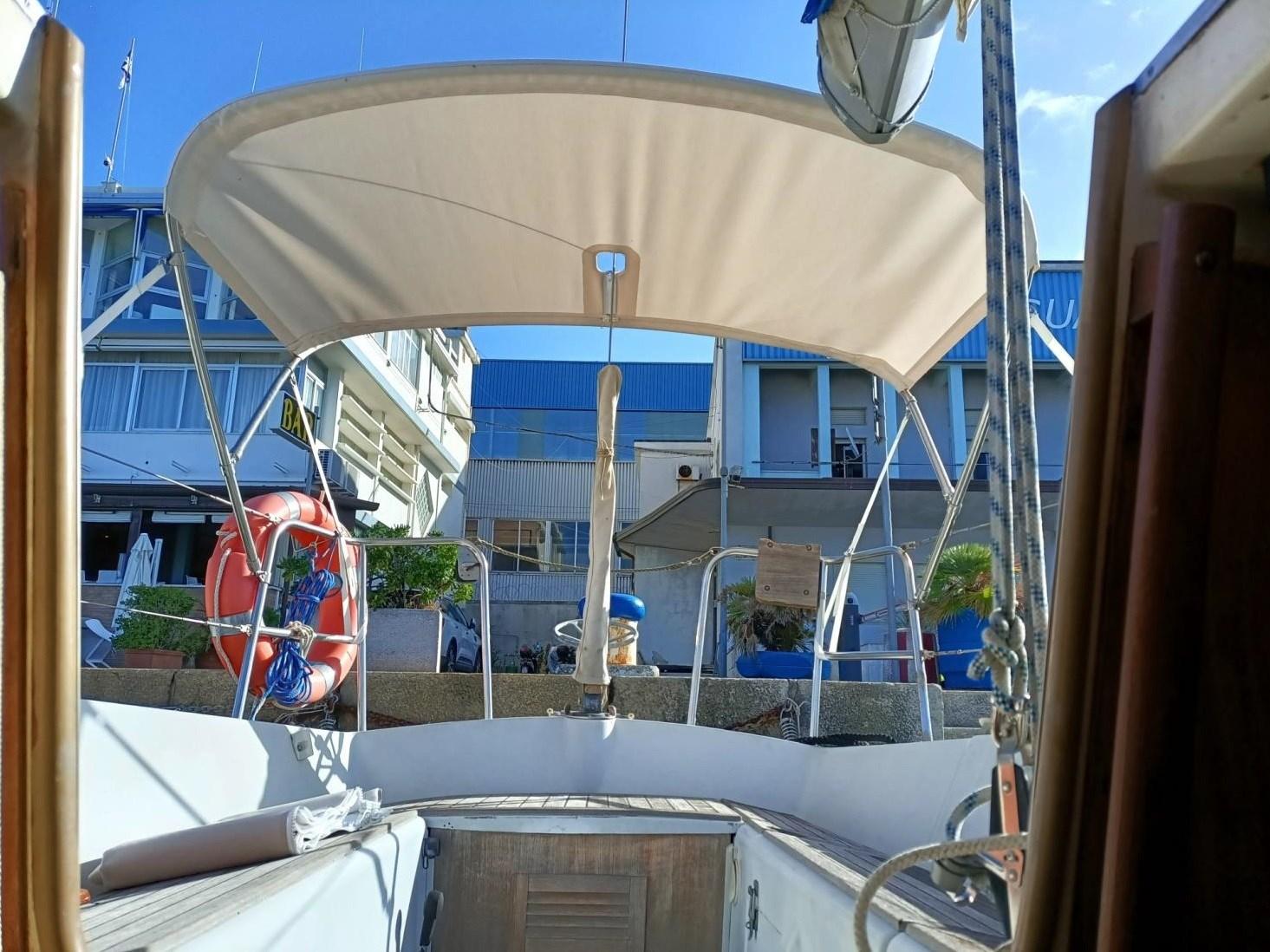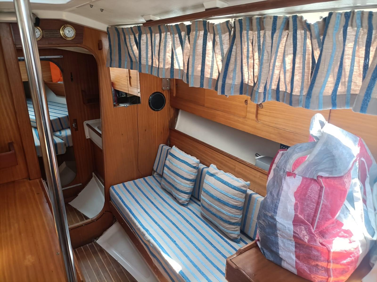 Particularités: - rollaranda (sur la flèche) et jb roll - moteur Yanmar de 28 CV avec quelques heures de mouvement (la norme est de 14 CV), double filtre à gasoil - coque : traitement anti-osmose sur site, avec vérification technico-instrumentale spécialisée sur la fibre de verre et les broches d’ampoule ; nouvelles vannes de coque, nouveau cockpit en teck - Instrumentation electr. Wind + Echo Sounder + Autopilot + Prise de terre - 6 couchettes, coussins de lit totalement neufs, réfrigérateur - Nouveau gennaker avec chaussette - 2 hélices : une avec deux pales fixes, une avec trois pales fermables - Toilette marine à décharge électrique