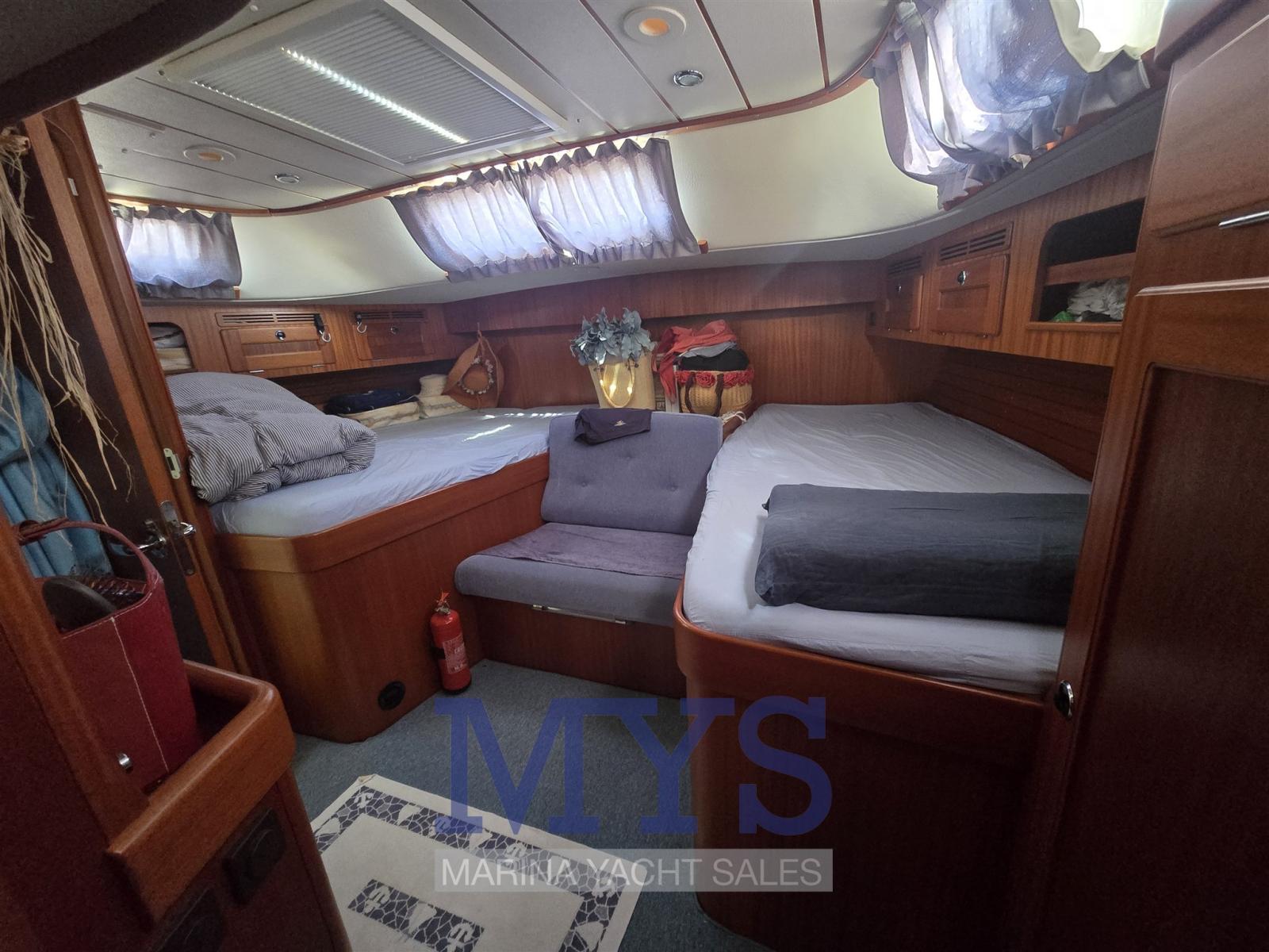 Cabine propriétaire à l’arrière avec 2 lits, un double et un simple avec fauteuil séparant les lits, salle de bain privative avec garage séparé et WC électrique