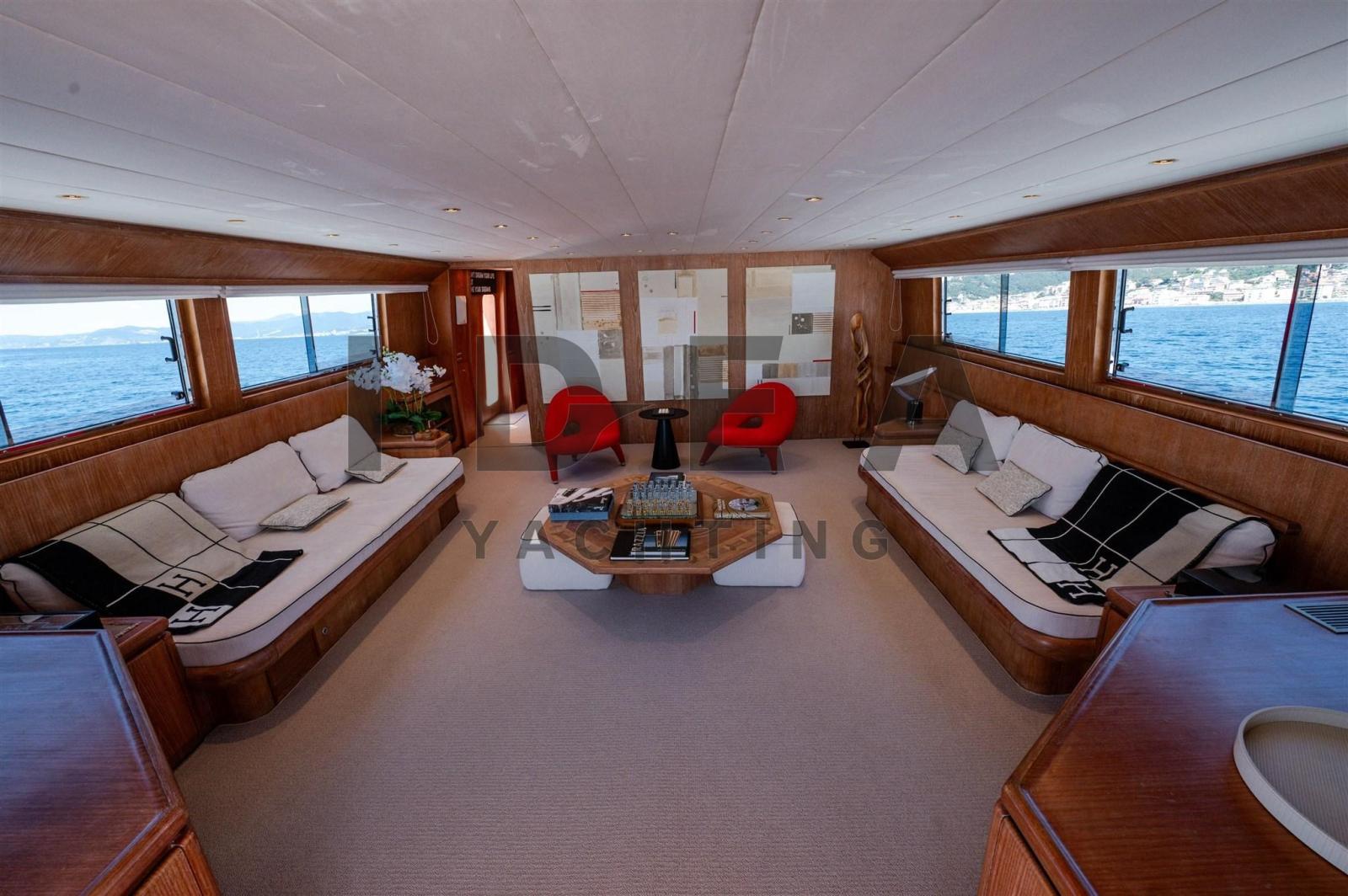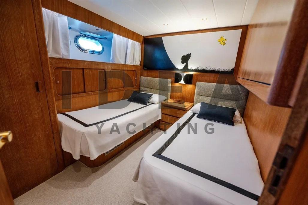 Le pont inférieur offre un aménagement luxueux et fonctionnel, fini en teck poncé et en moquette. La cabine principale dispose de vastes armoires, d’un mobilier raffiné et d’un bureau dédié, tandis que la salle de bains privative comprend un double accès, une douche centrale et un coin meuble-lavabo avec rangement. À l’avant, deux cabines à deux lits jumeaux avec des lits pullman supplémentaires et deux cabines doubles avec des lits à la française, chacune avec salle de bains privative, assurent un hébergement suffisant pour les invités et l’équipage.