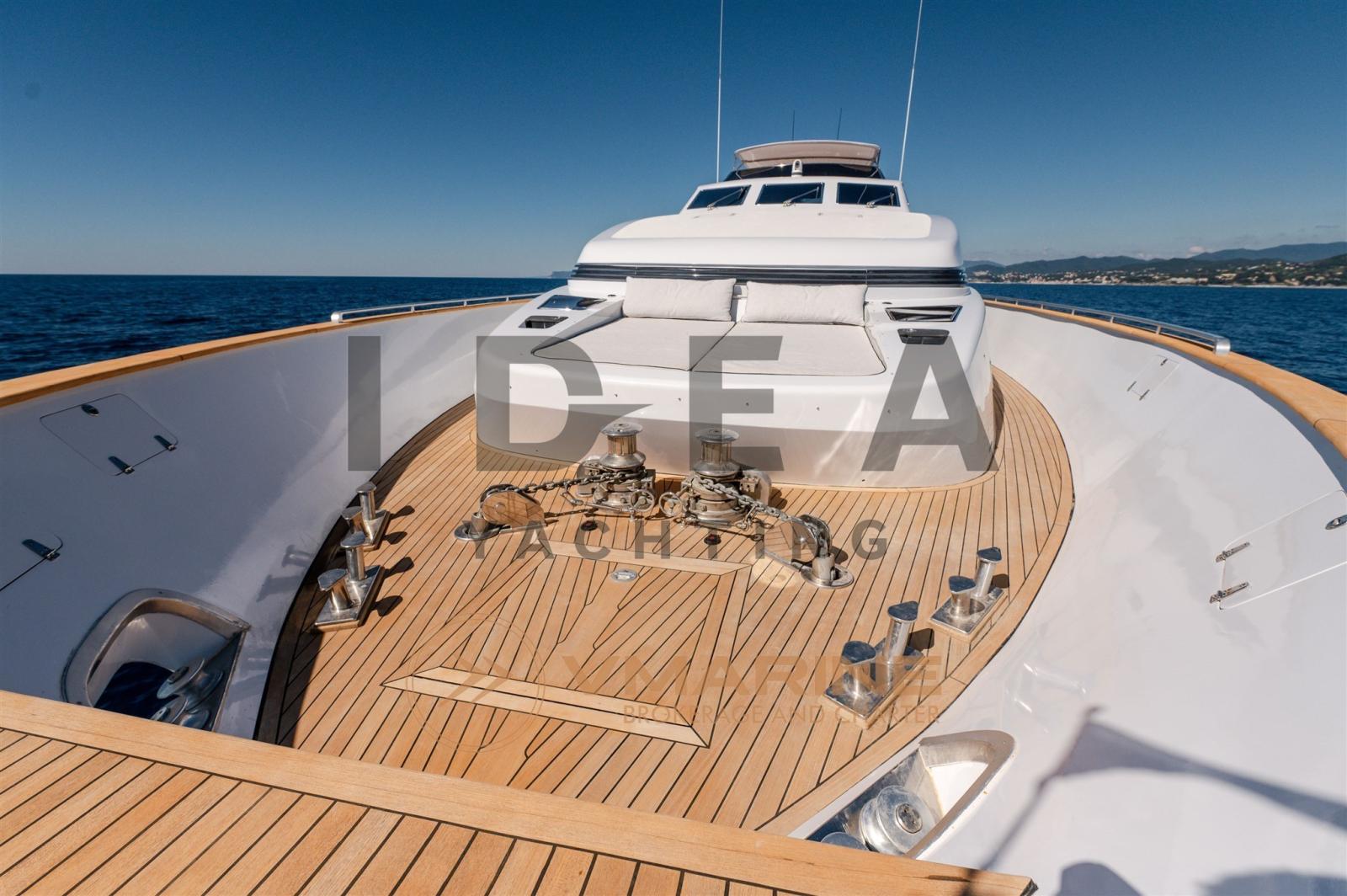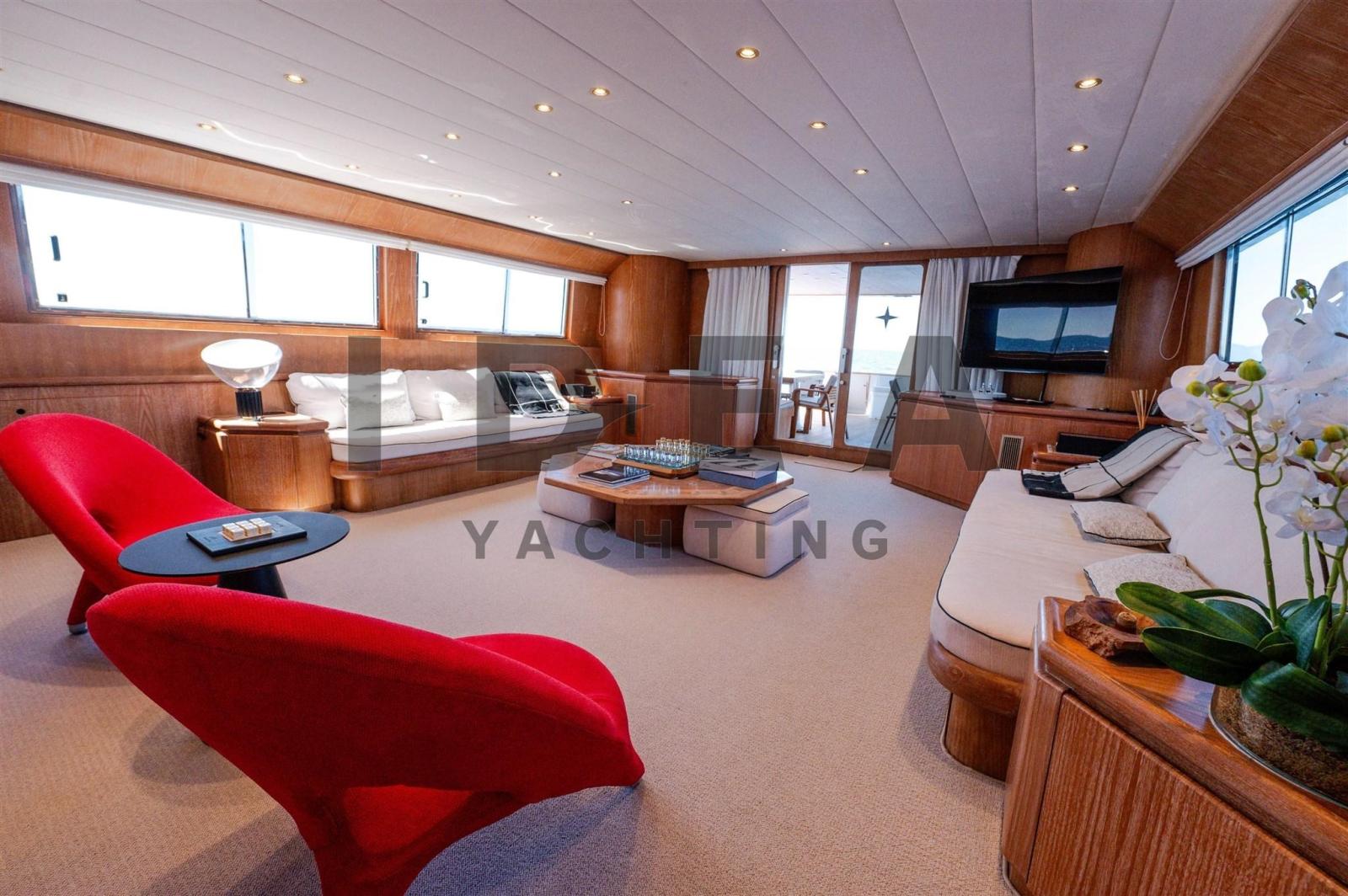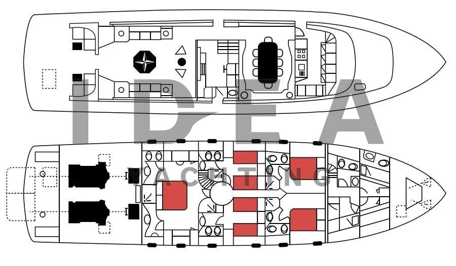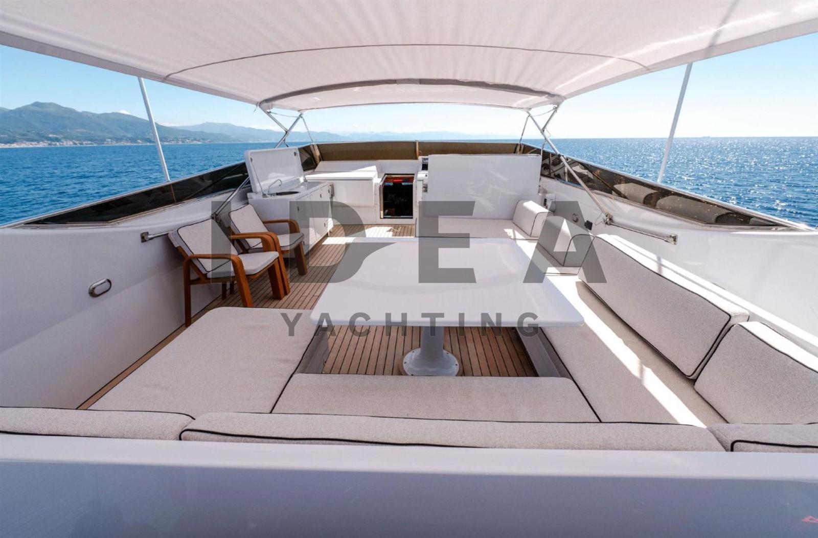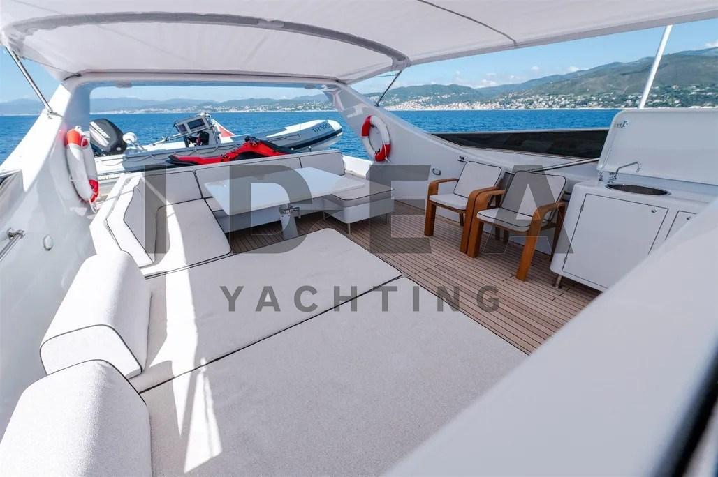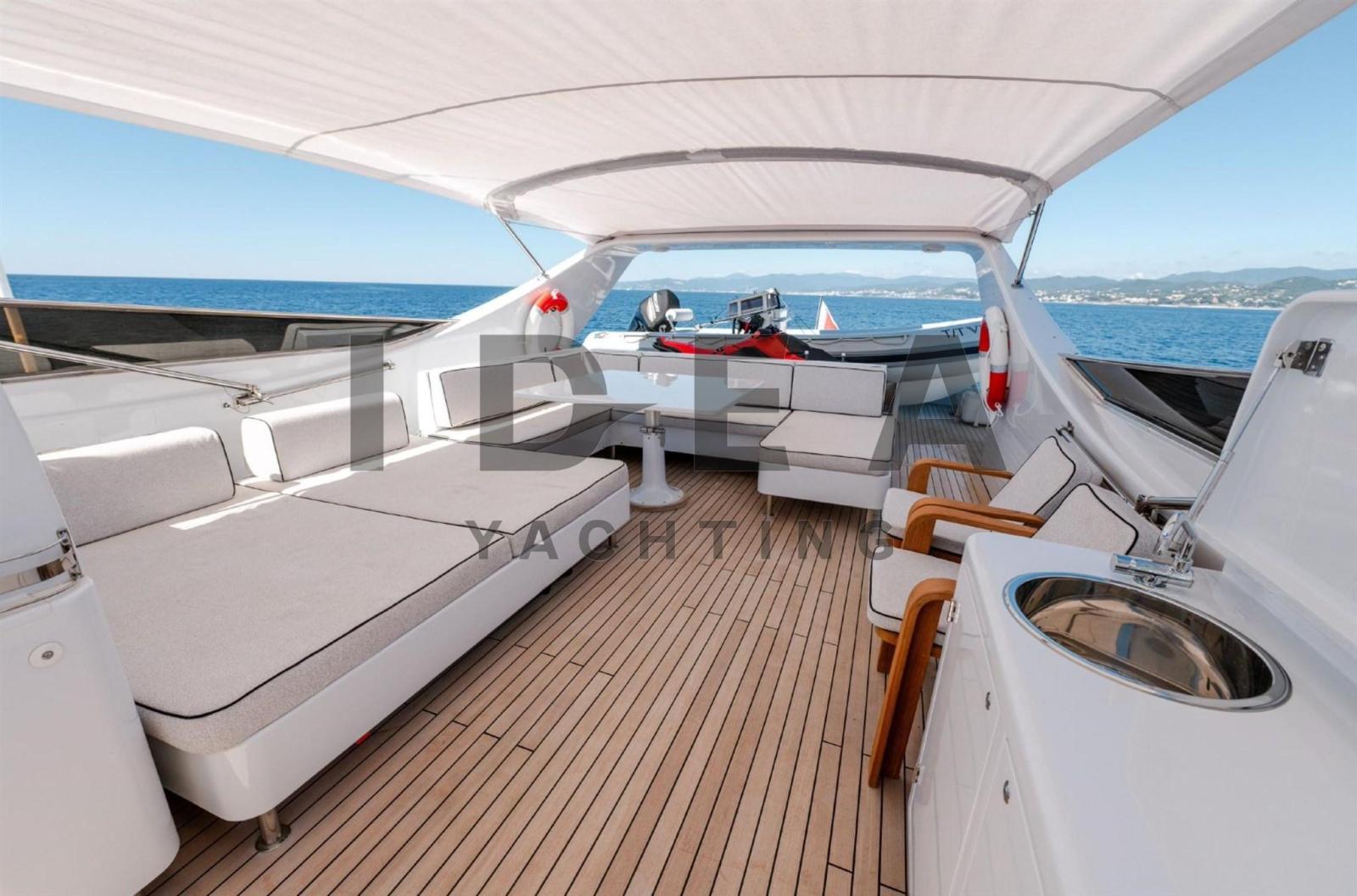Le yacht est soigneusement disposé sur trois ponts. La passerelle arrière s’ouvre sur un cockpit spacieux avec une salle à manger abritée, idéale pour recevoir des invités. De larges passerelles latérales protégées avec des pavois robustes mènent à la terrasse avant, dotée d’un grand canapé-lit qui s’étend sur la superstructure avant. Une porte tribord permet d’accéder à la salle des machines, tandis qu’une entrée au milieu du navire mène à une salle de bain de jour pratique. Le vaste flybridge, qui couvre plus de 50 mètres carrés, offre un poste de pilotage secondaire, une dinette élégante avec des canapés et des fauteuils, des bains de soleil supplémentaires et une zone de service dédiée équipée d’une grue pour le stockage des annexes et des jet-skis.