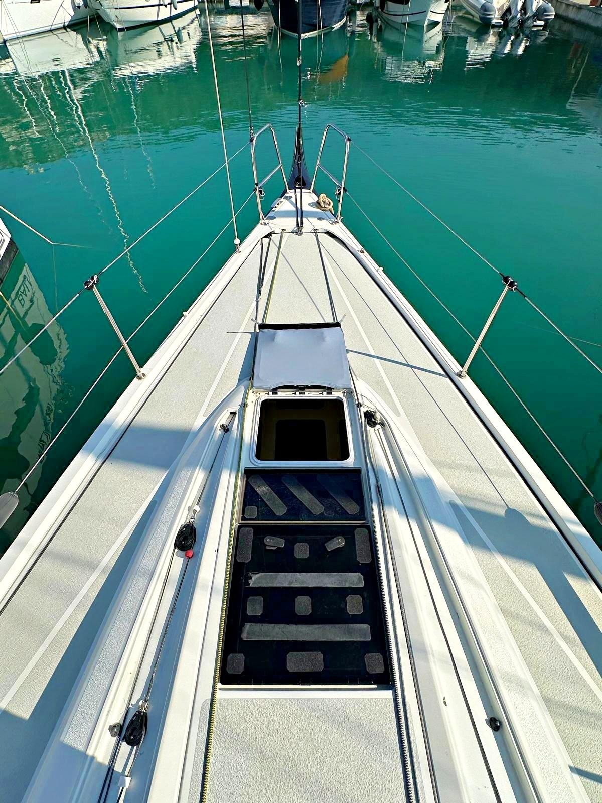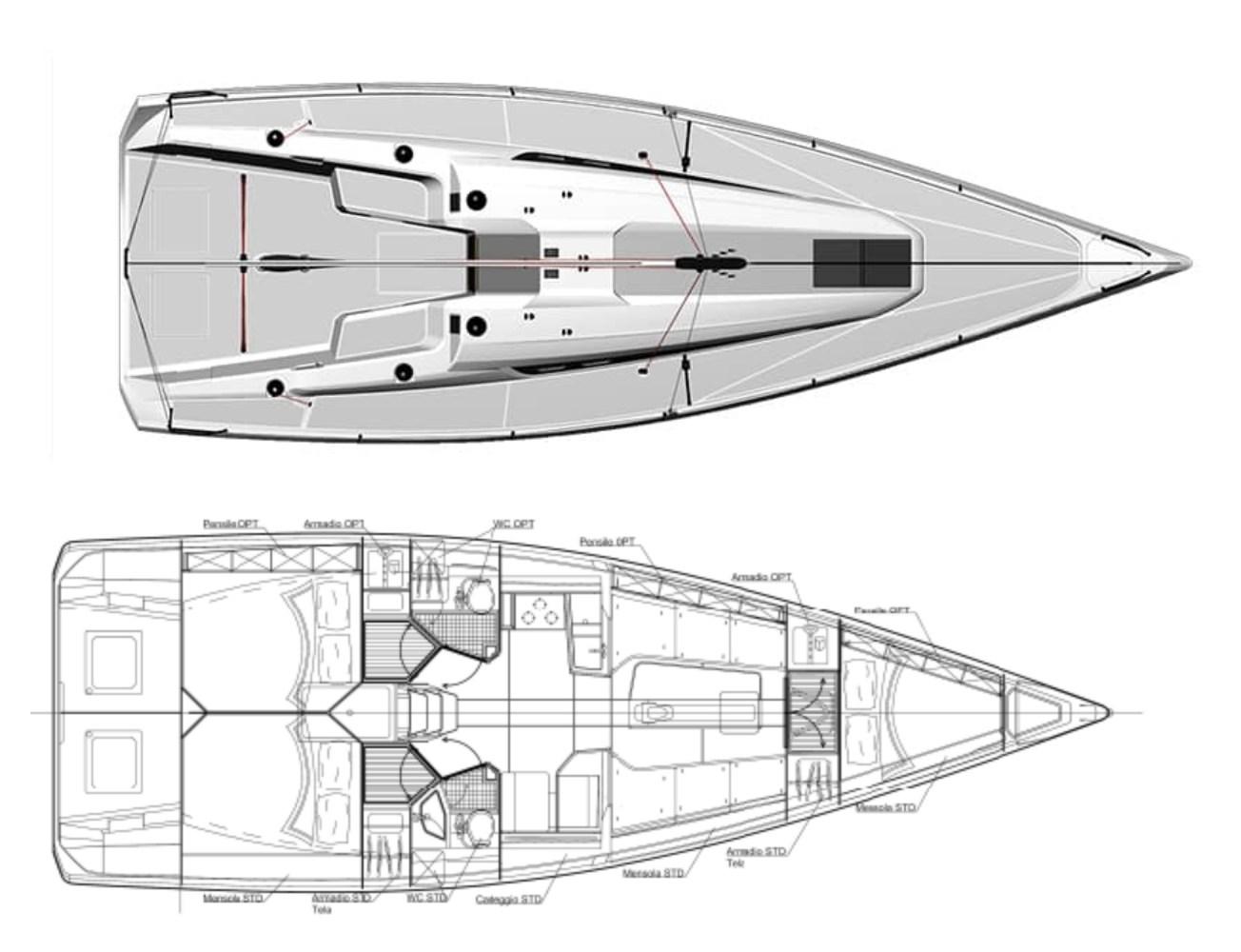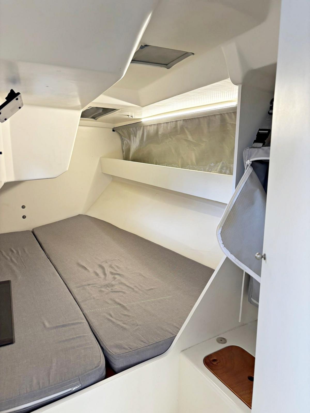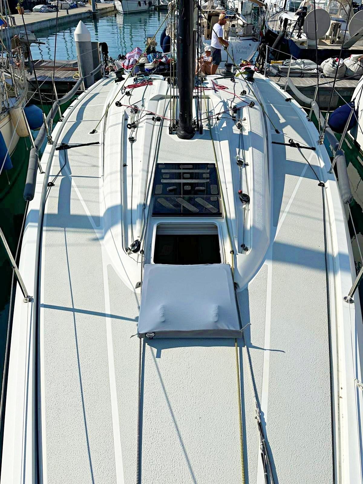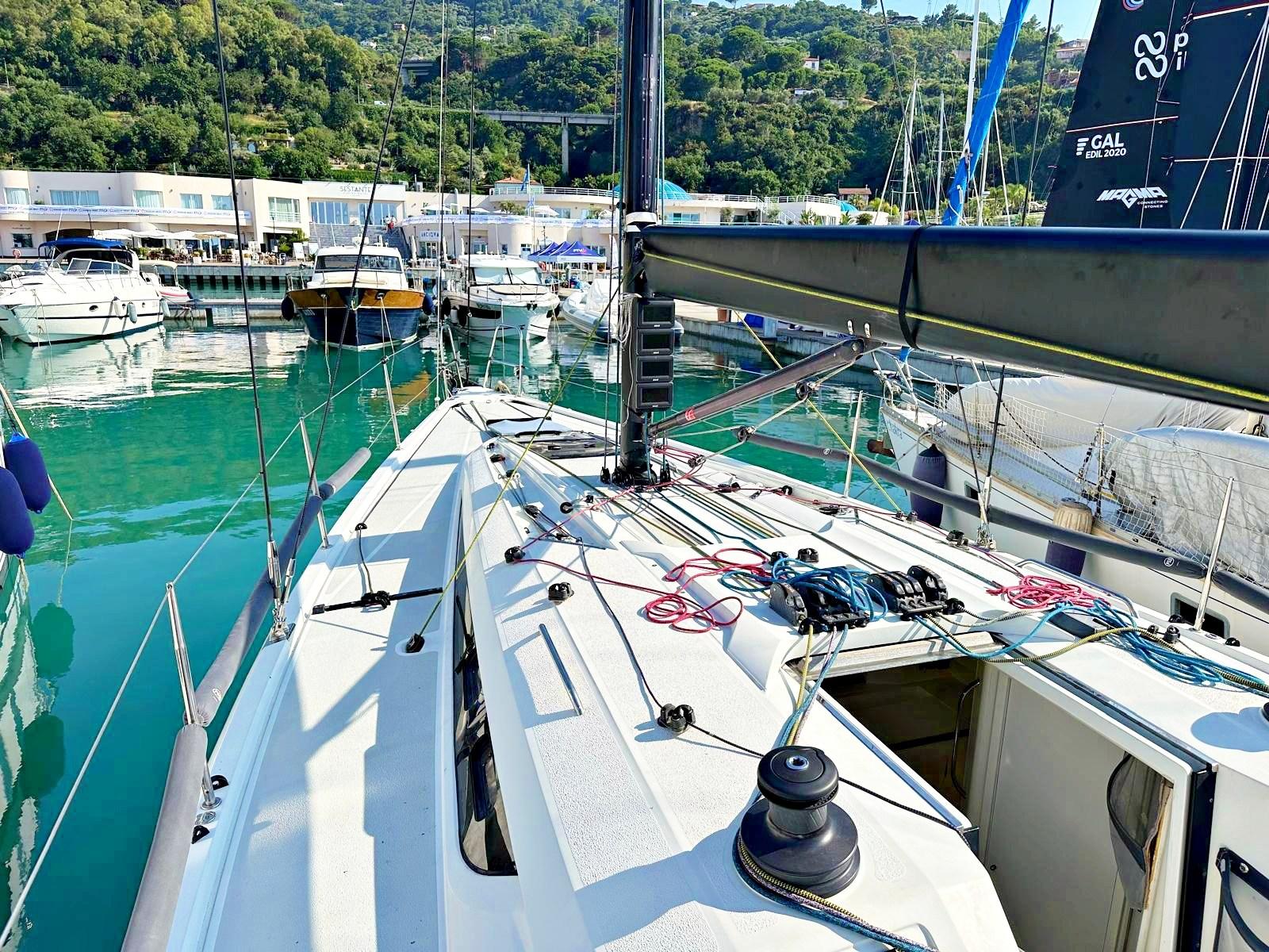 3 cabines, 2 salles de bains, 1 toilette manuelle, dinette avec coin carte et cuisine. Instrumentation complète B&G H5000 avec répétiteurs de mât. Échauffement Webasto. Bôme en carbone, mât en carbone, nouveaux haubans en carbone EC3 Southern Spars 2025, pataras en textile avec roue magique et étai PBO, vérin hydraulique pour étai avec unité de commande et pompe manuelle dans le cockpit Bamar, nouveau guindant en tuf 2025, mât de spi en carbone, le plus long nouveau dolphin en carbone 2025. Écoutes et drisses Gleinstain Dyneema® neuves 2025, treuil Harken Performa à haute adhérence. Motoculteur en carbone. Nouvelle ampoule et aileron en plomb entièrement optimisés fabriqués CNC 2023. Gouvernail neuf 2023 et 2025 optimisé. Allègement intérieur 2025 : Remplacement de toutes les trappes par des trappes en toile. Re-silicone de tout l’équipement de pont 2025. Équipement de sécurité pour les régates ORC de catégorie 3.