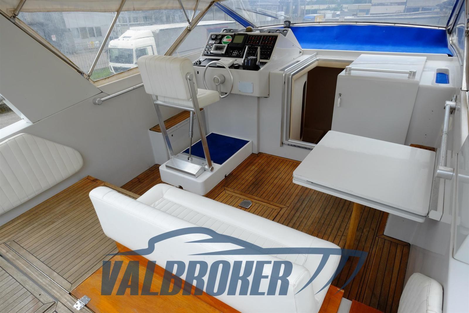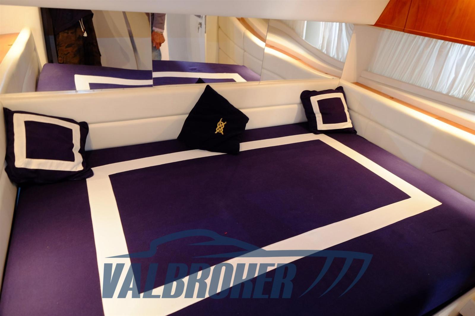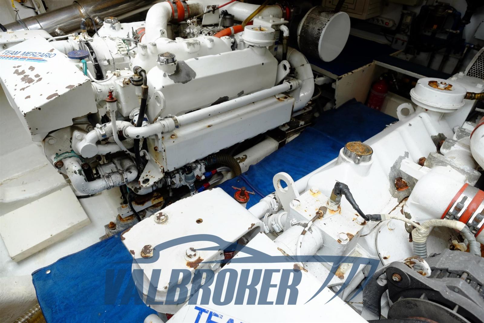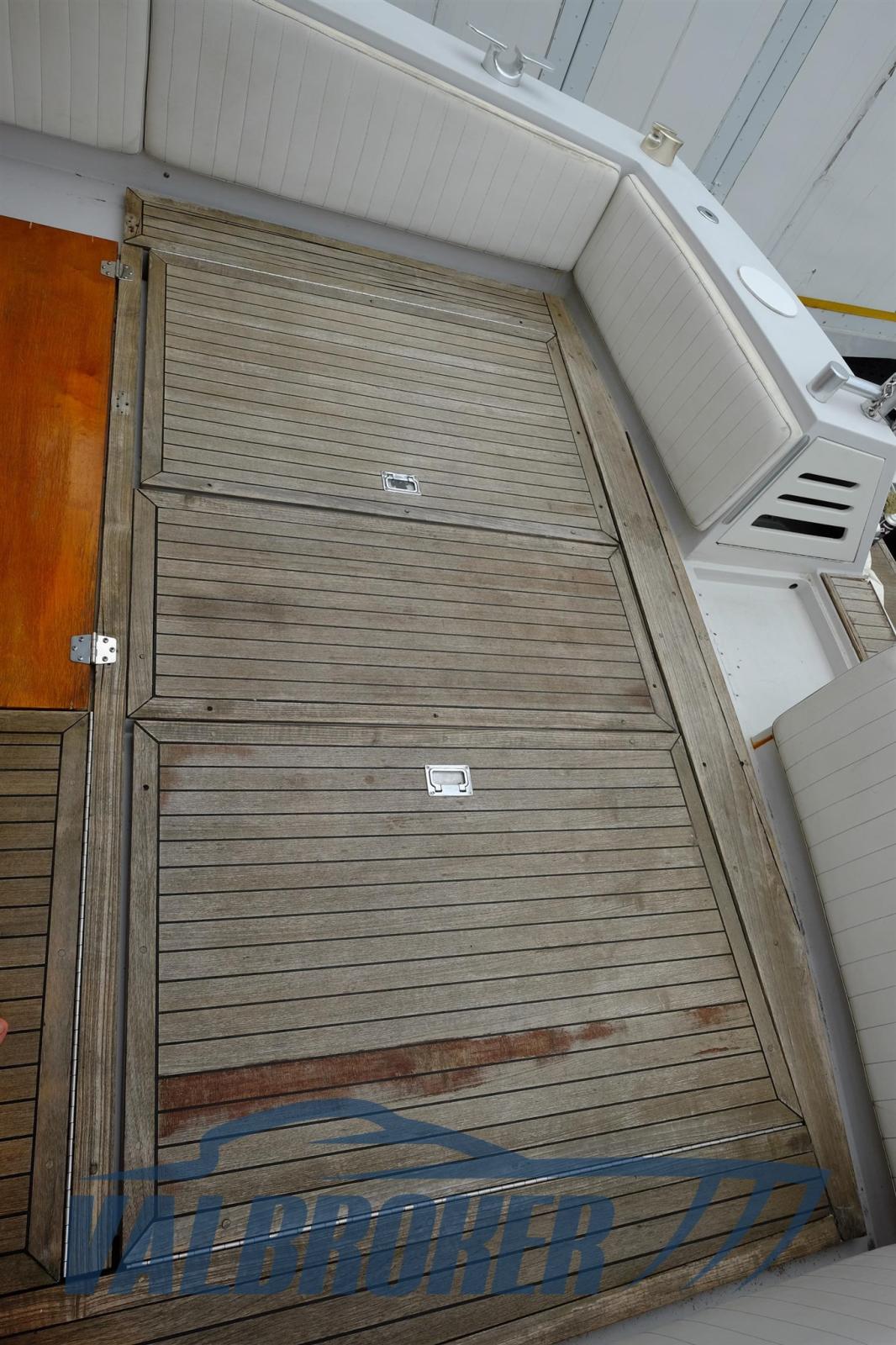 Tecnomarine C 42, moteur Cummins 2X 320 Hp, transmission par ligne d’arbre. Grand cockpit en teck. Cabine avec lit double (avec lattes de bois) à l’avant.