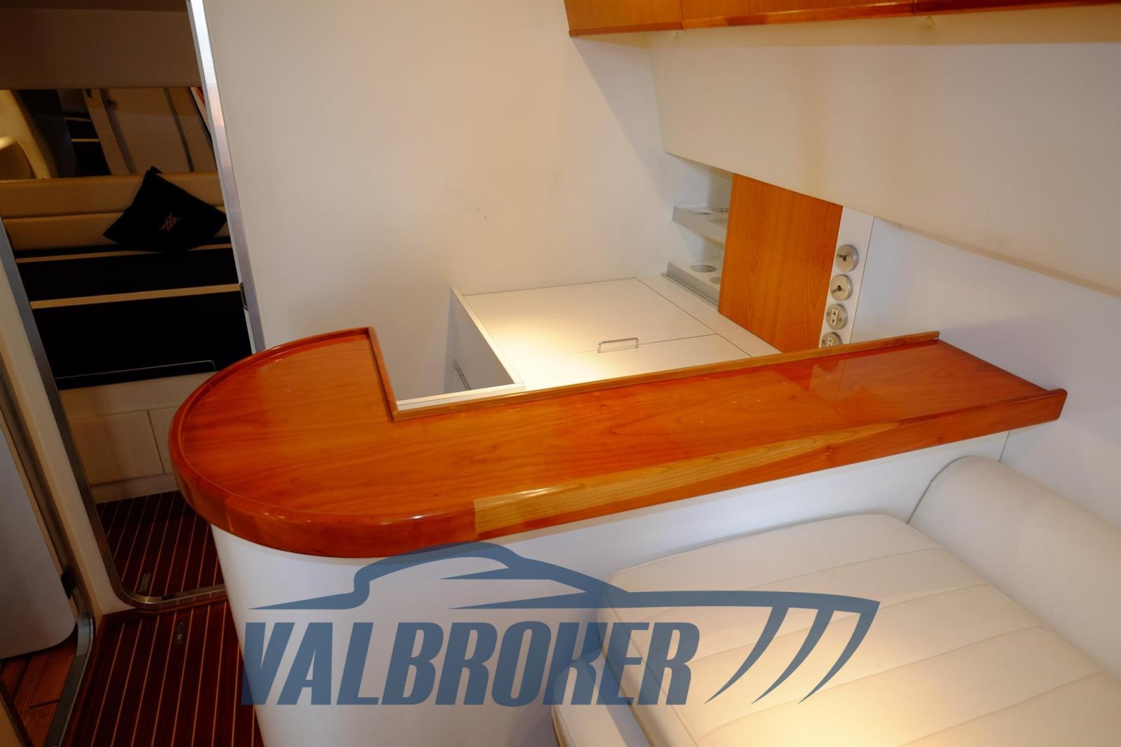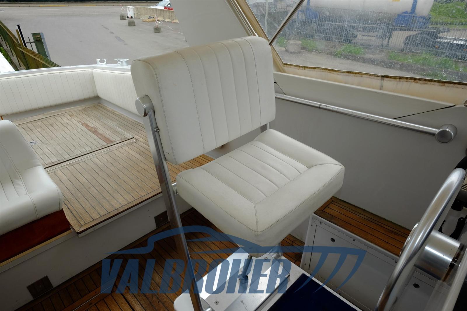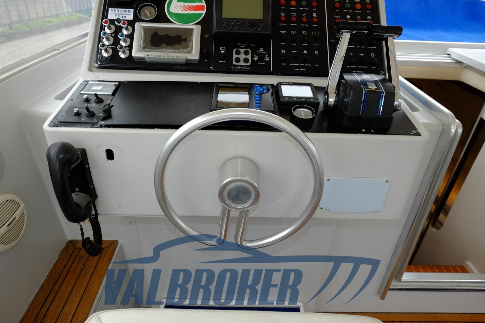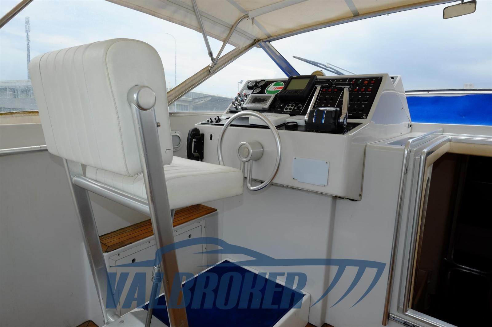 Tecnomarine C 42, moteur Cummins 2X 320 Hp, transmission par ligne d’arbre. Grand cockpit en teck. Cabine avec lit double (avec lattes de bois) à l’avant.