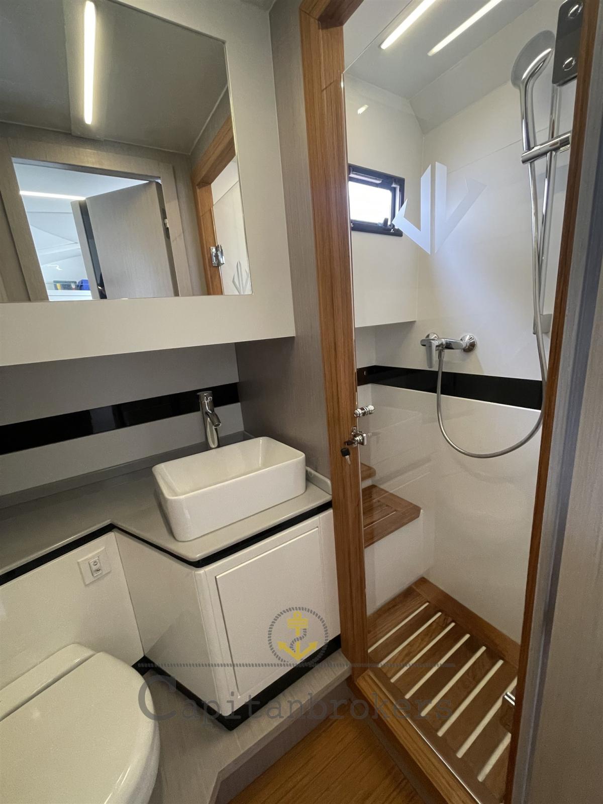 Alarme moteur, Alarme de pompe de cale, Eau sous pression, 5 Batteries (x 120 ah), Douche de cockpit, Propulseur d'étrave (AV max power ct80), Lavage de chaine, Plateforme arrière (idraulica up-down), Pompe de cale automatique, Pompe de cale manuelle, Cockpit en teck, Prise de quai, Guindeau électrique, Echelle de bain (in acciaio), table de cockpit.