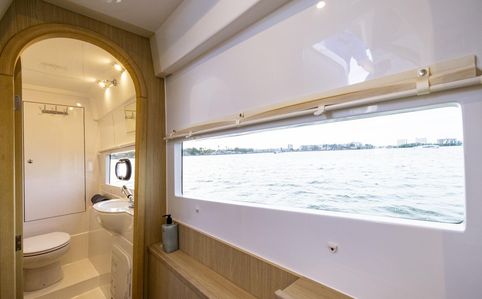 Cockpit et équipements : coin cuisine extérieur (wet bar), grand hardtop avec hublots ouvrants, sonorisation multi-zone Fusion, échelle de bain escamotable.