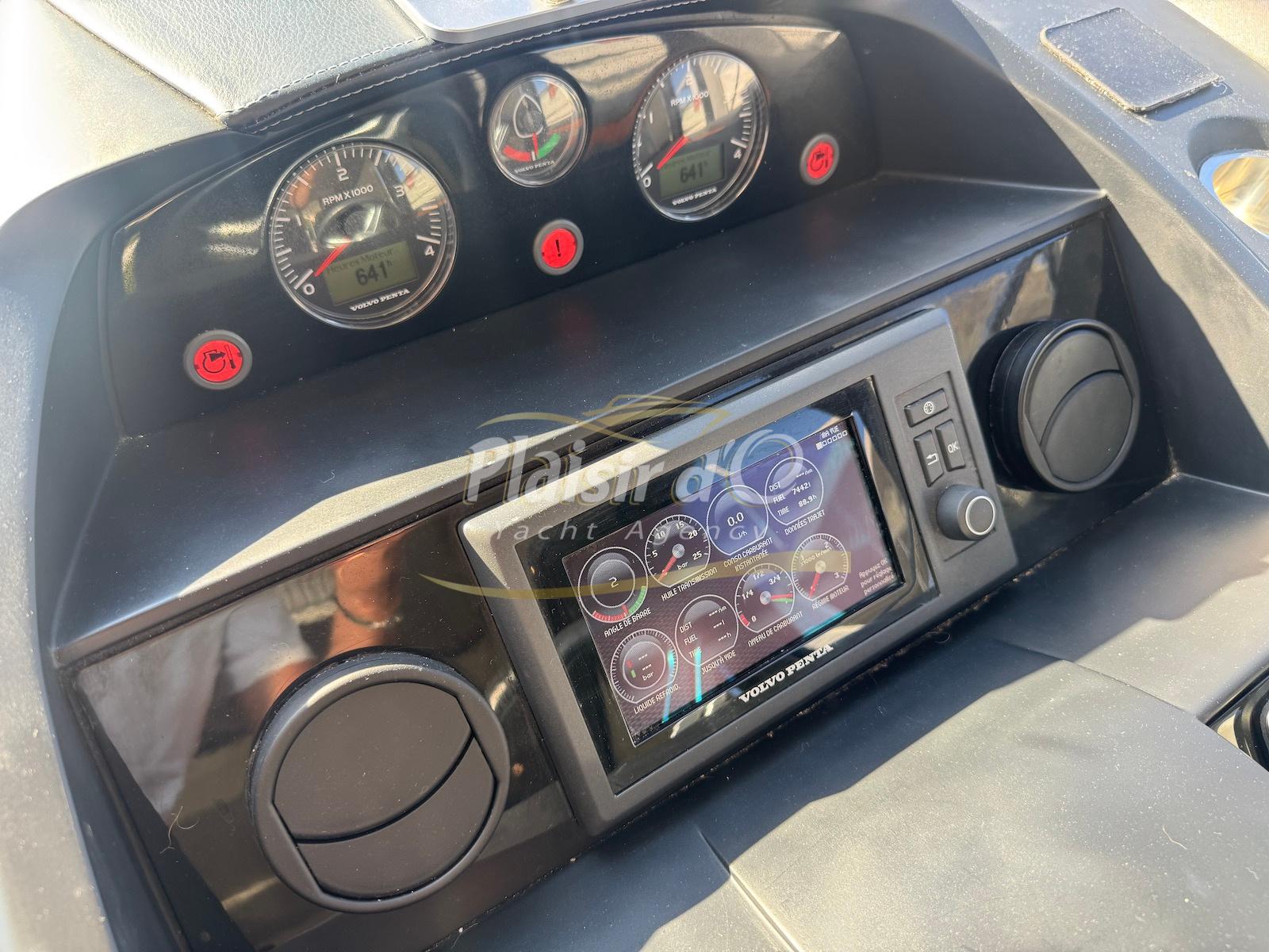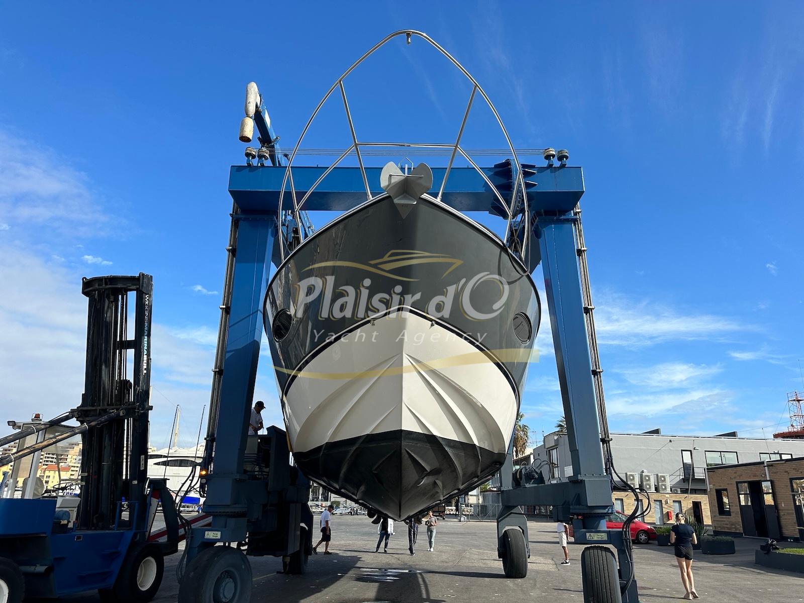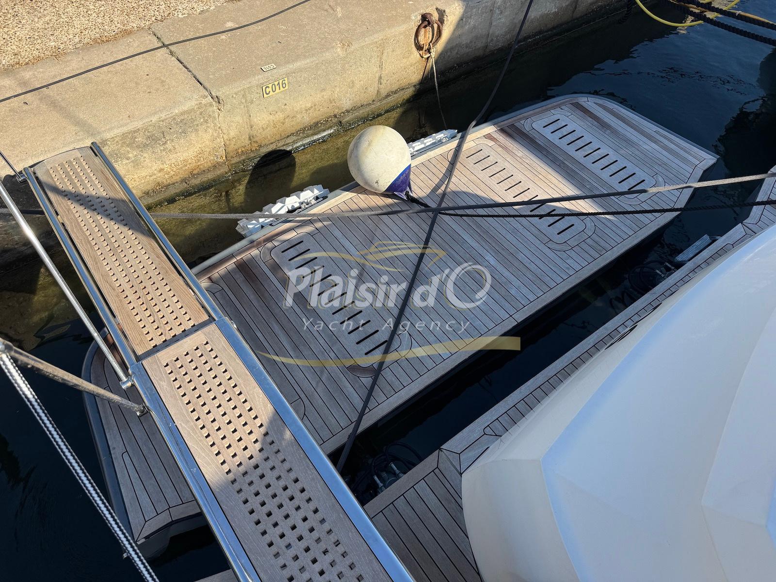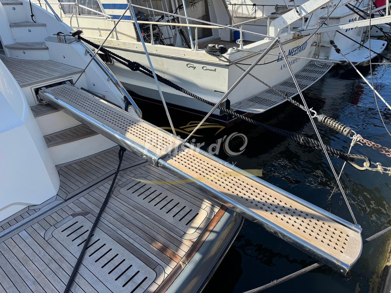 TOUTES OPTIONS : grosse motorisation Volvo Penta D13-900cv, yacht controller, Seakeeper, propulseur de poupe et de proue, climatisation reversible, désalinisateur, passerelle hydraulique rétractable, plate-forme de bain immergeable, générateur 11KW, GPS, radar, VHF, cockpit/plateforme de bain / pont en teck Refaits à neuf, peinture de coque récente, sellerie récente, 3 TV, machine à laver le linge, lave vaisselle, four micro ondes, peinture de coque récente , icemaker, store électrique, garage à annexe avec treuil électrique, flaps neuve, batterie service récentes …
