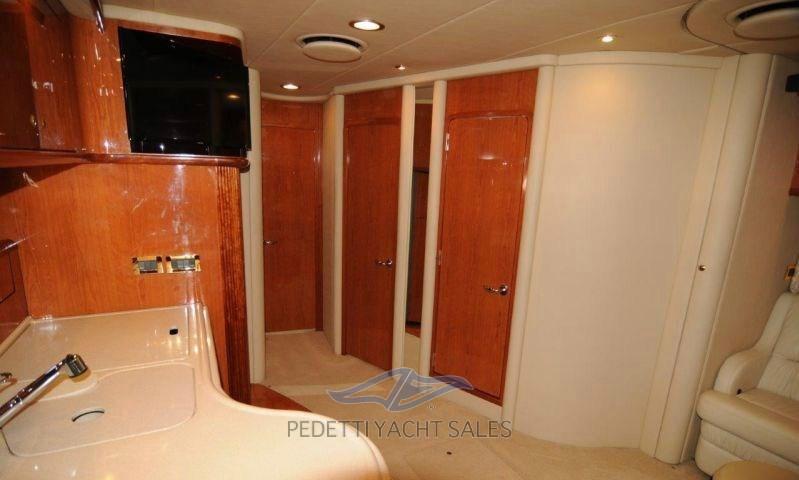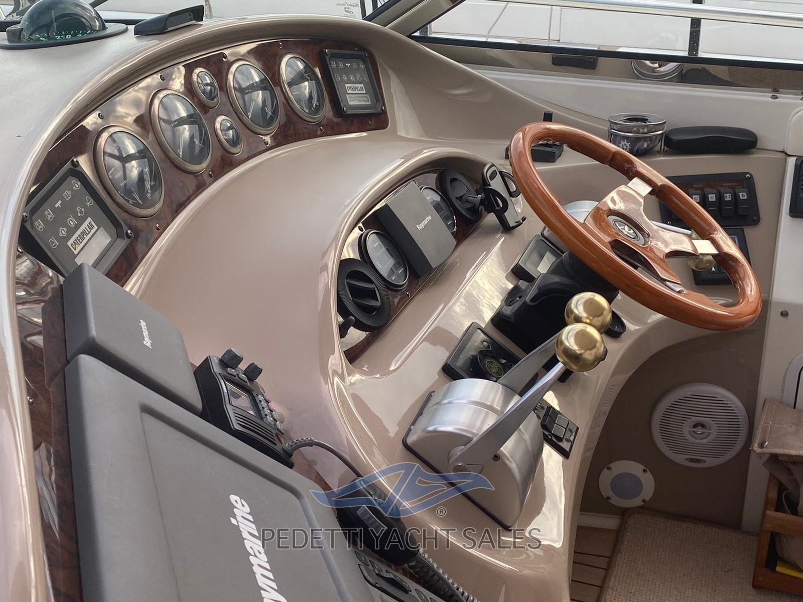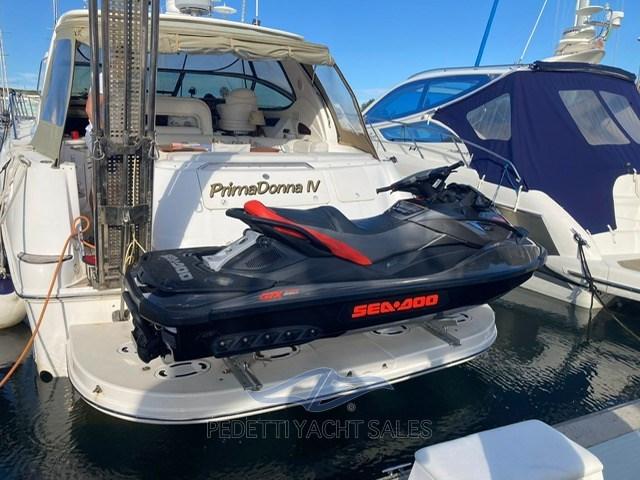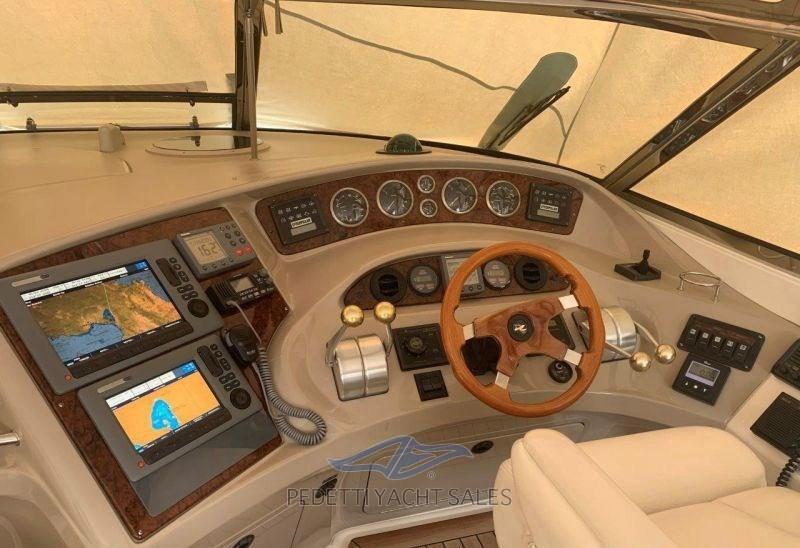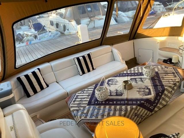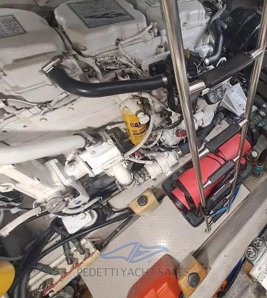 Alarme gaz, Alarme moteur, Alarme de pompe de cale, Alternateur, Eau sous pression, Douche de cockpit, Phare de poursuite, Flaps électriques, Hard top, Extincteur(s) fixe(s), Indicateurs de flaps, Lavabo dans le cockpit, Éclairage de courtoisie, Passerelle, Plateforme arrière, Pompe de cale automatique, Porte latérale, Porte latérale, Cockpit en teck, Prise de quai, Connexion eau sous pression à quai, Guindeau électrique, Echelle de bain, table de cockpit, Table pliante de salon, Annexe, Corne.
