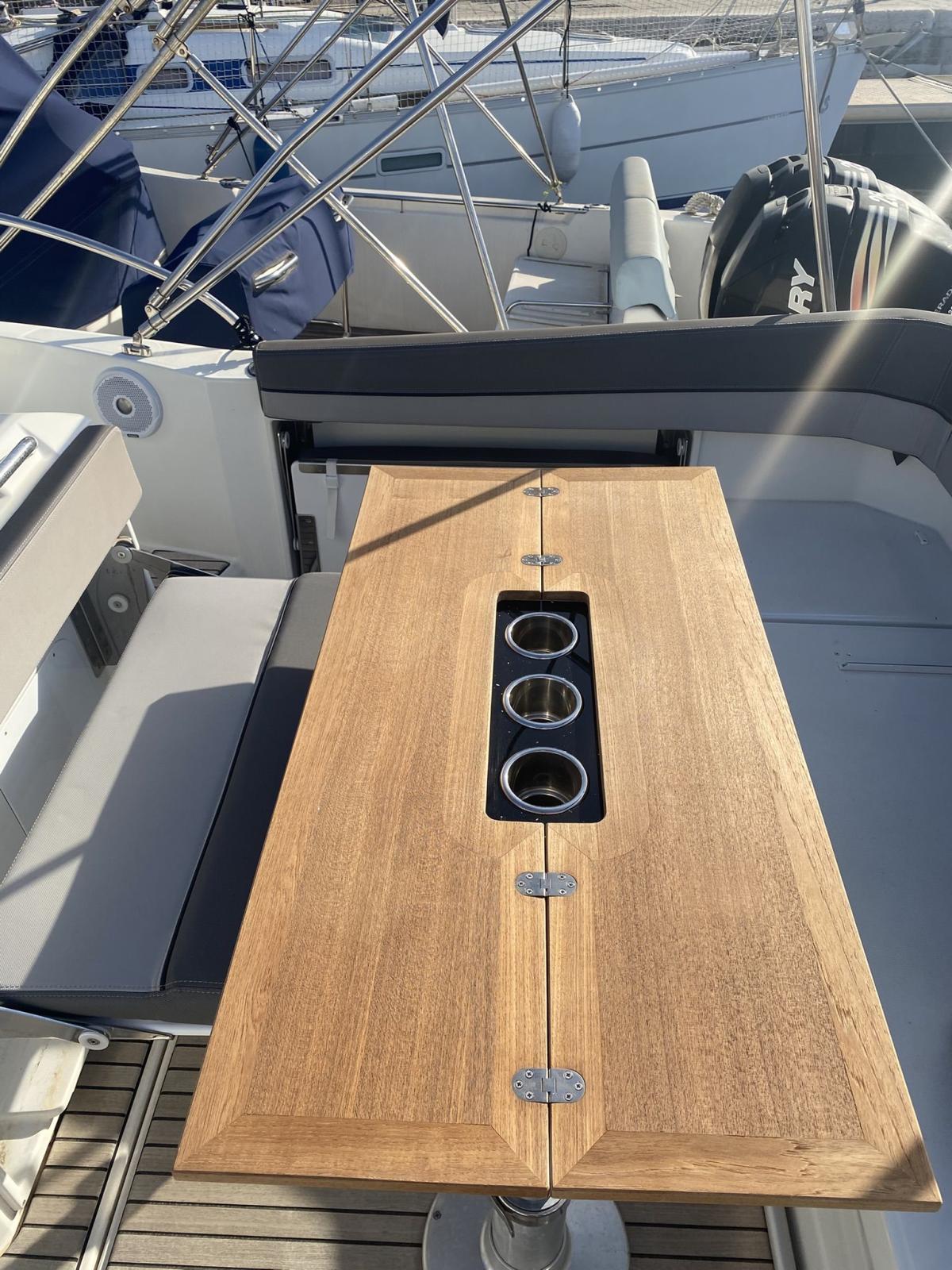 À l’intérieur, la cabine baignée de lumière grâce aux larges fenêtres de coque offre un salon confortable qui se transforme aisément en couchage double pour la nuit.