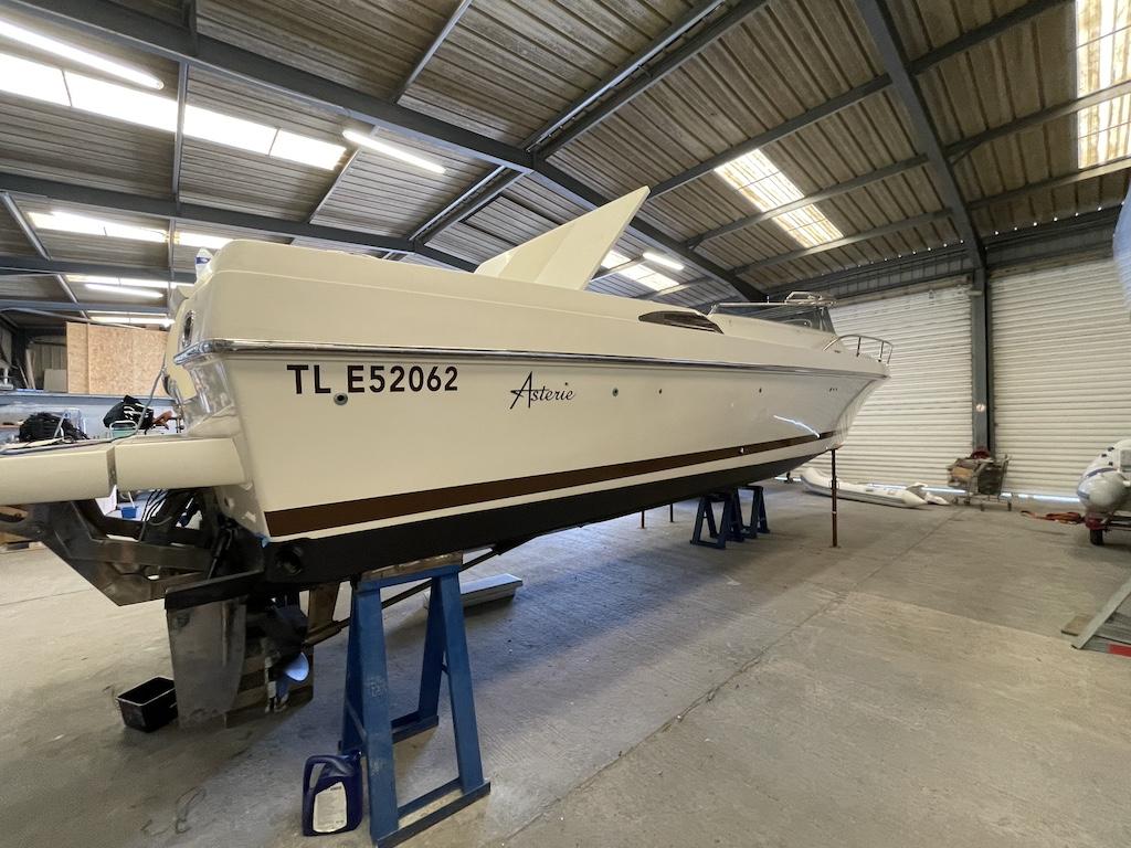Cet Asterie de 2011 en parfait état saura répondre au programme du Day Cruiser par excellence de par sa fonctionnalité : son large bain de soleil, son coin déjeuner transformable en bain de soleil supplémentaire, son taud d'ombrage cabriolet et sa plateforme de bain hydraulique.