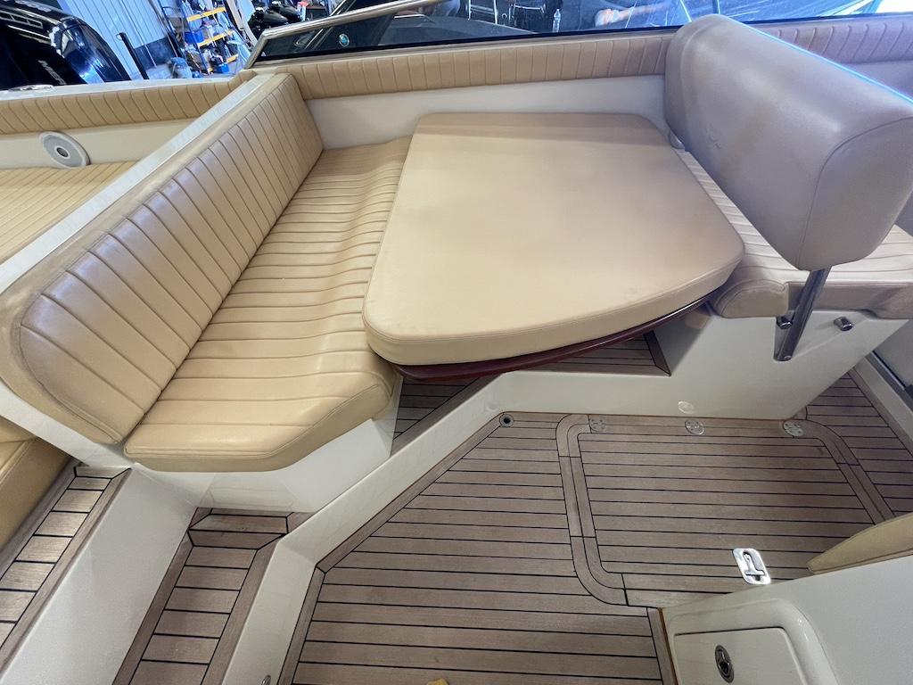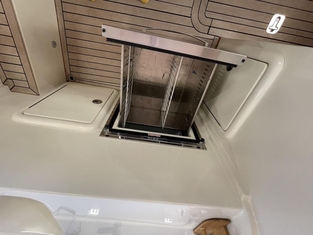 En lieu et place de la cuisine extérieure, ce bateau est doté d’une option banquette pour deux personnes avec deux tiroirs frigo et un lavabo intégré sous l’assise.