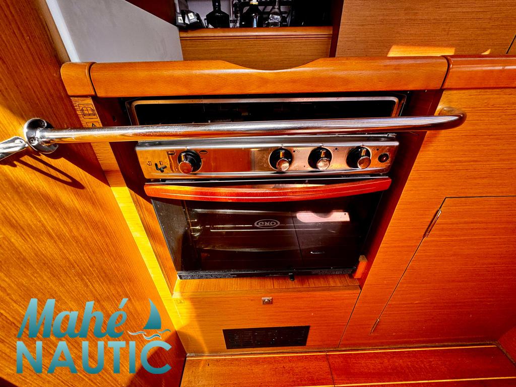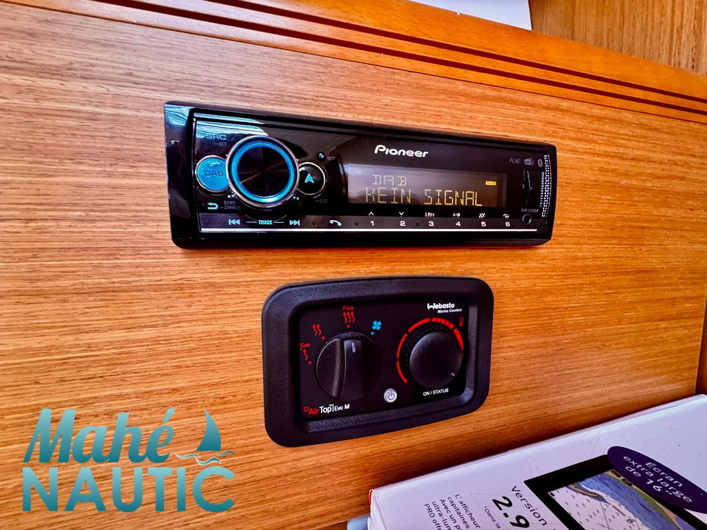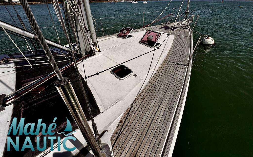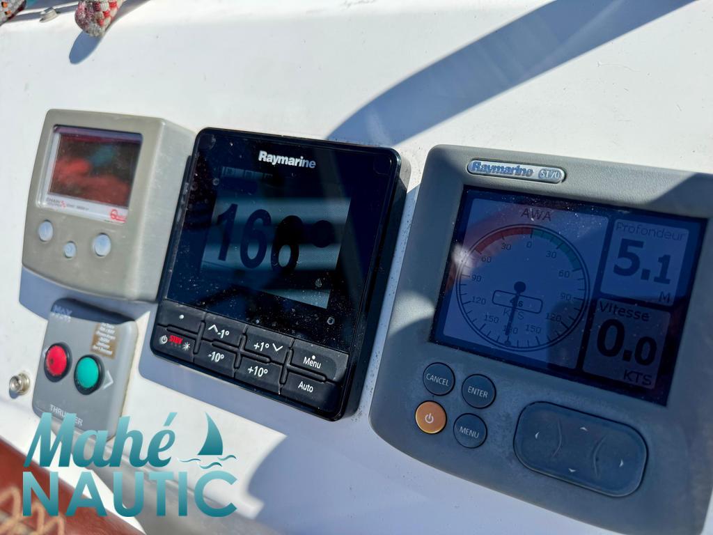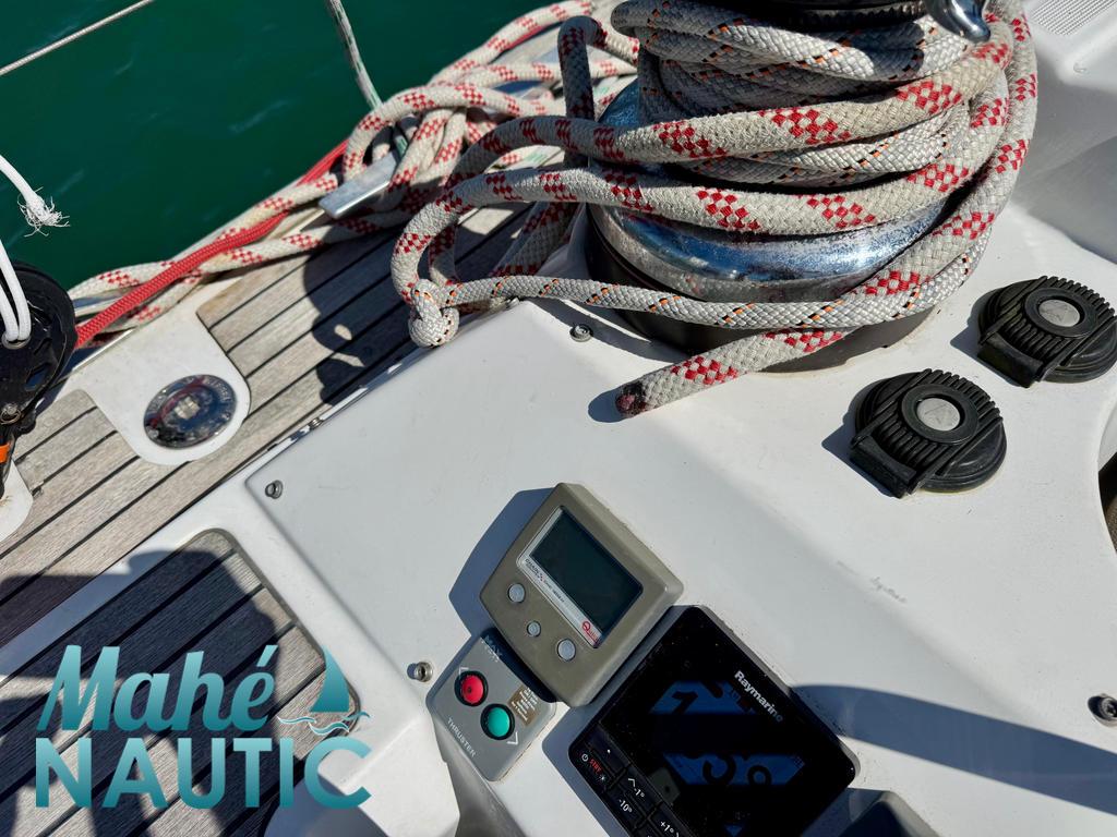 MAT / GREEMENT / VOILES / ACCESSOIRES Mât aluminium classique posé sur le pont - Version mât long Gréement dormant câble Dyform Grand-voile full batten coupe triradiale sandwich spectra - North Sails Rail de guindant de grand voile + chariots de lattes Prises de ris automatiques Lazy-bag de grand voile (2019) Lazy-jacks de grand voile Enrouleur de génois avec tambour sur le pont - Profurl C420 Génois sur enrouleur coupe triradiale - Tissé Dyneema (2017) Etai largable avec système de tension Voile de brise pour étai largable Gréement de spi classique Tangon aluminium avec système de stockage le long du mât Spinnaker triradial classique (210m²) Chaussette à spi Pataras réglable avec vérin hydraulique Navtec ELECTRONIQUE DE NAVIGATION / COMMUNICATION Pilote automatique in board Raymarine Centrale de navigation Raymarine ST 70 Répétiteurs Raymarine ST 70 et I70 cockpit GPS / lecteur de carte dans le cockpit - Raymarine E120W Cartographie électronique Radar avec radôme sur support de mât - Raymarine Transpondeur AIS (émetteur récepteur) VHF à la table à carte - Raymarine Ray55E Radio-CD + HP Hauts-parleurs cockpit (radio CD) Interface PC Informatique (PC + windows) Cartographie MaxSea Courtier référent pour ce bateau écran tactile