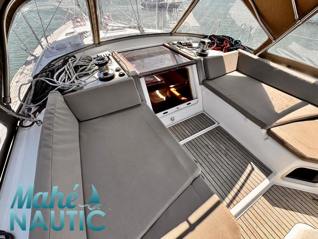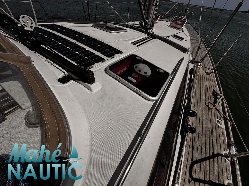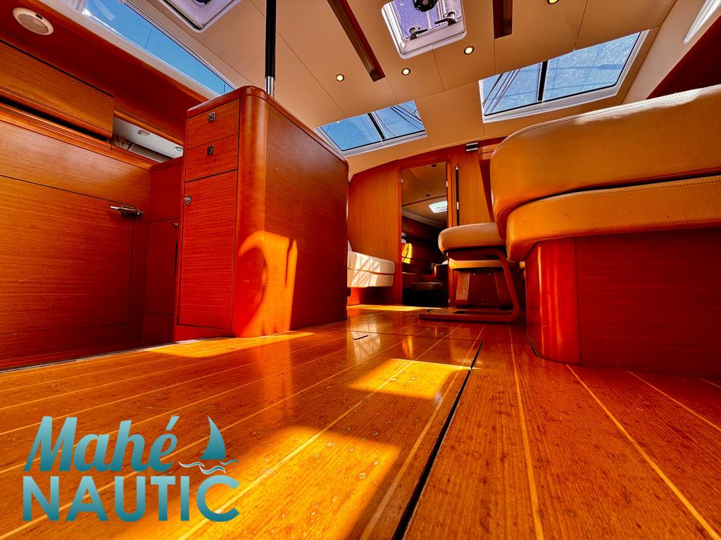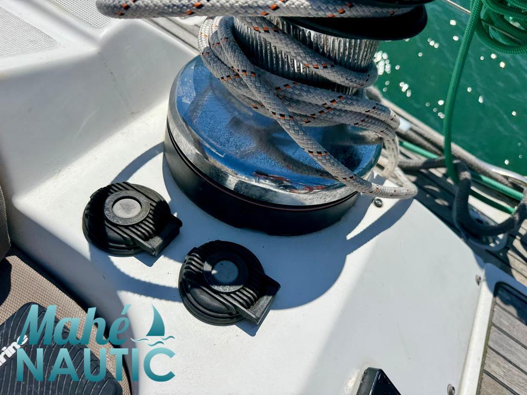 EQUIPEMENT PONT / AMENAGEMENT PONT 2 winchs électriques d'écoute de génois - Harken 70ST Winch sur roof pour réglages et manoeuvres - Harken 46ST Winch électrique de manoeuvre sur roof à babord - Harken 46ST Rail d'écoute de grand-voile sur le roof Passavants teck Fond de cockpit latté teck Assises de cockpit lattées teck Jupe arrière lattée teck Liston teck Table de cockpit avec abattants bois Double barre à roue gainées cuir Housses de barre à roue Capote de roof Coussins de cockpit Guindeau électrique - Lewmar Compteur de chaine au cockpit Pompe eau de mer de rinçage de chaine de mouillage (2024) Ouvertures latérales dans les filières Support moteur hors-bord