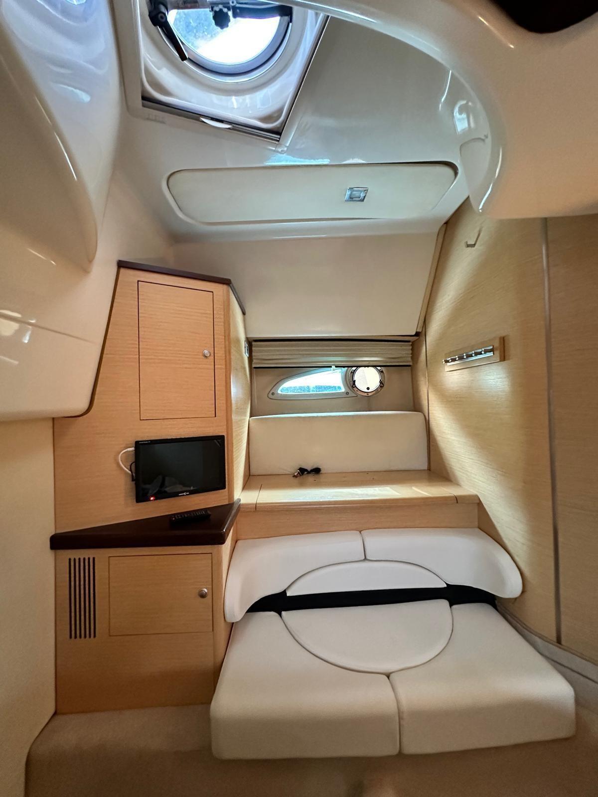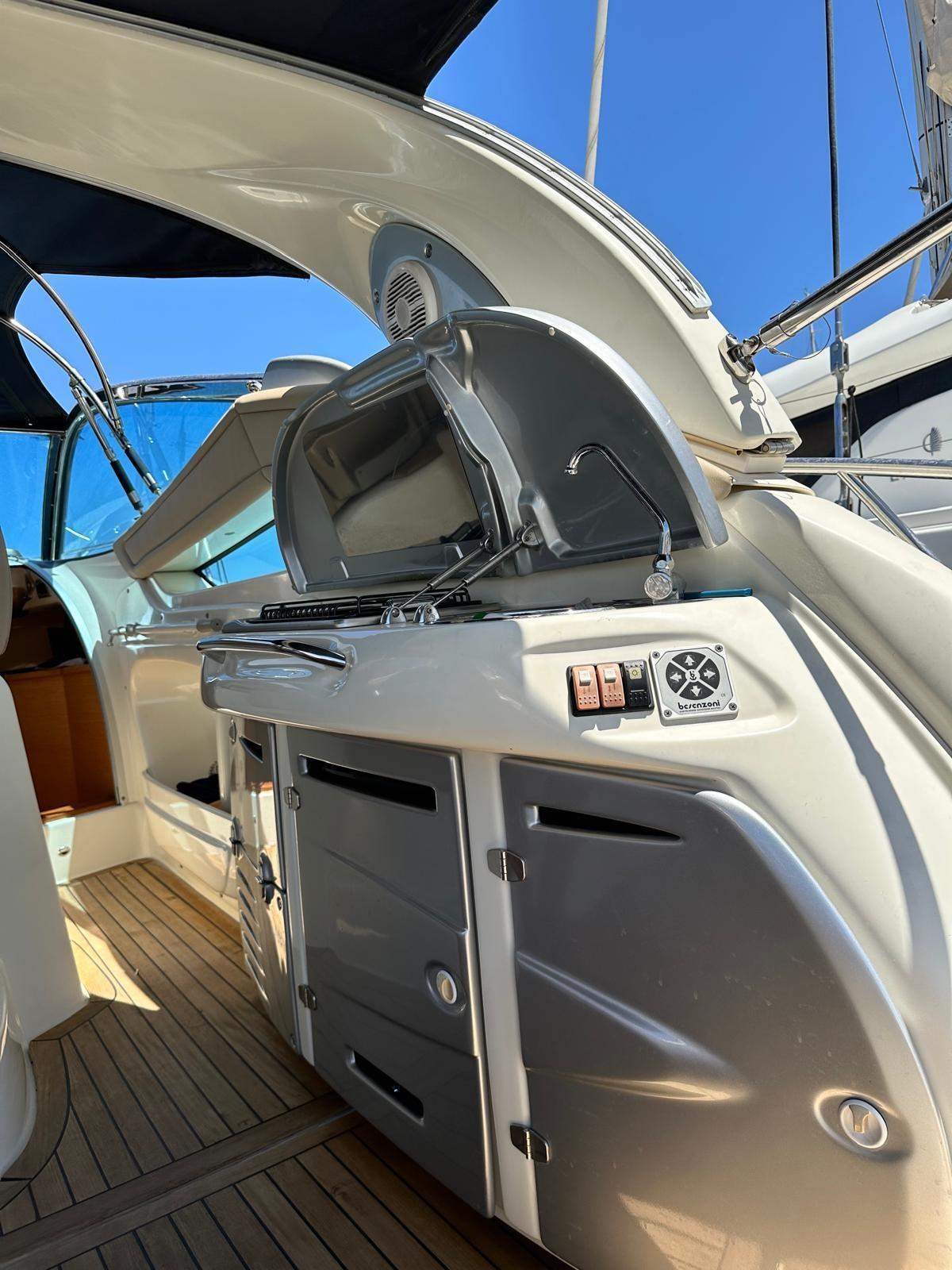Informations complémentaires : gps, sondeur, joystick, console, boussole, batteries, nombre de cabines : 2, nombre de couchettes : 6 personne(s), générateur, sonorisation, solarium, couverture, congélateur, cuisine, système de chauffage de l’eau, dispositif d’éclairage, équipement 220V, passerelle, pompe de cale, réfrigérateur, prise de quai, douche de cockpit, plate-forme de bain, échelle de bain, table de cockpit, éclairage de cockpit