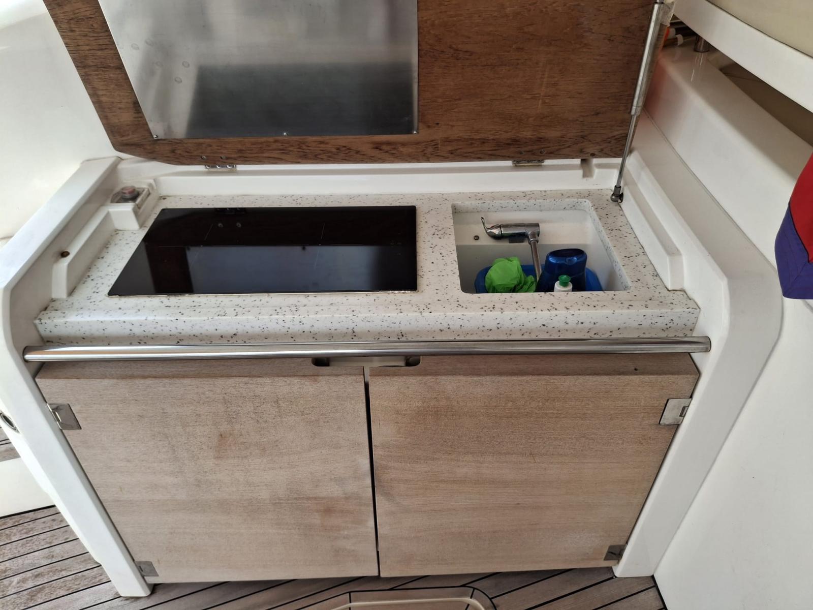 Alarme moteur, Eau sous pression, 4 Batteries, Douche de cockpit, Phare de poursuite, Flaps hydrauliques, Hard top, Extincteur(s) fixe(s), Spots sous-marins, Passerelle, Plateforme arrière, Pompe de cale automatique, 2 Pompe de cale électrique, 2 Pompe de cale manuelle, Onduleur, Guindeau électrique, Echelle de bain, table de cockpit, Annexe (con FB el).