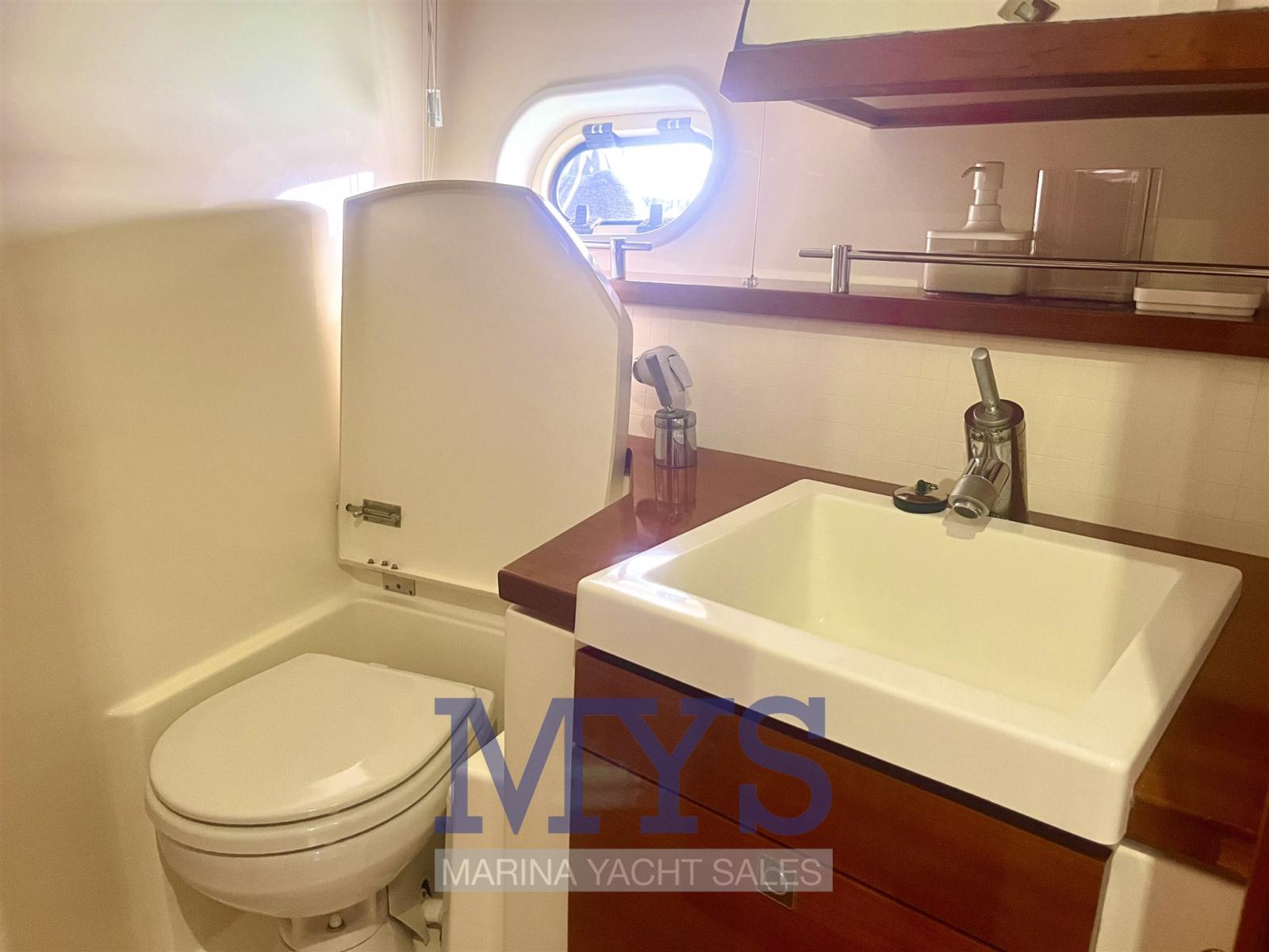 Cabine du propriétaire à l’avant avec lit double péninsule et salle de bain privée avec lavabo, toilettes et cabine de douche