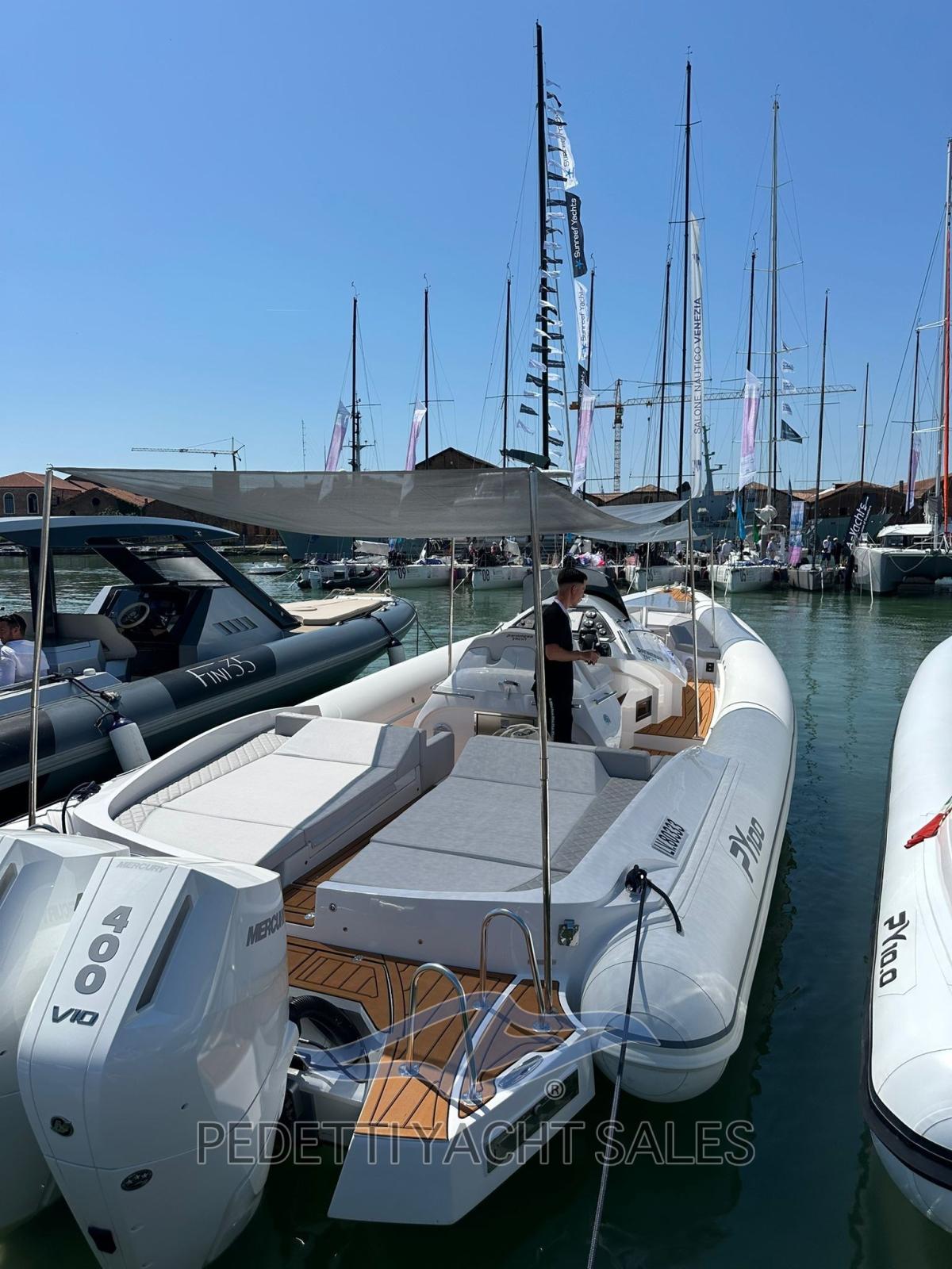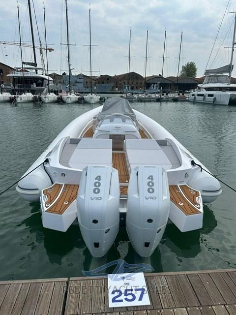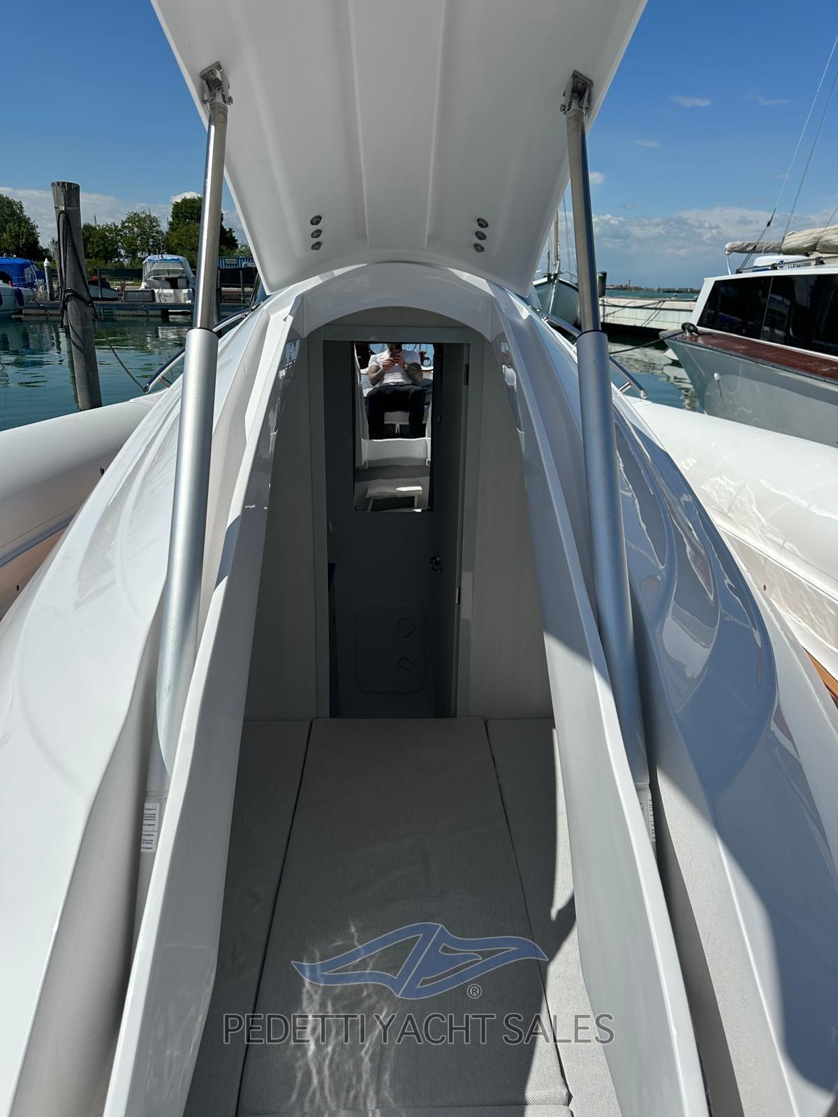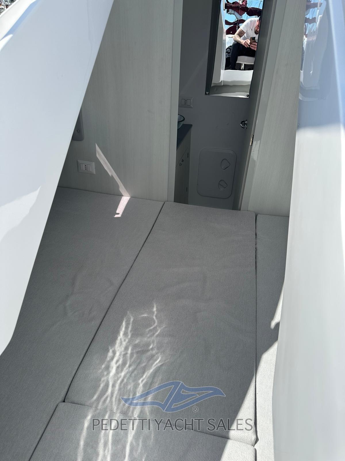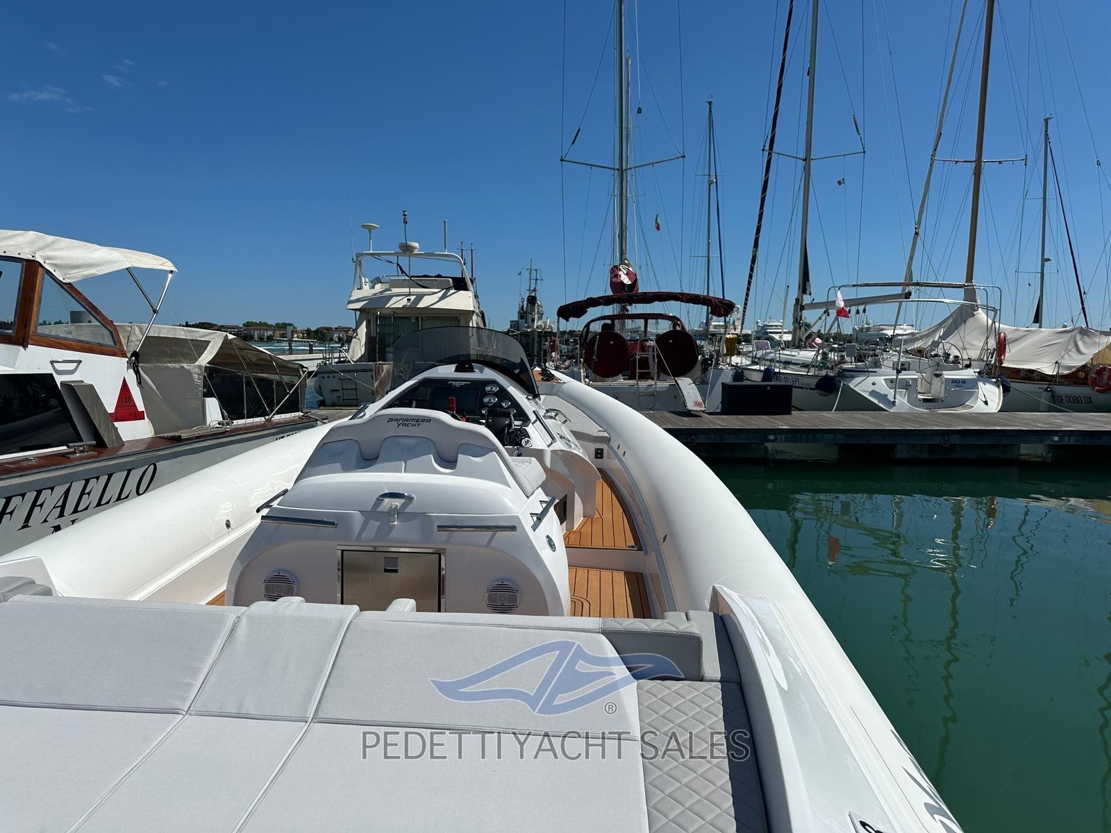 La Panamera PY100 neuve prête à être livrée, se décrit en trois mots simples : SPORTY, EYE-CATCH, UNIQUE. Le carénage extraordinaire représente l’union harmonieuse d’un design aérodynamique, d’une technologie hydrodynamique avancée et de matériaux de haute qualité ; L’espace exceptionnel sous le pont d’une hauteur de 2 mètres est configuré comme suit : il y a deux lits simples qui peuvent être convertis en lit double, et il y a une salle de bain séparée, avec lavabo, douche et toilettes ; En option, sellerie en teck, GPS 12'', transducteur, chargeur de batterie et onduleur, propulseur d’étrave, prises USB, lumières de courtoisie dans le cockpit, lampes de plongée, table élévatrice électrique, élévateur de porte d’accès à la cabine électro-actionné et de nombreux coffres spacieux. Double auvent arabe à l’avant et à l’arrière.