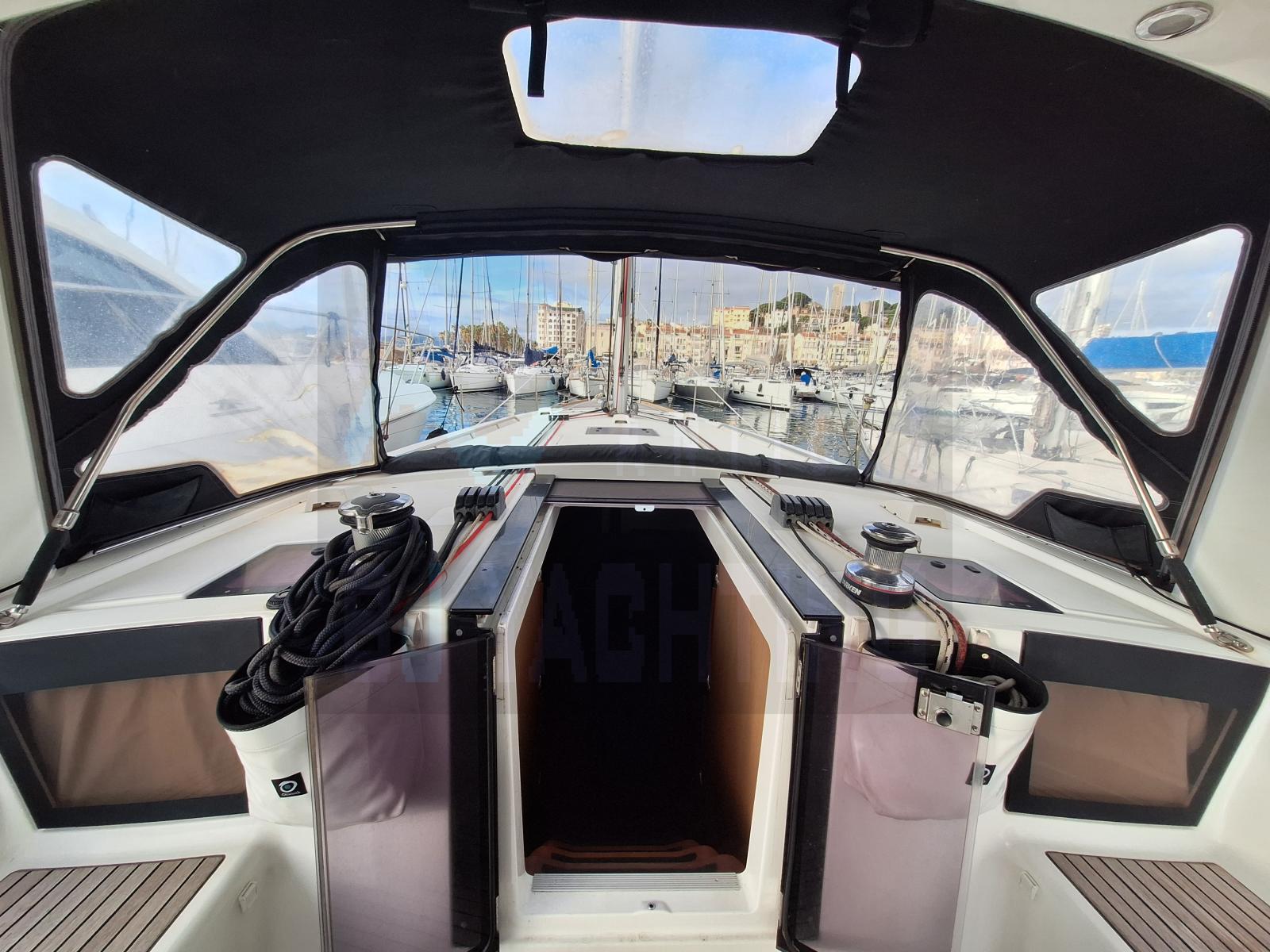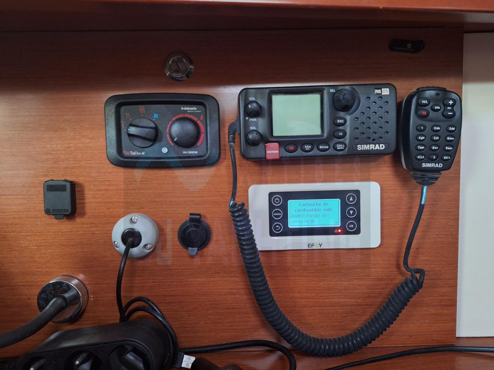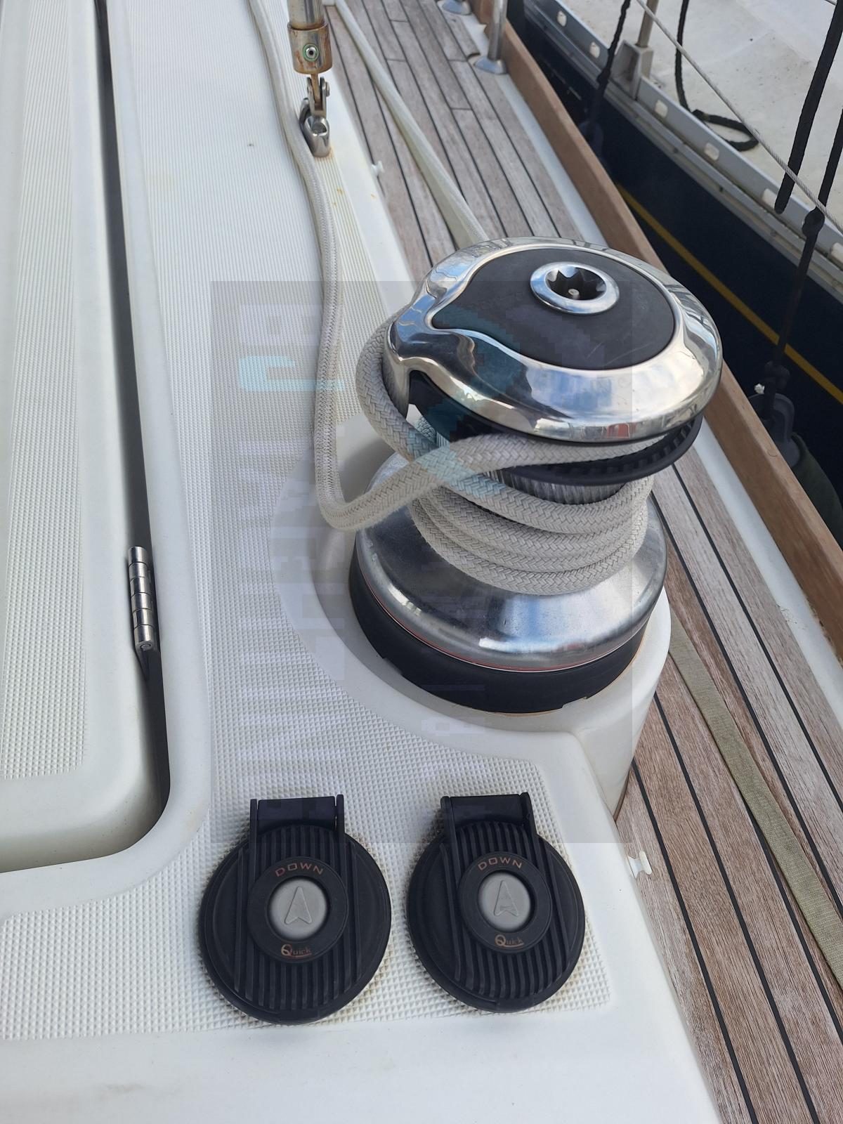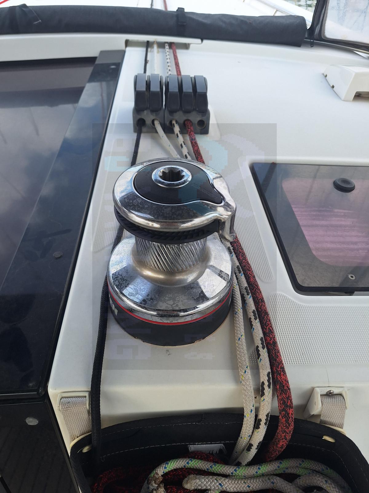 Le bateau est doté d’un gréement sur enrouleur complet (GV + Génois), d’un Code 0, d’une électronique hauturière complète (GPS, radar, AIS, pilote automatique, instruments vent/profondeur/vitesse) et d’un propulseur d’étrave.