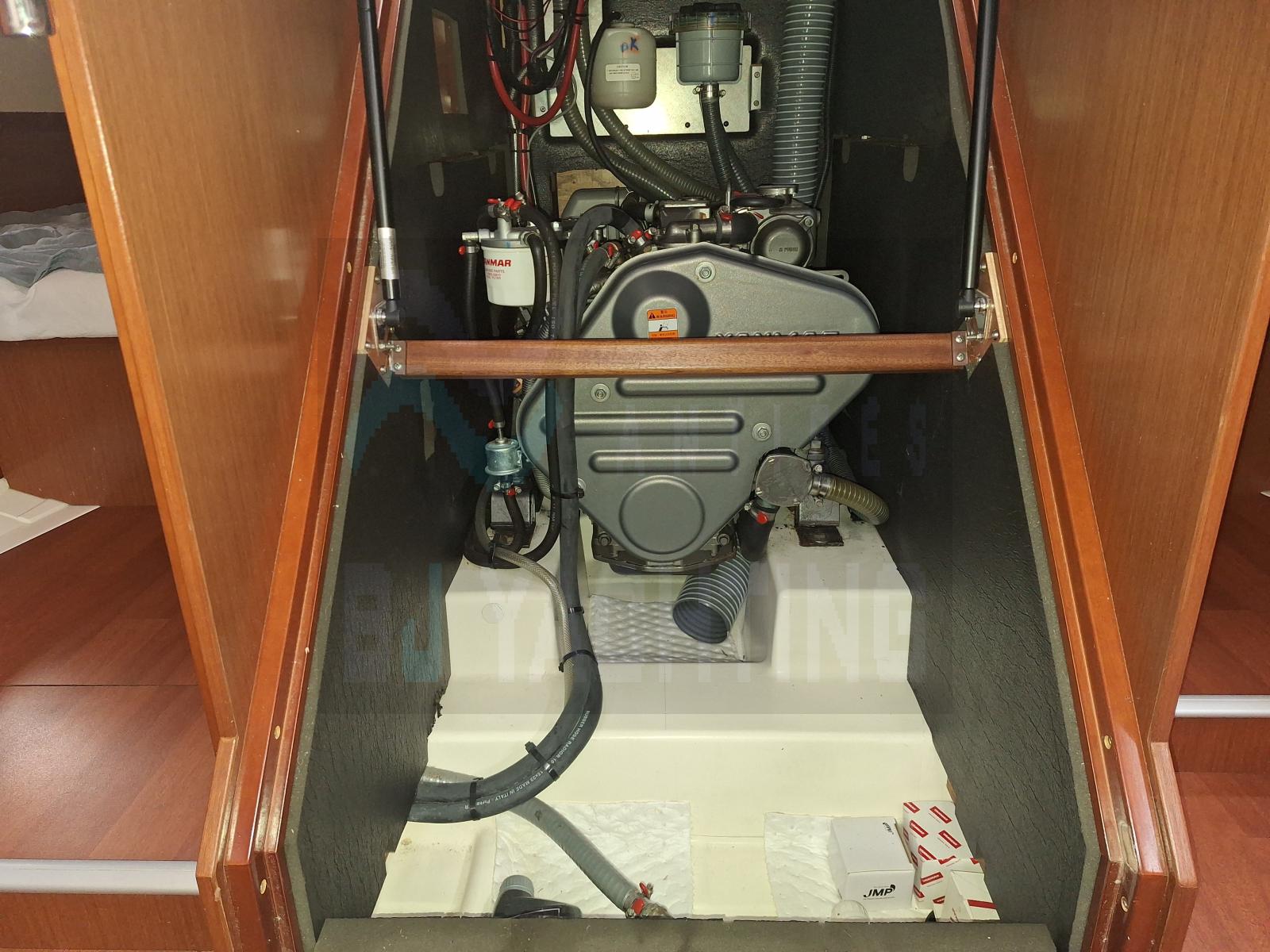 Motorisation Yanmar 54 cv (950 h), réservoirs de 300 L gasoil et 400 L eau douce. Climatisation, guindeau électrique, bimini, capote, réfrigérateur, cuisine équipée.