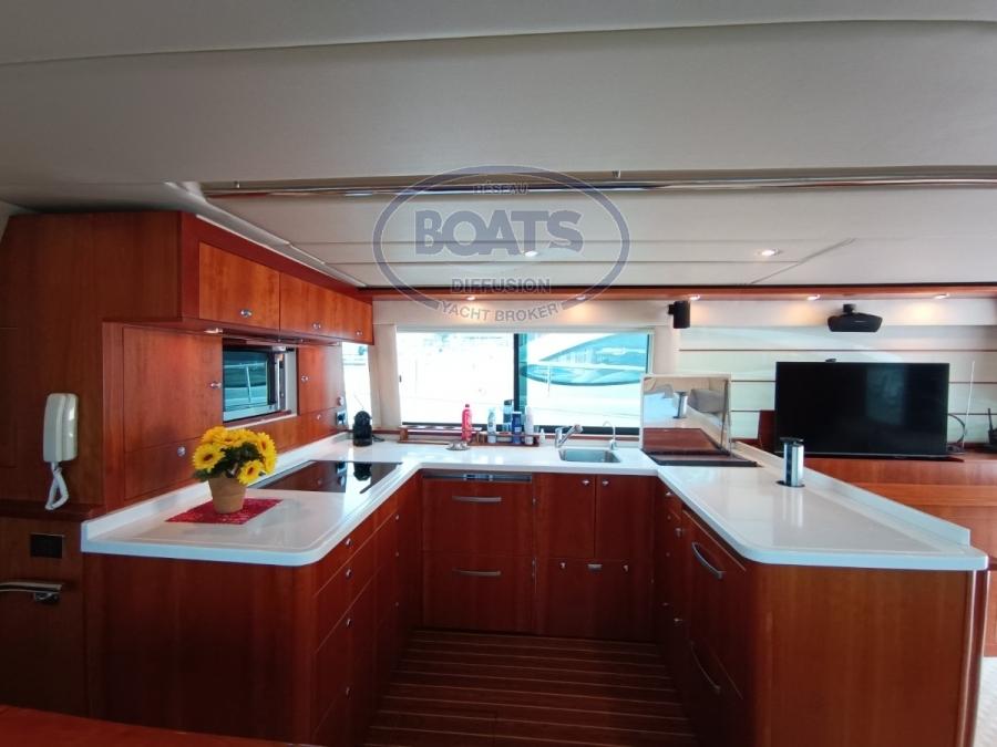 Le poste de commande au fly est spacieux doté de deux fauteuils de pilotage haut de gamme. La console du tableau de bord est sur vérins escamotable pour offrir encore plus de place au mouillage dans cette immense flybridge. Il possède une grue électrique d'une capacité de 400kg, et tout l'équipement pour la pêche en haute mer.(2 tangons de pêche: Outrigger LEE télescopique Carbone inox