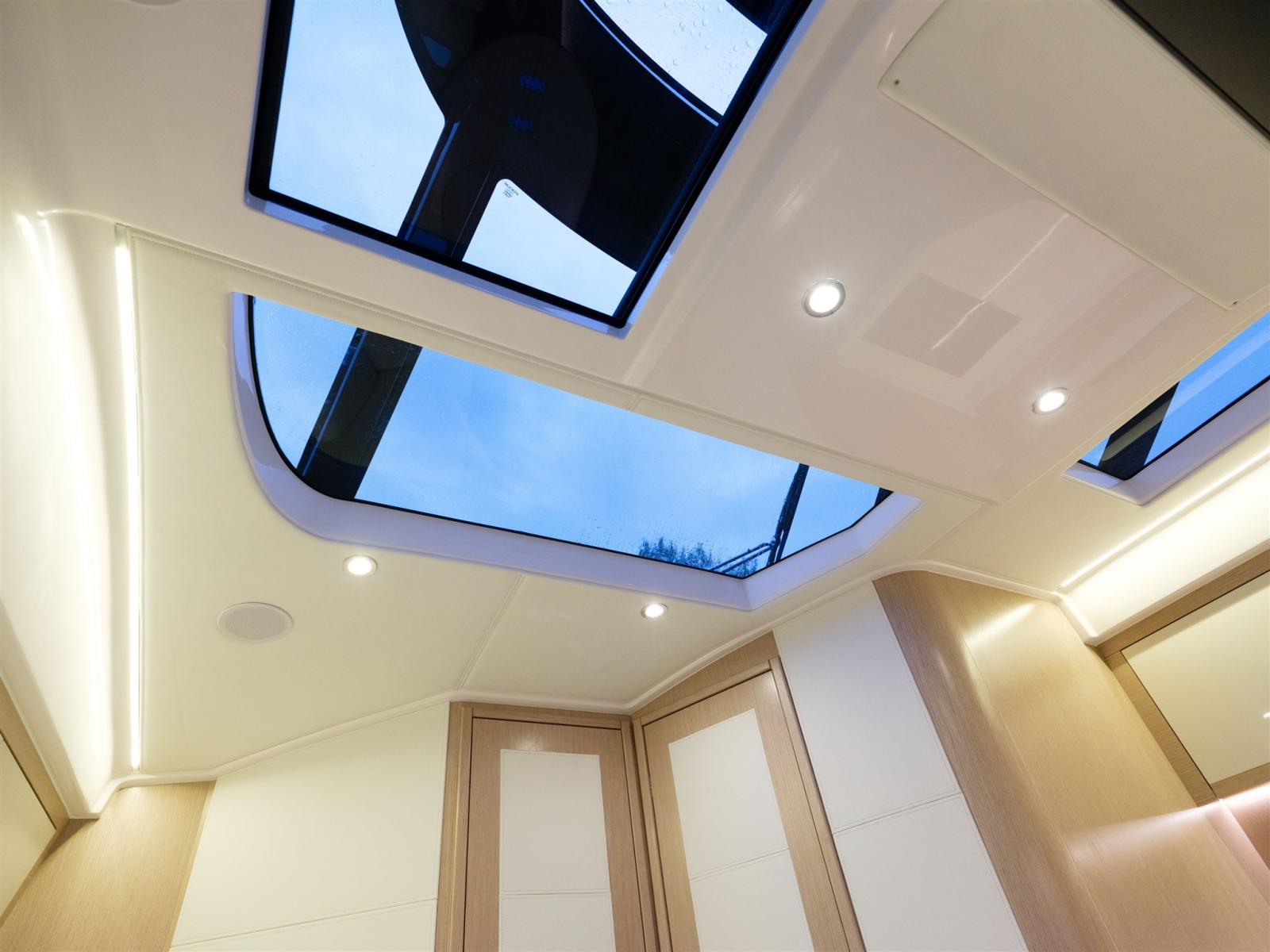 Plancher en teck dans le salon et les cabines. Disposition du propulseur d’étrave. Couleur de toit rigide personnalisée. Volets Bennett avec indicateurs et contrôle automatique de l’assiette