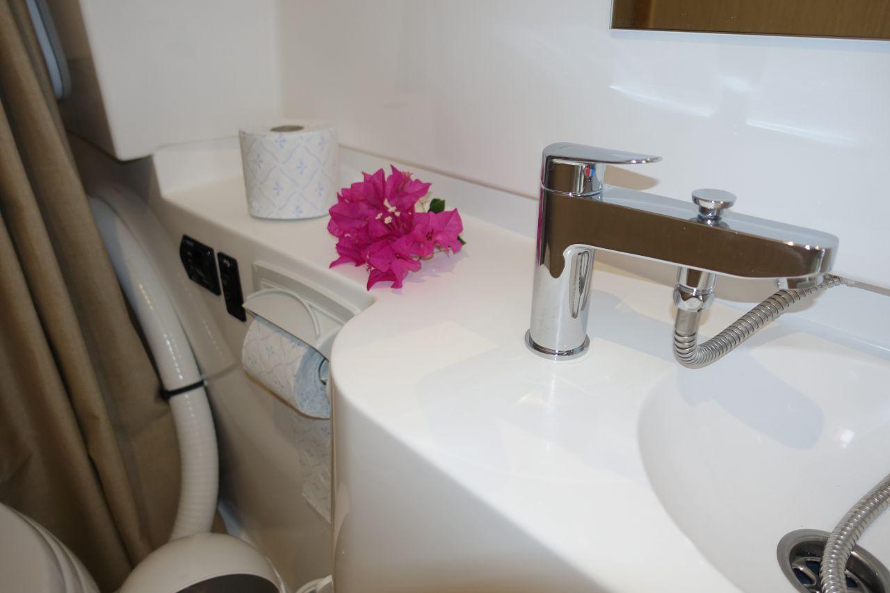 Une salle d’eau à tribord avec douche, lavabo et un WC électrique avec Holding tank