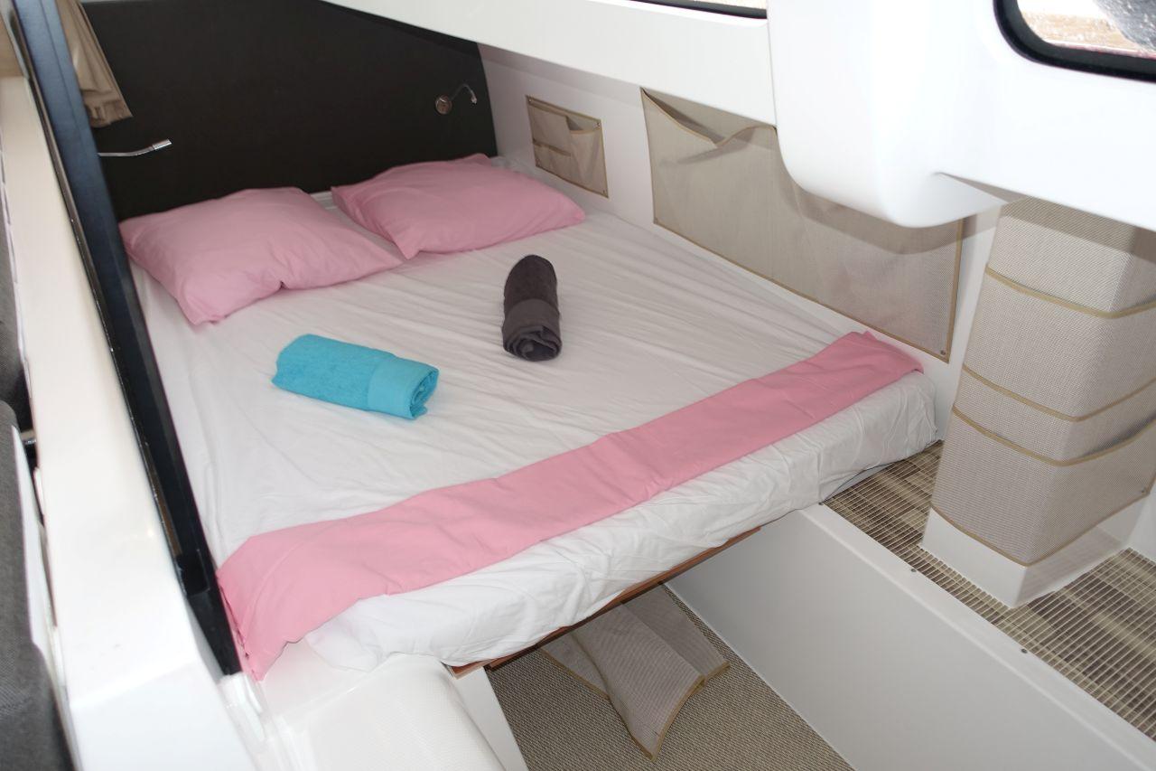 Un couchage double à bâbord accessible par le carré (séparé par vitre + rideaux)