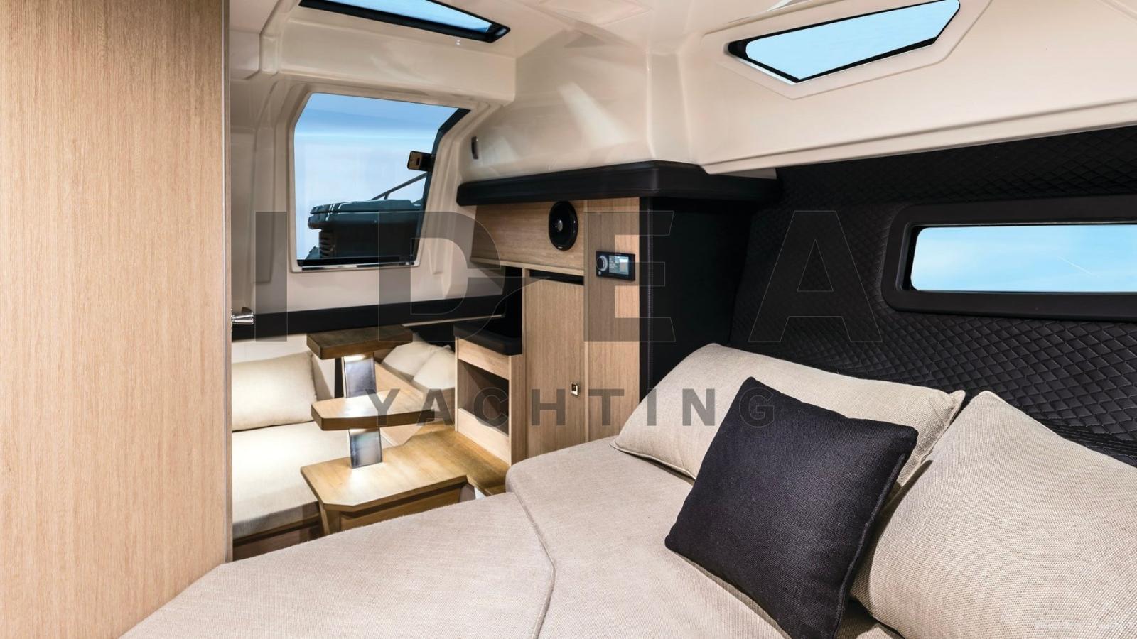 Le daycruiser de 9,85 mètres présente des lignes douces et des détails raffinés avec un style sportif et vintage qui renforce à la fois la fonctionnalité et l’élégance. La hauteur des espaces intérieurs, le niveau de confort et les choix de décoration extrêmement élégants rendent ce yacht idéal pour les croisières d’une journée ou plus. Les espaces sont lumineux et aérés grâce à six points lumineux et à la porte en plexiglas.