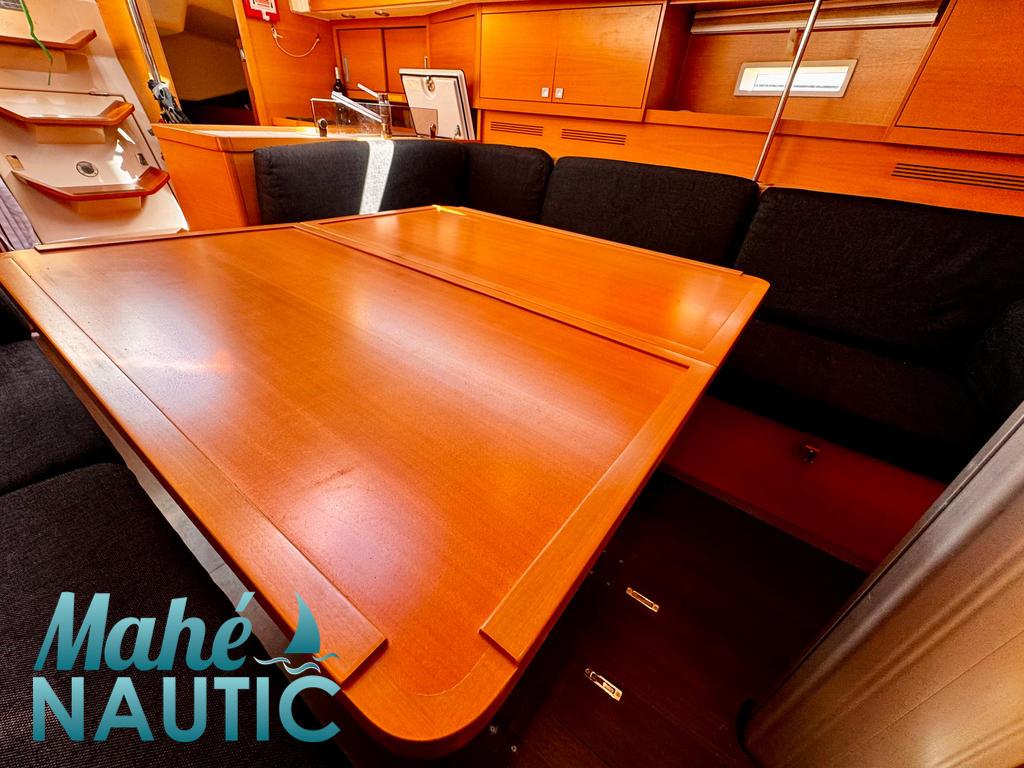 *Intérieur : 3 cabines + 1 salle d'eau avec WC marin, Chauffage Webasto, Coin cuisine en L (double évier avec eau douce froide/chaude sous pression, four (2022), réchaud gaz 2 feux, réfrigérateur, rangements), Coin navigateur avec table à carte dans le sens de la marche, Grand carré avec table, Compartiment salle d'eau avec douche et WC marin + réservoir d’eau noires, Ballon d'eau chaude, Prise de quai + chargeur, 2 batteries de service (2019) + 1 batterie moteur.