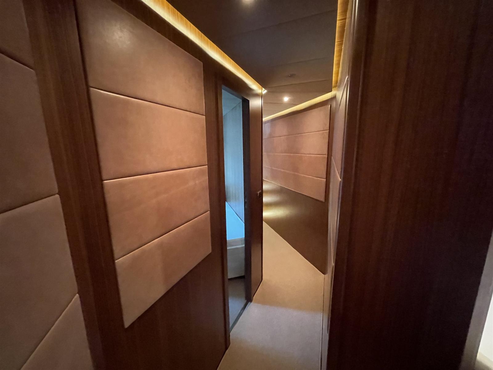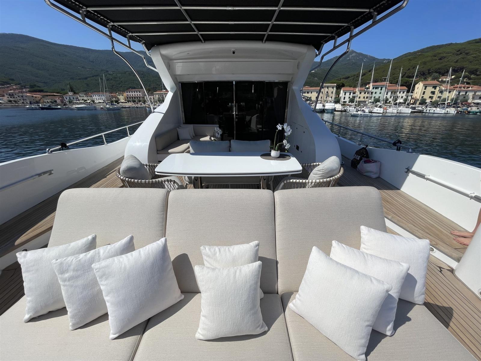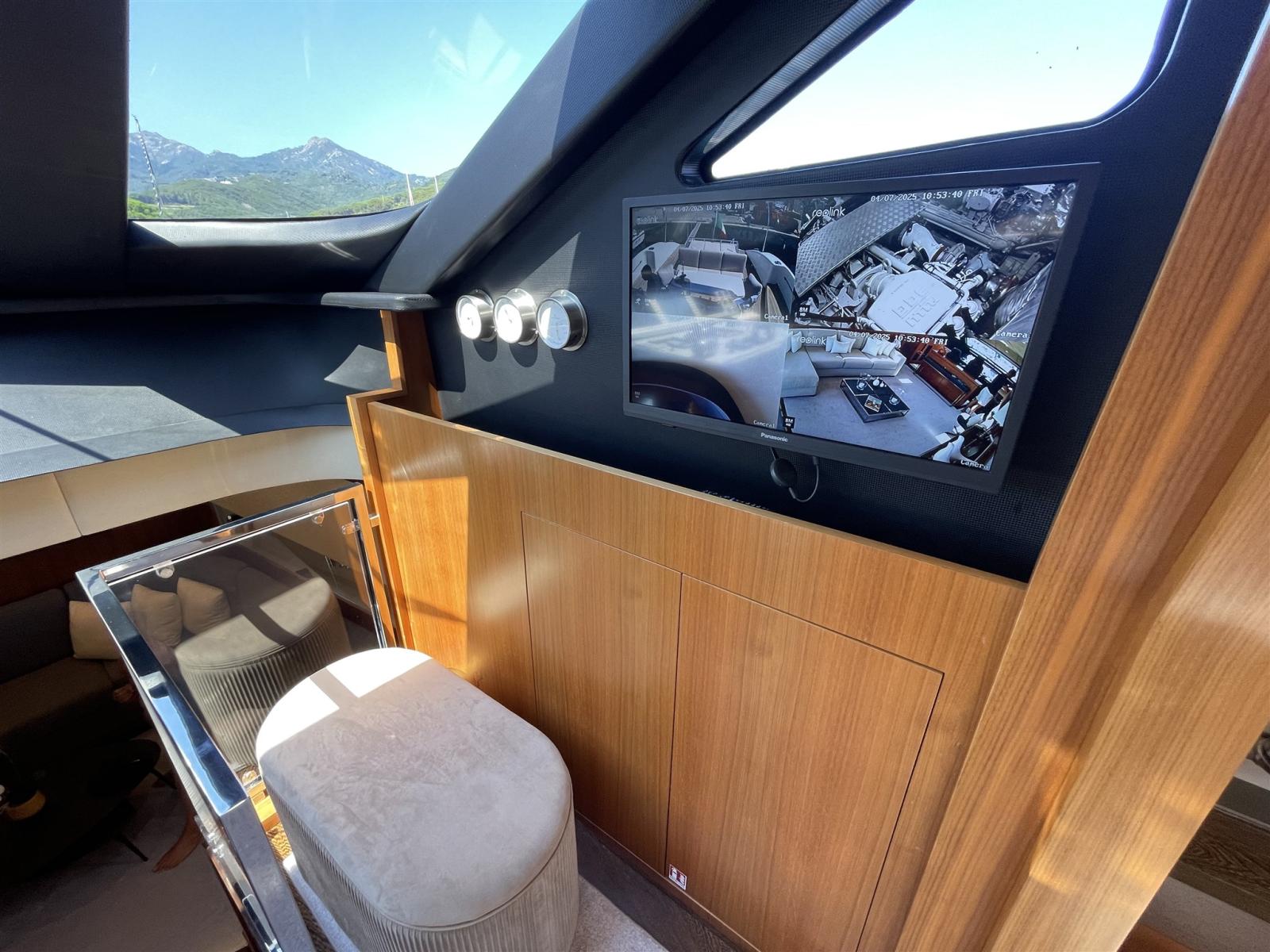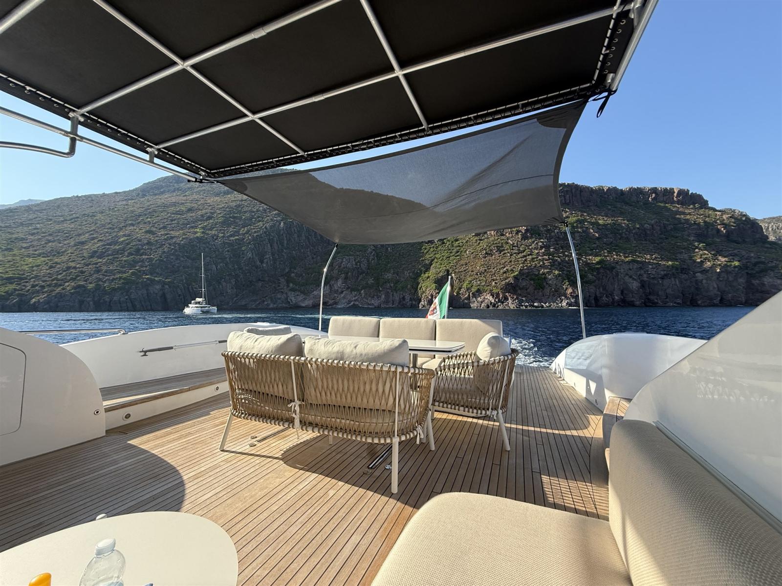Alarme gaz, Alarme moteur, Alarme de pompe de cale, Alternateur, Système de vidange, Propulseur de poupe (potenziate 48 V), Propulseur d'étrave (potenziate 48 V), Flaps électriques, Flaps hydrauliques, Indicateurs de flaps, Éclairage de courtoisie, Spots sous-marins, Pompe de cale automatique, Pompe de cale manuelle, Pont en teck, Porte latérale, Porte latérale, Cockpit en teck, Prise de quai, Connexion eau sous pression à quai, Onduleur, Guindeau électrique, table de cockpit.