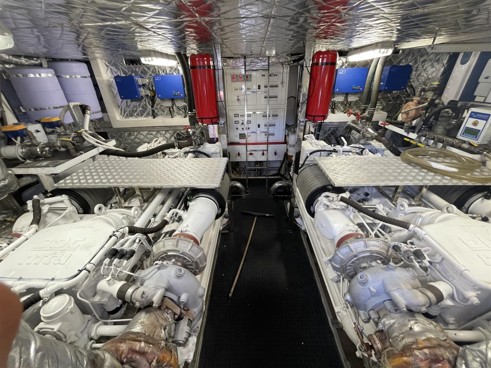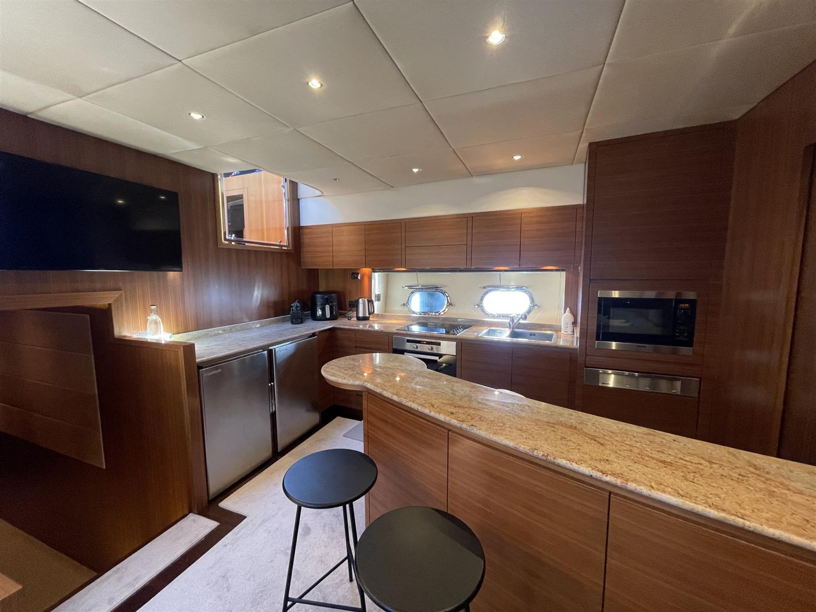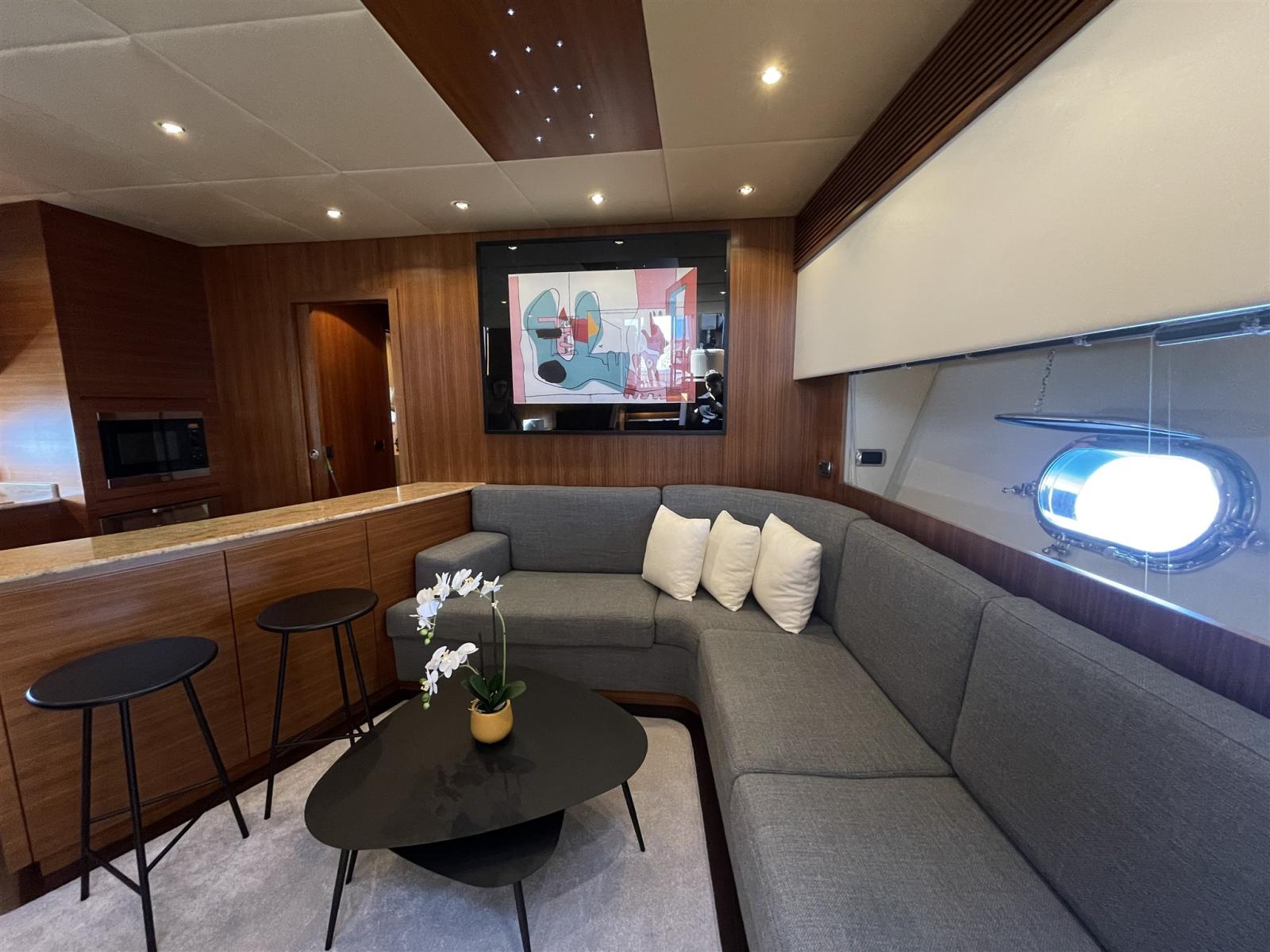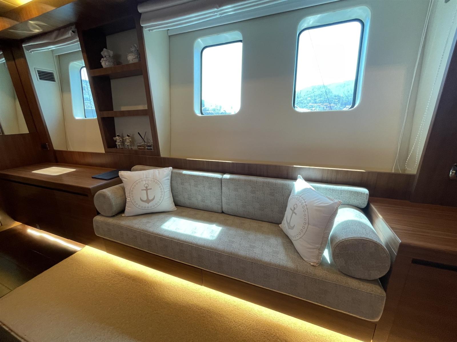 Alarme gaz, Alarme moteur, Alarme de pompe de cale, Alternateur, Système de vidange, Propulseur de poupe (potenziate 48 V), Propulseur d'étrave (potenziate 48 V), Flaps électriques, Flaps hydrauliques, Indicateurs de flaps, Éclairage de courtoisie, Spots sous-marins, Pompe de cale automatique, Pompe de cale manuelle, Pont en teck, Porte latérale, Porte latérale, Cockpit en teck, Prise de quai, Connexion eau sous pression à quai, Onduleur, Guindeau électrique, table de cockpit.