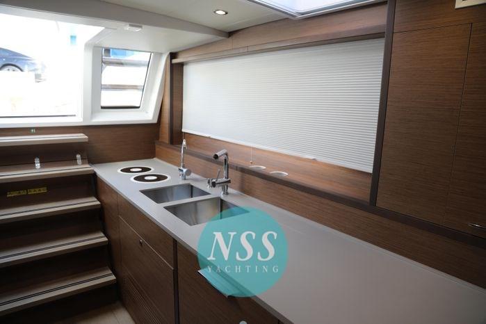 La cuisine latérale dans la coque bâbord comprend un accès direct au salon et une sortie séparée vers le cockpit