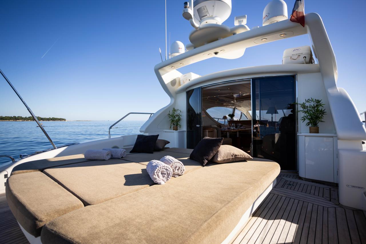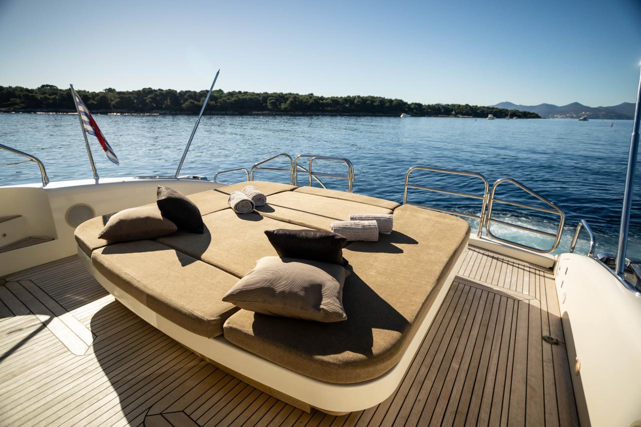 Propulsé par deux MTU 1500 cv, il atteint aisément 24 nœuds en croisière et jusqu’à 32 nœuds en vitesse maximale. À bord, trois cabines confortables avec salles de bain privatives, deux salons et de vastes espaces extérieurs offrent un confort haut de gamme.