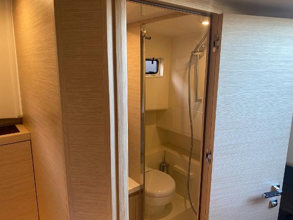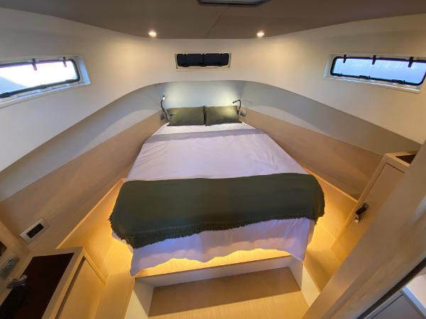 Sous le pont, vous retrouverez une cabine avec un grand lit double, une seconde cabine avec deux lits simples et une salle de bain avec toilette.