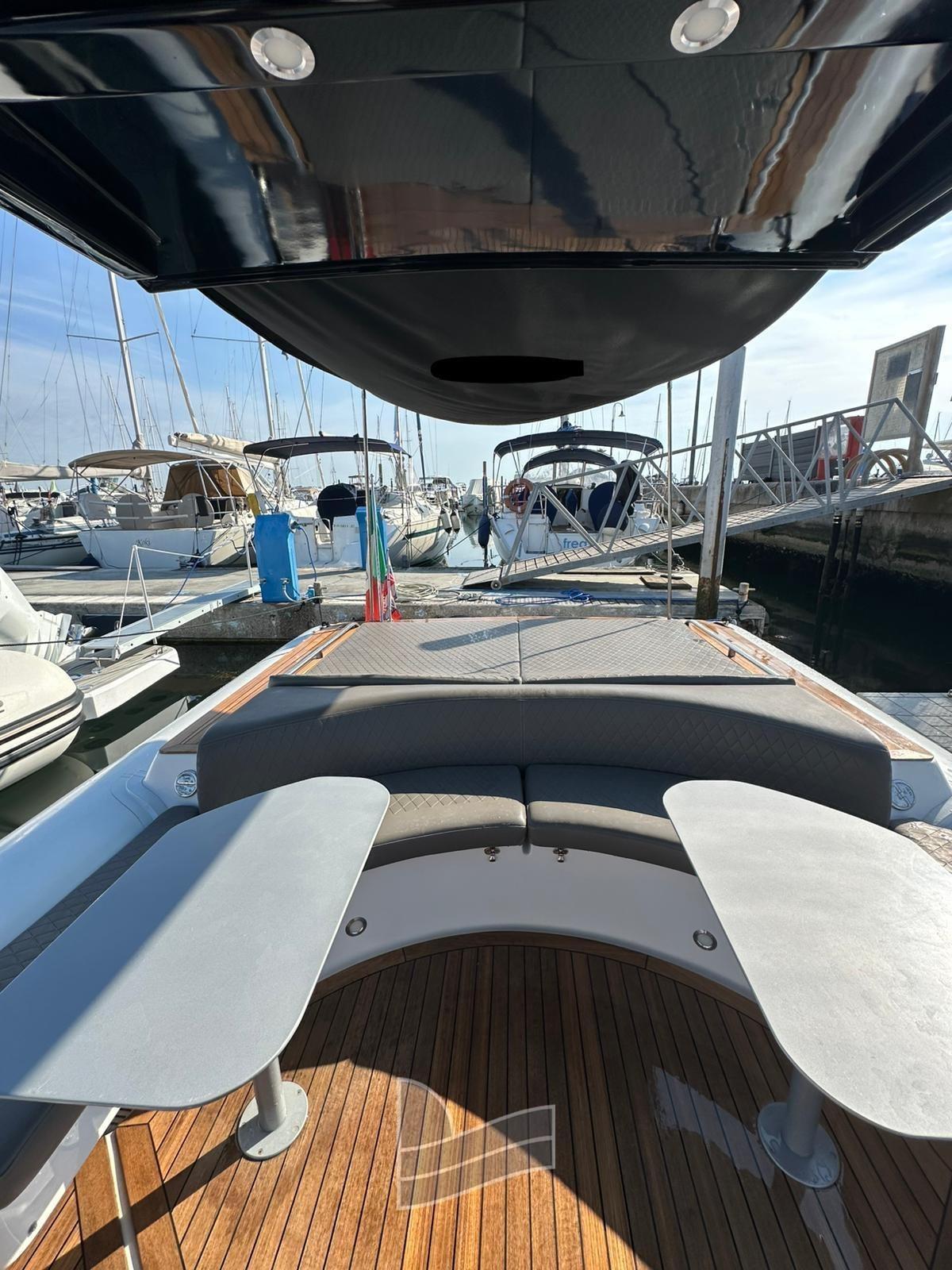 Alarme moteur, Ouverture du compartiment moteur électrique, Passavant en teck, Douche de cockpit, Extincteur(s) fixe(s), Lavabo dans le cockpit, 2 Spots sous-marins, Plateforme arrière (di poppa in teak), Cockpit en teck, Prise de quai, Guindeau électrique, Echelle de bain, table de cockpit, T-Top (maggiorato).