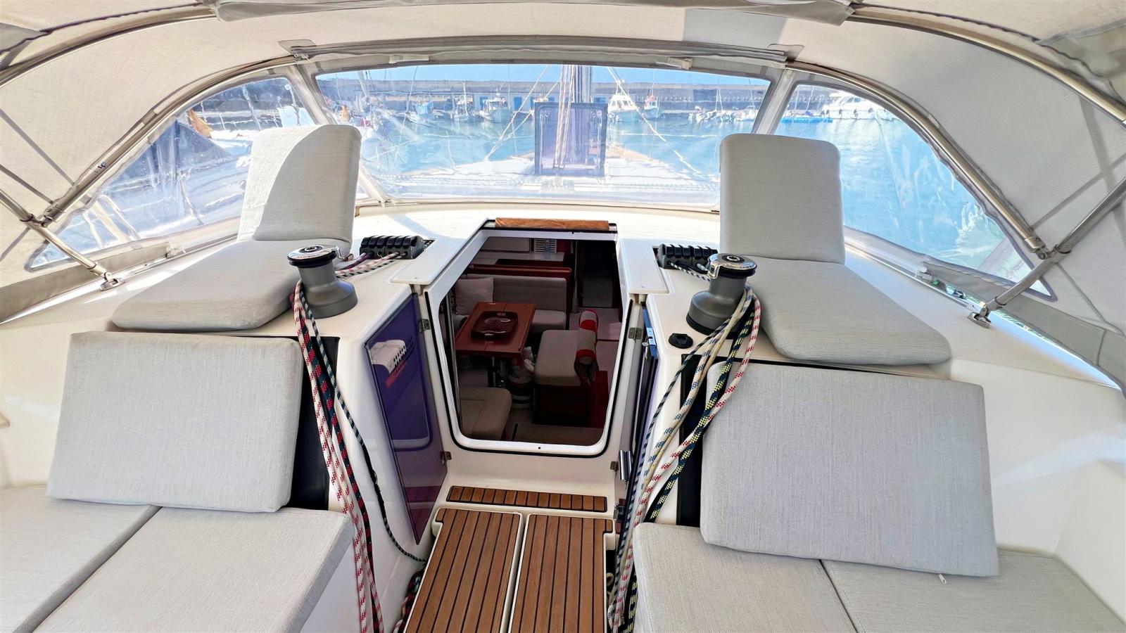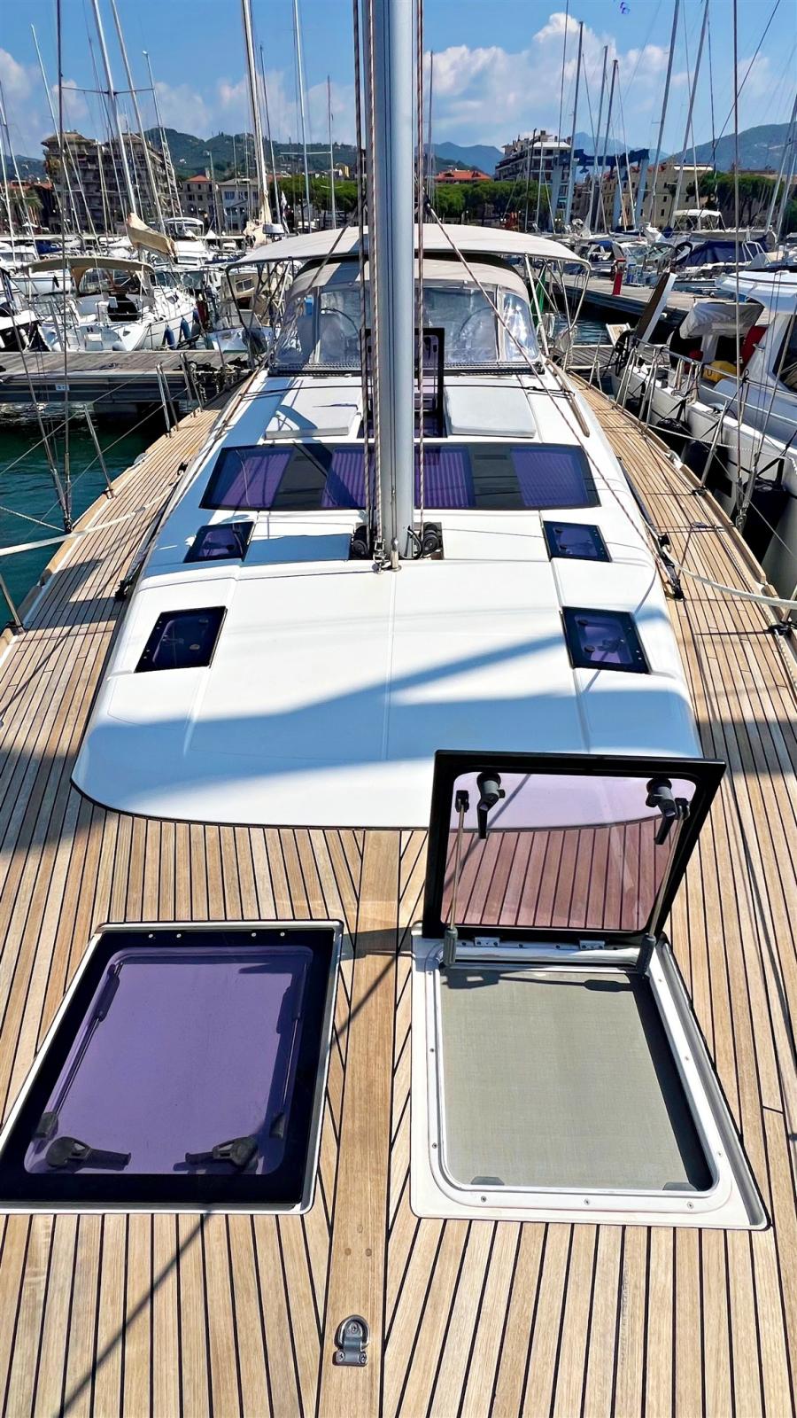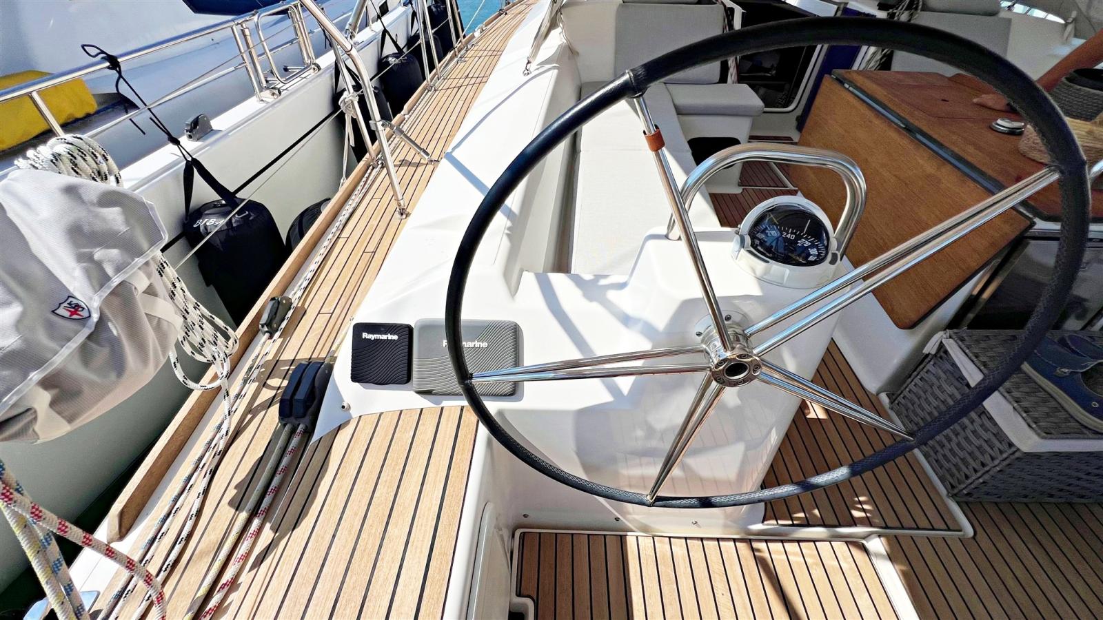 Ancre (Delta), Eau sous pression, 5 Batteries (2025), Passavant en teck, Douche de cockpit, Double barre à roue, Passerelle (idraulica Besenzoni), Pompe de cale manuelle, Cockpit en teck, Prise de quai, Guindeau électrique, Gréement monotoron, Echelle de bain, Chaise support HB, table de cockpit, Winch, 3 Winch électrique, Winch électrique avant, Windex.