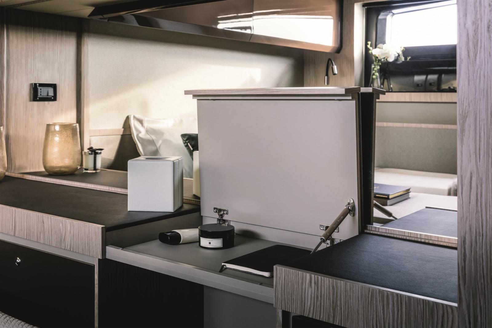 2 Alarme moteur, Alarme de pompe de cale, Auto Dynamic Trim Interceptor (Volvo Interceptor), Eau sous pression, Douche de cockpit, Flaps électriques, Garage à annexe, Hard top (elettrico), Extincteur(s) fixe(s), Lavabo dans le cockpit, Éclairage de courtoisie, Passerelle (idraulica a scomparsa), Plateforme arrière (idraulica con piano in teak), 3 Pompe de cale automatique, Porte latérale, Cockpit en teck, Prise de quai, Onduleur, Guindeau électrique, Echelle de bain, Selles pour Annexe (sistema di alaggio), table de cockpit (con finitura in carbonio), Corne, Winch électrique arrière, Winch électrique avant.