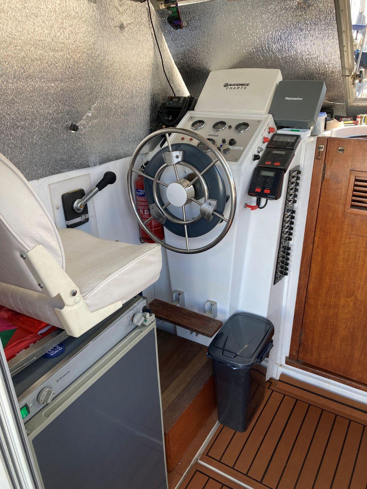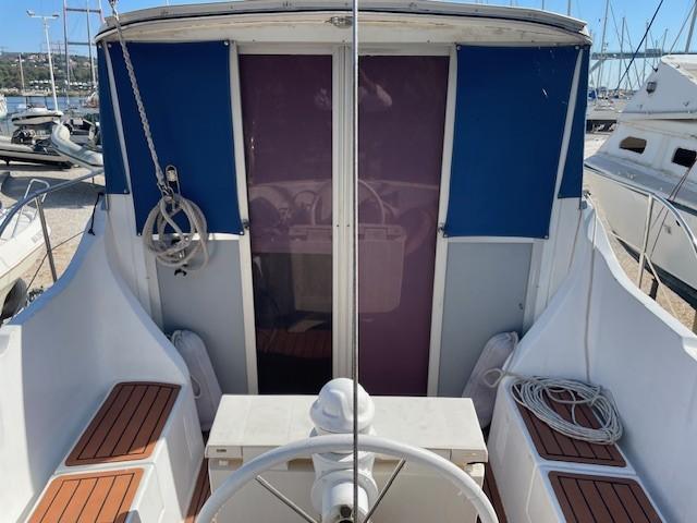 Timonerie abritée avec poste de pilotage intérieur/ extérieur, siège pilote et appareillages de navigation GEONAV 11 FLASH(sondeur, VHF, GPS ), Pilote auto Raymarine ST 4000.