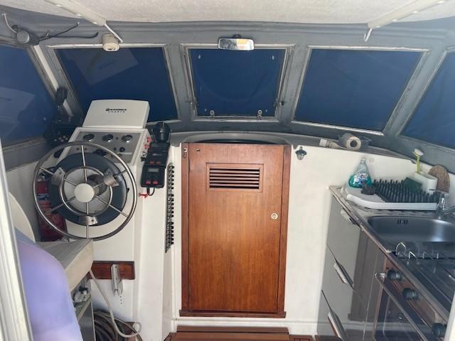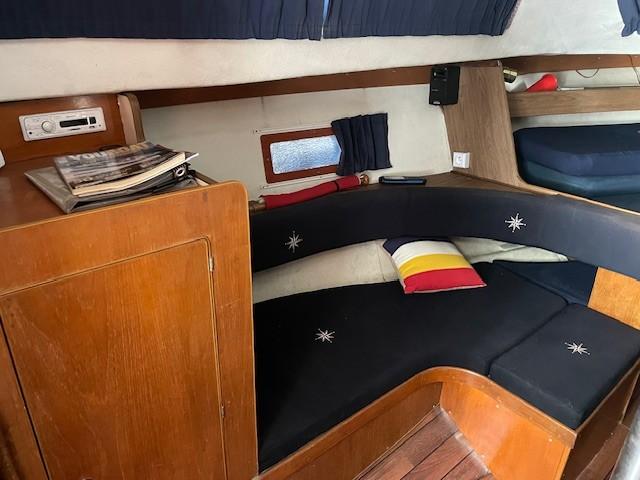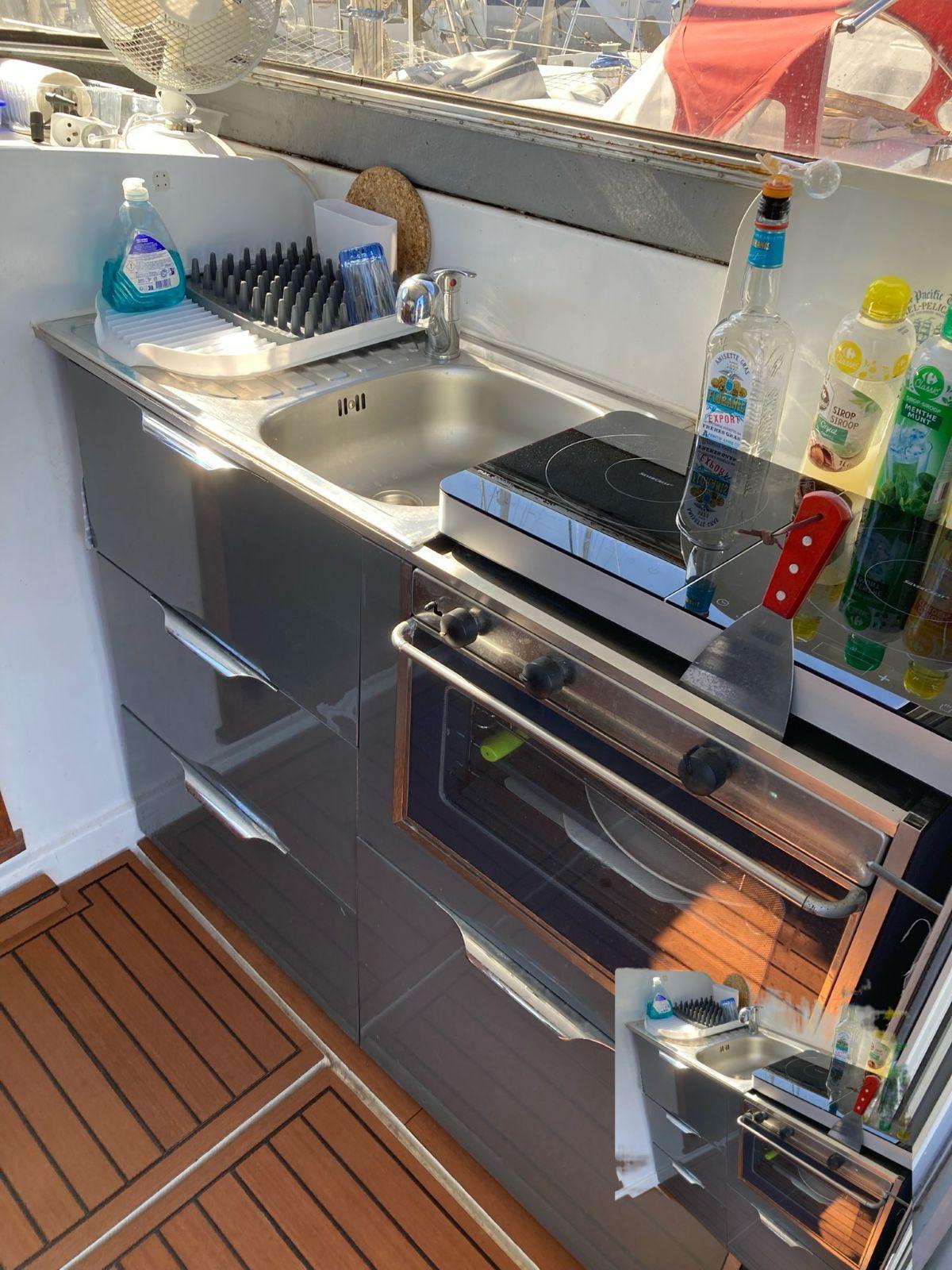 Bloc cuisine dans la Timonerie comprenant évier, réchaud 2 feux + four, rangements, Frigo trimix, eau chaude/froide sous pression, Chauffe eau 20l – Capacité eau 120l.