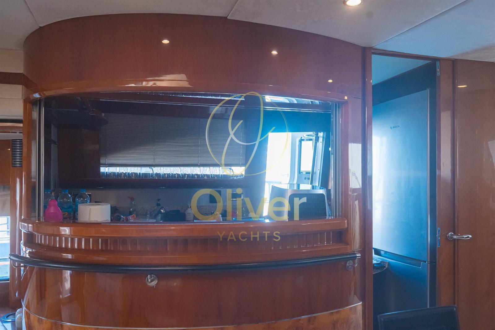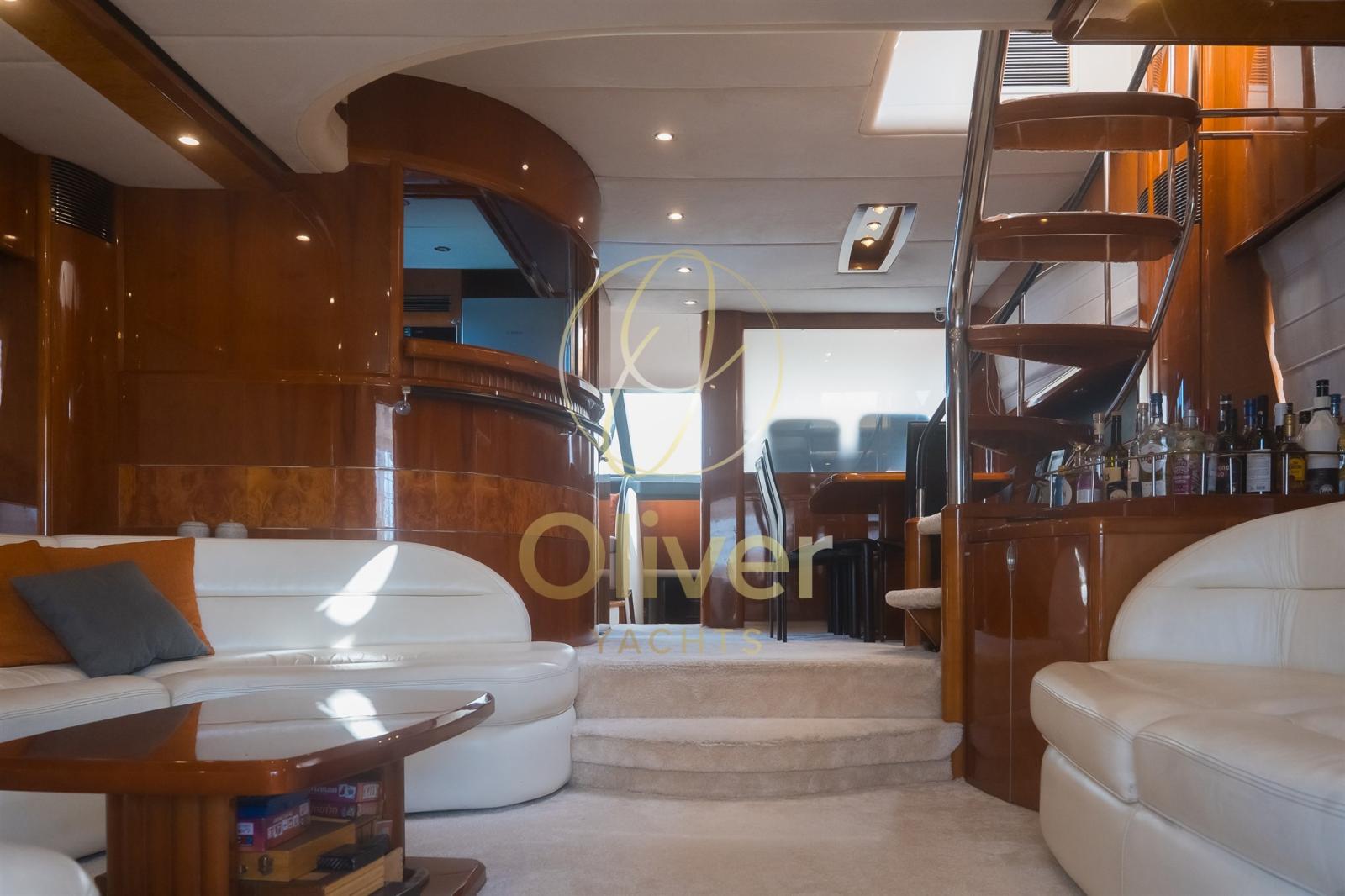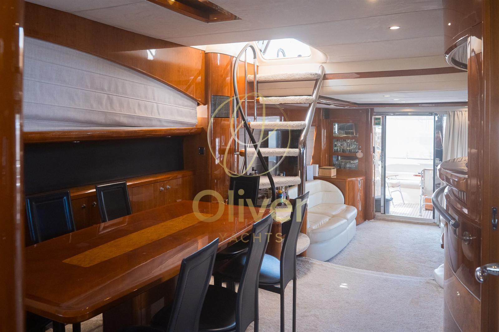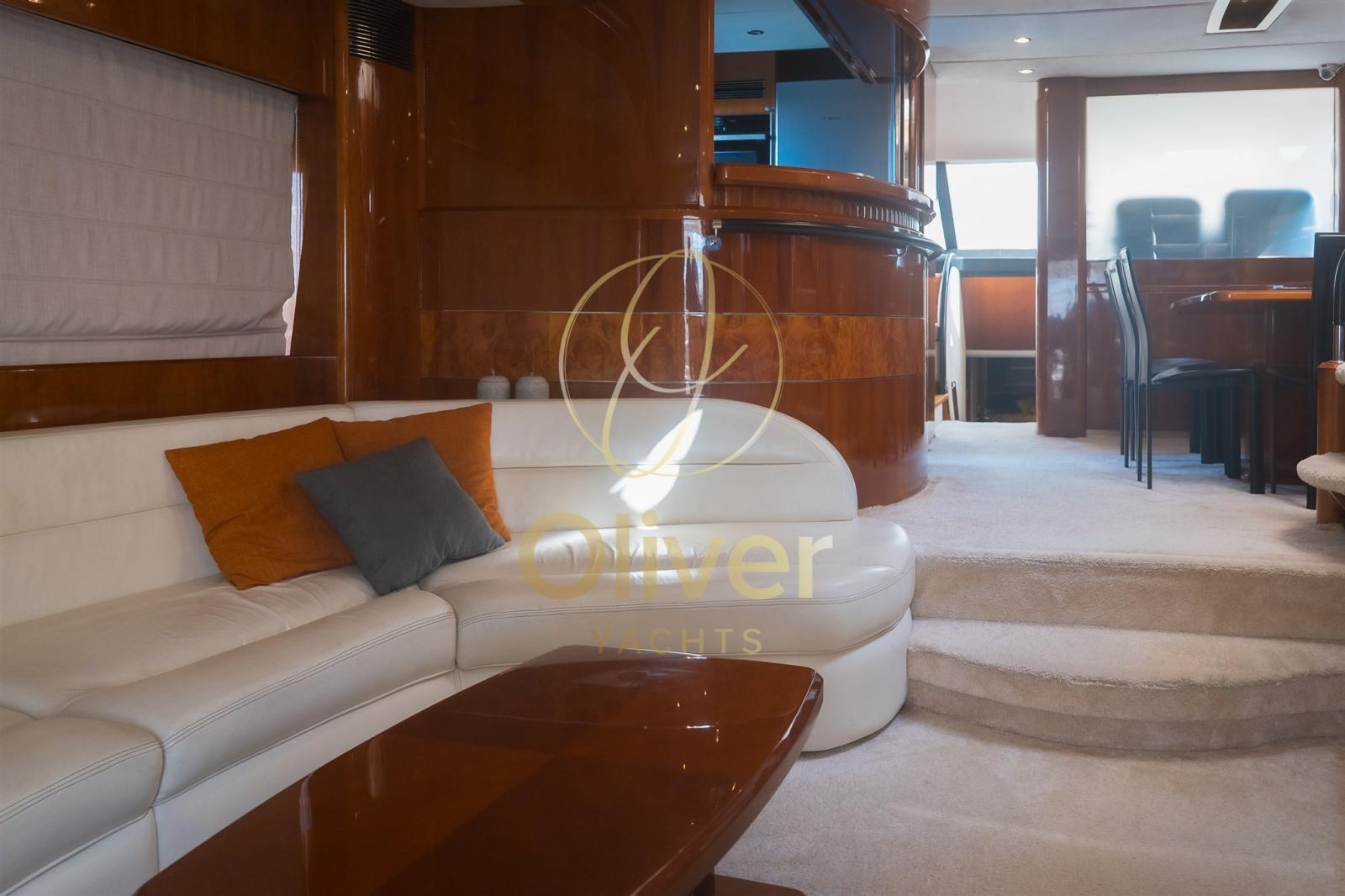 Le salon principal est grand et lumineux, avec de grandes fenêtres qui offrent une vue panoramique sur la mer. Meublé de canapés sur mesure, d’une table à manger pour 8 personnes, d’un bar dédié et d’un système de sonorisation haute-fidélité, c’est le cœur convivial du yacht. À l’arrière, la cuisine est séparée et entièrement équipée avec un nouveau lave-vaisselle, une cuisinière, un four, un réfrigérateur et beaucoup d’espace de rangement.