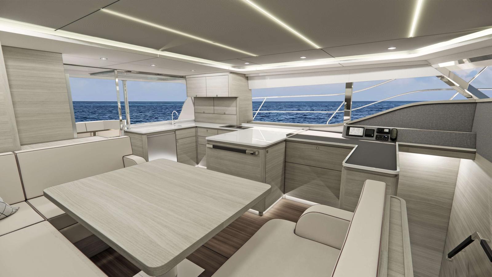 À bord, les aménagements sont à la hauteur des attentes des plaisanciers les plus exigeants. Le yacht propose jusqu’à trois cabines avec salle de bain privative, dans une atmosphère à la fois lumineuse, chaleureuse et moderne. Le salon panoramique et la cuisine ouverte favorisent la vie à bord, avec une fluidité parfaite entre les espaces.