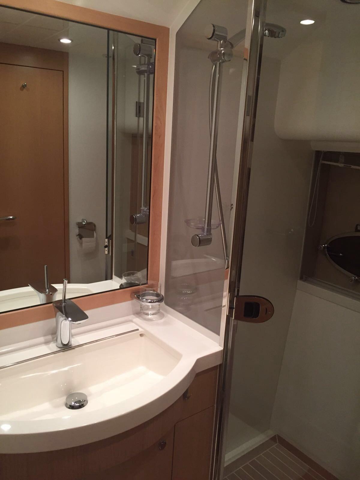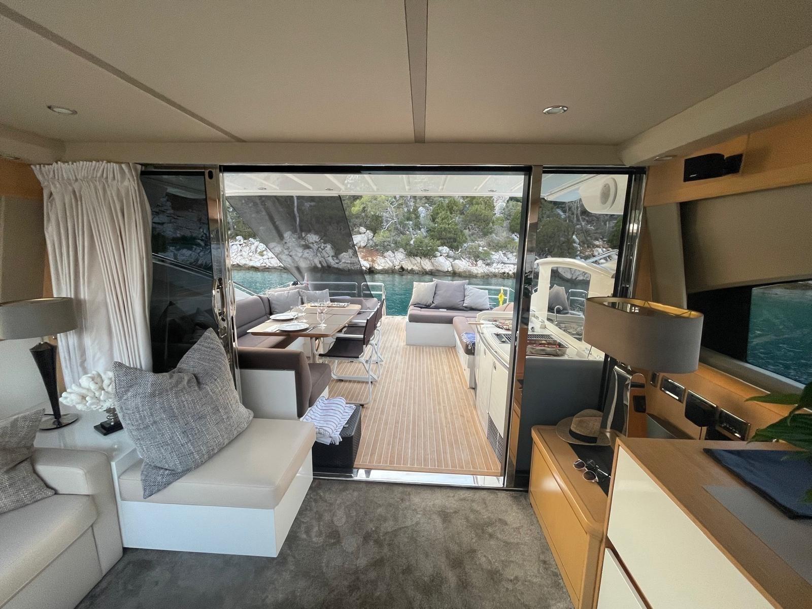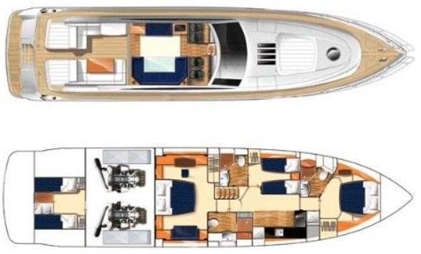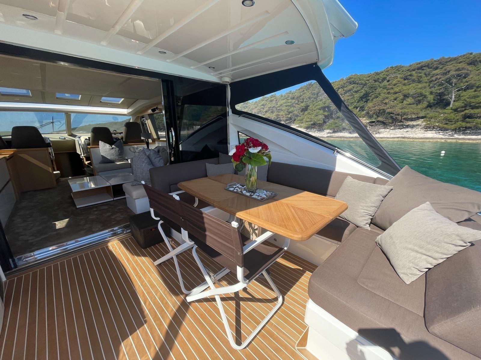 Douche de cockpit, Flaps électriques, Garage à annexe, Hard top, Extincteur(s) fixe(s), Lavabo dans le cockpit, Spots sous-marins, Passerelle, Plateforme arrière, Pont en teck, Porte latérale, Porte latérale, Cockpit en teck, Prise de quai, Guindeau électrique, Echelle de bain, table de cockpit, Corne, Winch électrique arrière, Winch électrique avant.