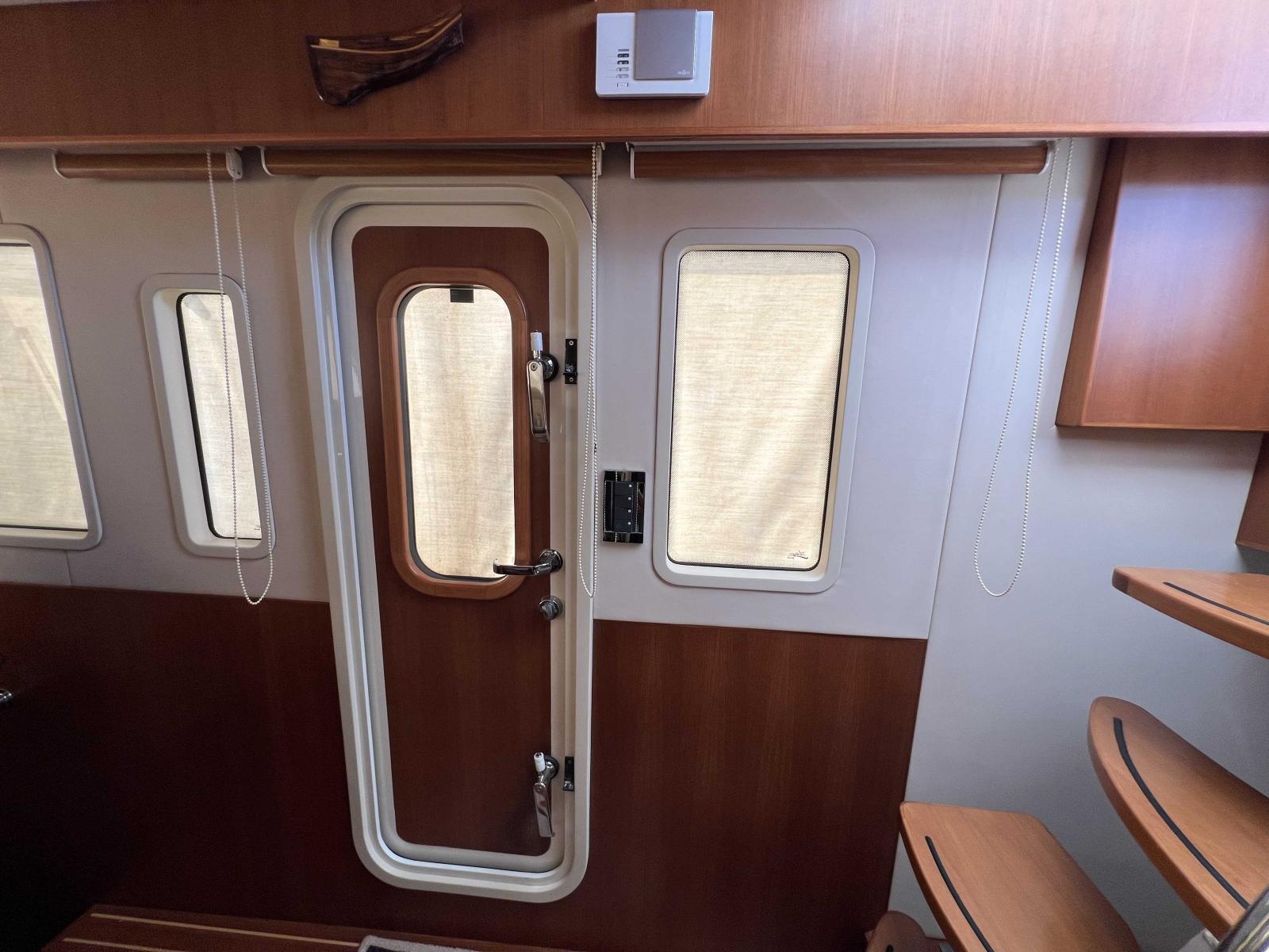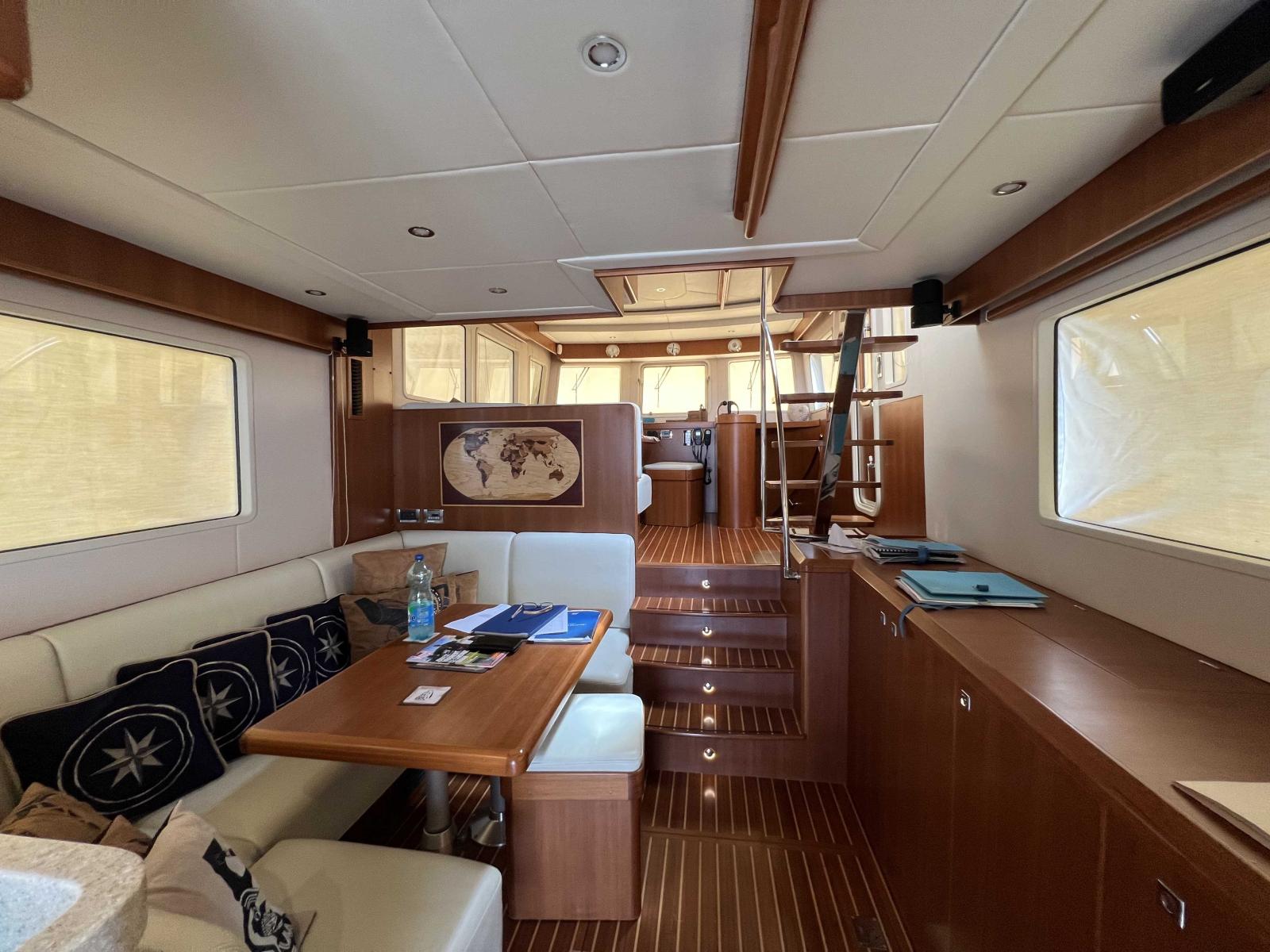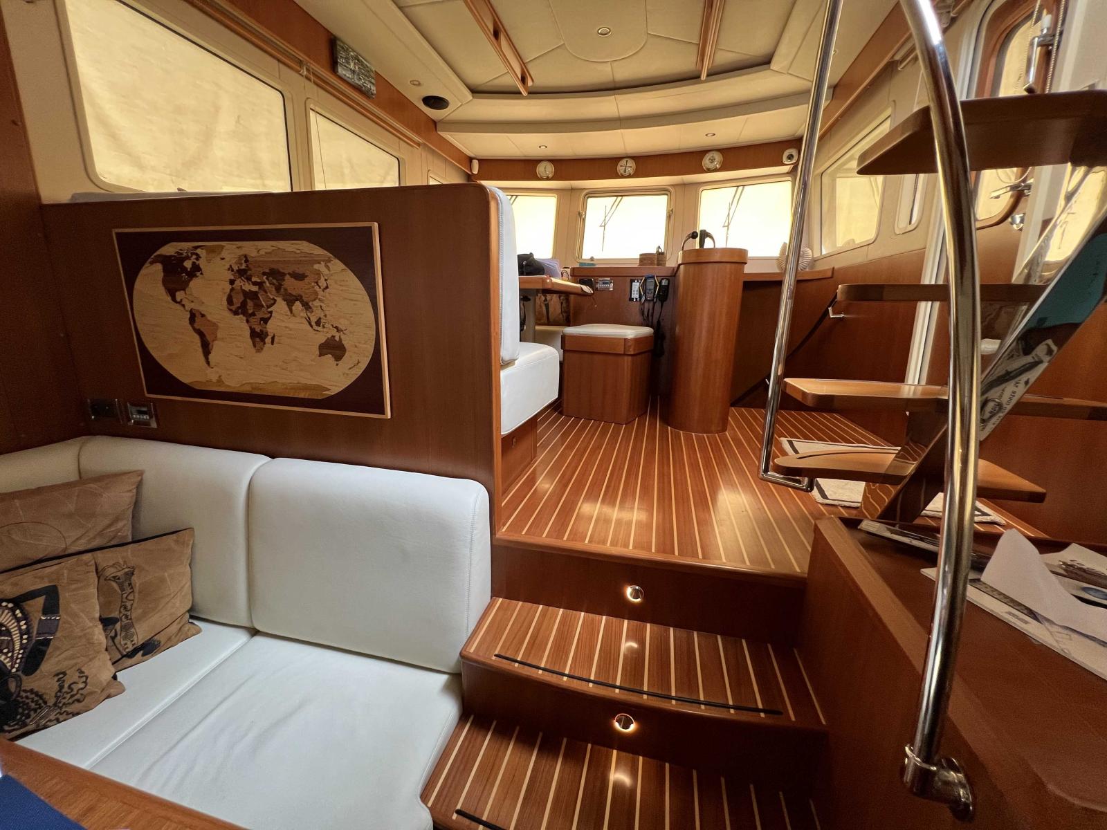 Sa timonerie intérieure spacieuse, baignée de lumière, prolonge vos navigations, par tous les temps. Les aménagements sont pensés pour vivre à bord, longtemps, avec sobriété et raffinement.