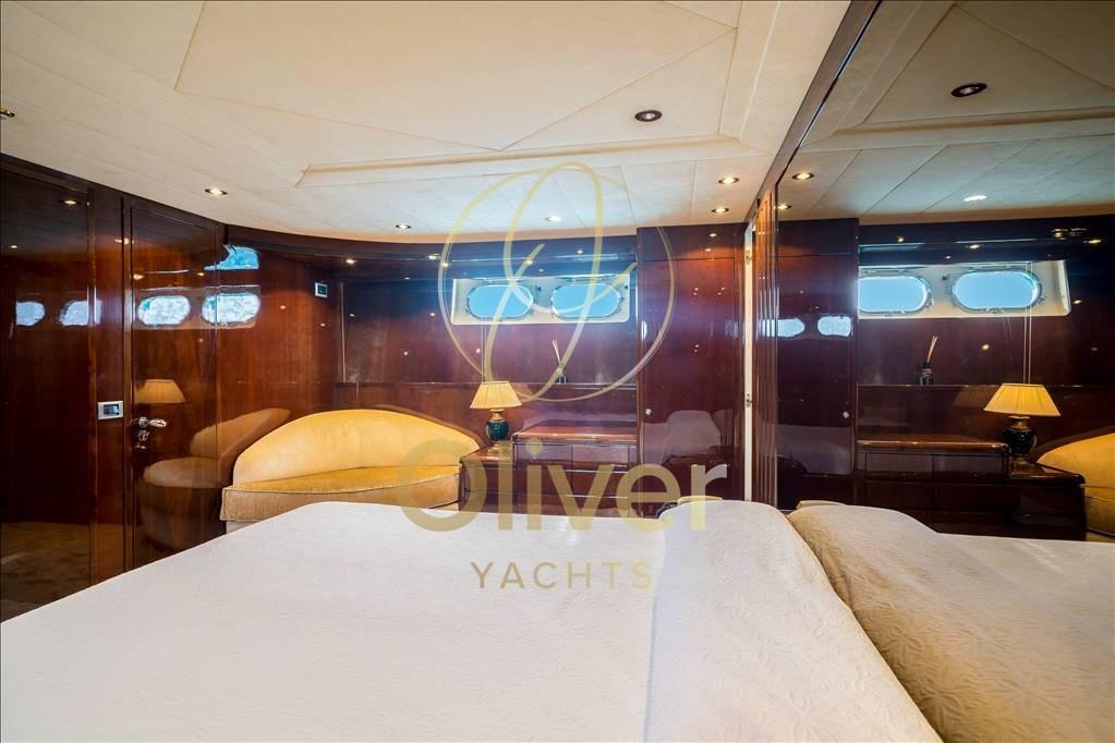 Alarme gaz, Alarme moteur, Alarme de pompe de cale, Eau sous pression, 10 Batteries, Système de vidange, Passavant en teck, Douche de cockpit, Double barre à roue, Phares fixes arrière, Phare de poursuite, Flaps hydrauliques, Bossoirs pour annexe, Grue de flybridge, Hard top, Extincteur(s) fixe(s), Indicateurs de flaps, Lavabo dans le cockpit, Éclairage de courtoisie, Jet-ski, Passerelle (poppiera Besenzoni), Plateforme arrière, Pompe de cale automatique, Pompe de cale manuelle, Porte latérale, Porte latérale, Cockpit en teck, Prise de quai, Connexion eau sous pression à quai, Guindeau Hydraulique, Selles pour Annexe, Stabilisateurs (Zero speed), table de cockpit, Annexe, Filières avec sortie latèrale, Corne, T-Top, Winch électrique arrière, Winch électrique avant.