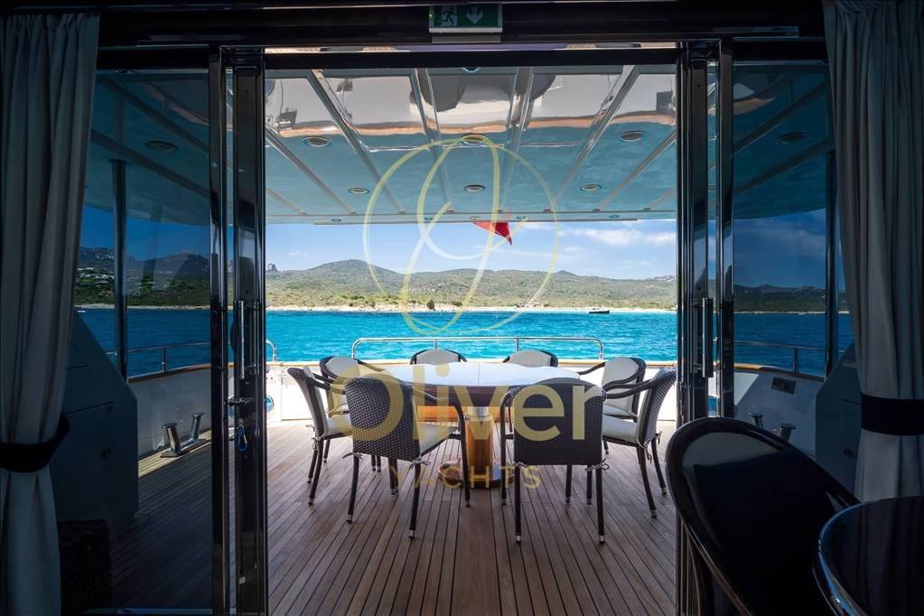 En entrant dans le salon principal immédiatement à tribord, nous trouvons l’escalier d’accès à la salle des machines centrale et aux deux cabines d’invités arrière. Dans le salon, il y a une petite table basse avec un clavier électronique intégré à la console. Vers la proue, il y a deux canapés avec des tables et des fauteuils et une grande télévision. Vers la proue en passant par le couloir sur la gauche, il y a l’escalier pour monter d’abord au pont puis au flybridge, tandis qu’en allant plus loin il y a la salle à manger avec une table confortable pour 10 personnes et l’escalier pour accéder au pont inférieur où se trouvent la cabine principale et la cabine VIP. De ce salon, on accède à la grande cuisine et les cabines de l’équipage sont situées à l’avant.