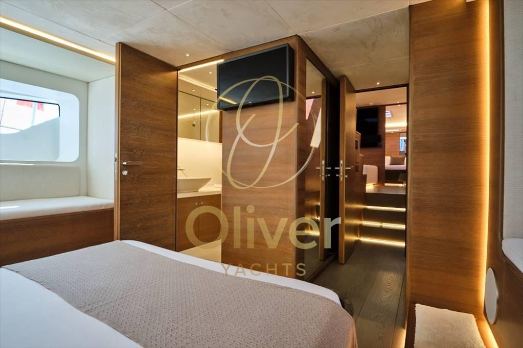 À l’intérieur, le PJ 63 Sport est un exemple de la sophistication et du design impeccable typiques des bateaux Palmer Johnson. Chaque détail a été soigné avec une grande attention pour créer un espace accueillant et luxueux. Une fois à l’intérieur, vous êtes accueillis par un environnement élégant et spacieux. Les murs sont recouverts de bois précieux avec du bois à l’horizontale, tandis que les sols sont en parquet tendant vers le gris, ce qui ajoute du raffinement à l’environnement. Les meubles sont fabri