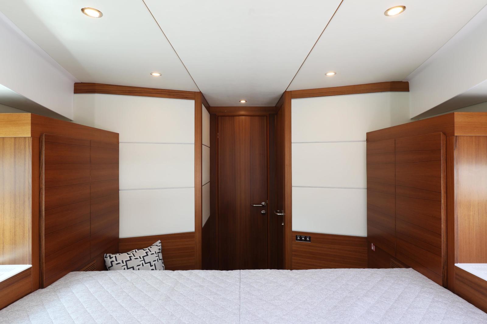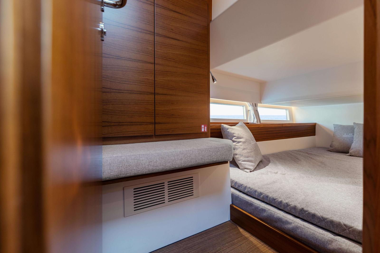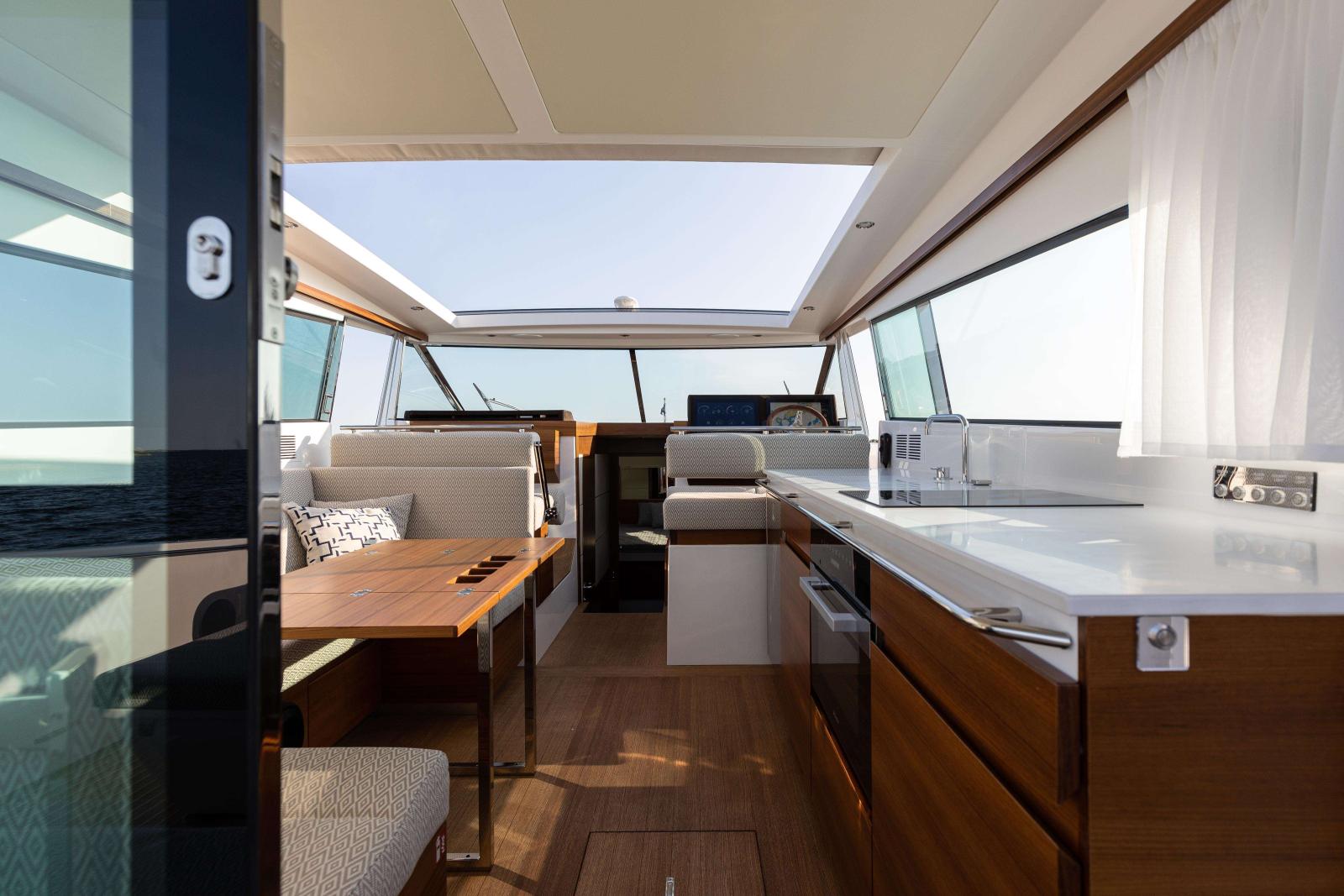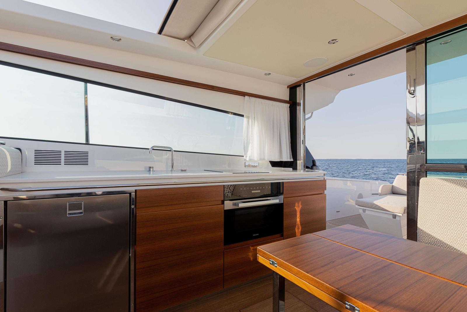 Equipements de série : toit ouvrant électrique, cuisine équipée avec plan de travail CORIAN, réfrigérateur, four, pont complet en FLEXITECK, electricité complète MASTERVOLTS, systeme CZONE, chargeur de batteries, propulseur d'étrave/ Standard equipment: electric sunroof, fitted kitchen with CORIAN worktop, refrigerator, oven, full FLEXITECK deck, full MASTERVOLTS electricity, CZONE system, battery charger, bow thruster.