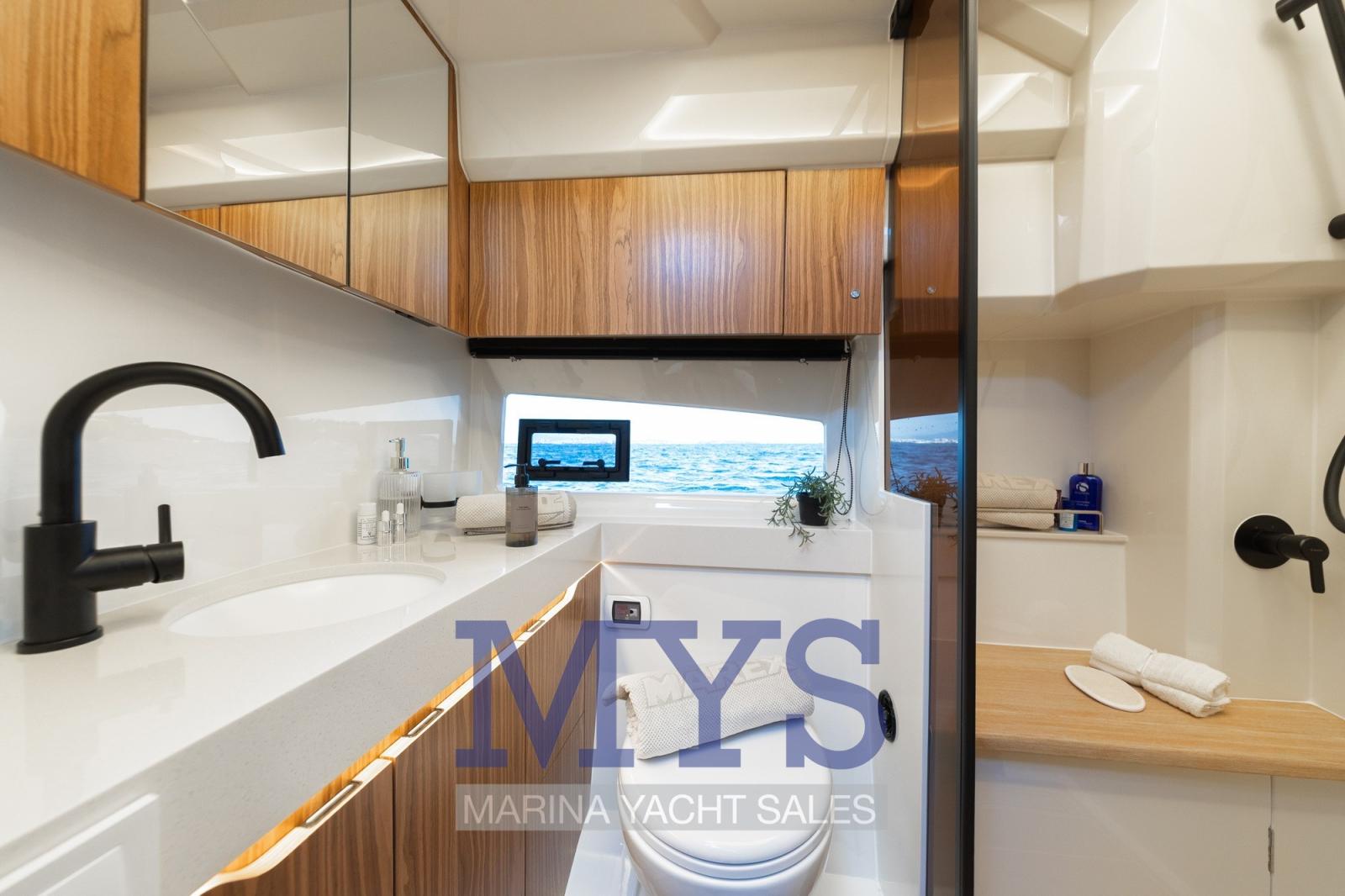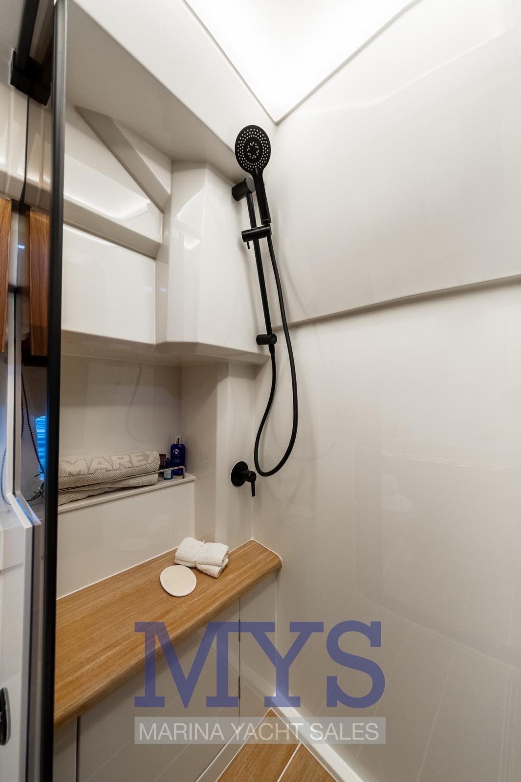 Salle de bain avec WC électrique et cabine de douche séparée
